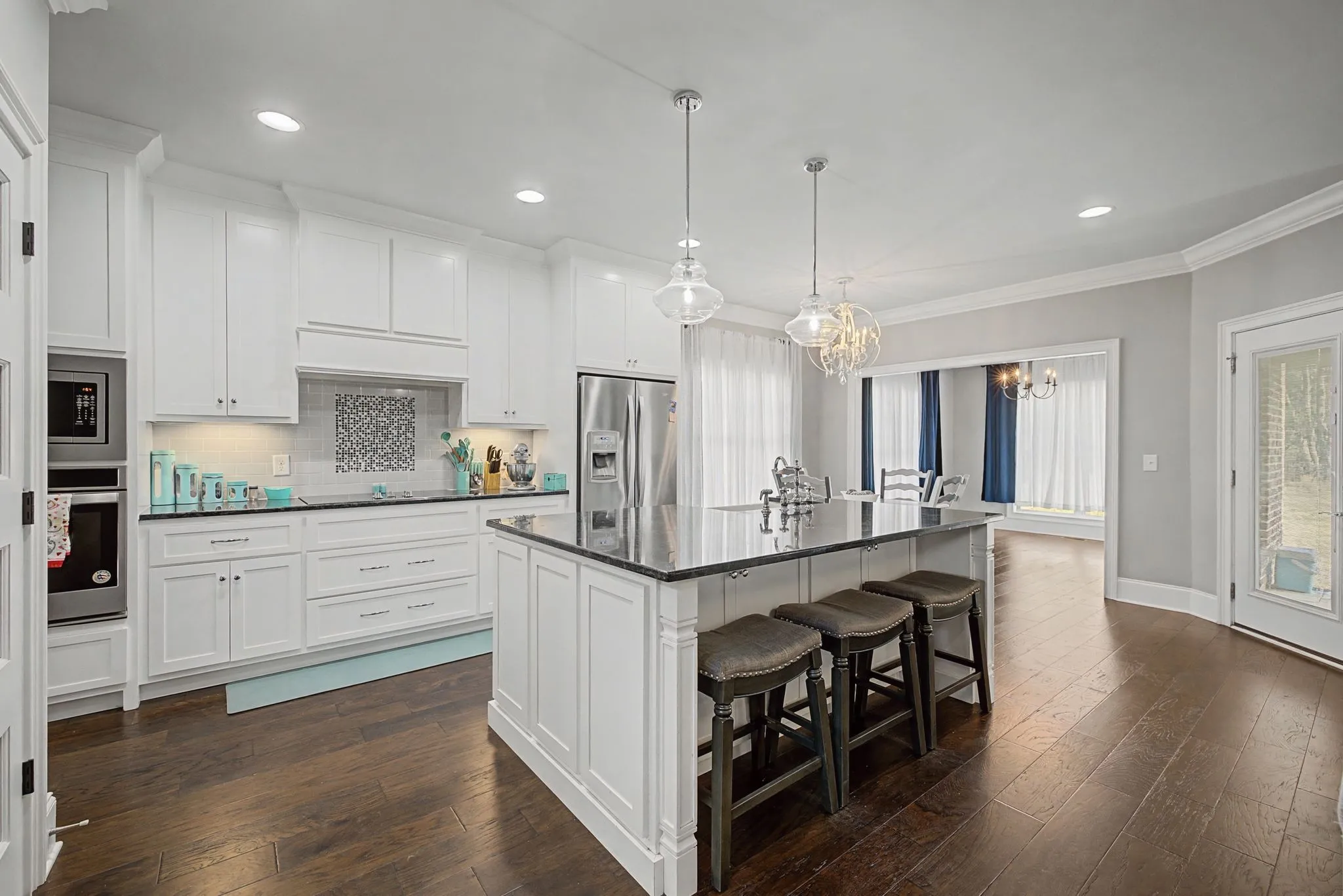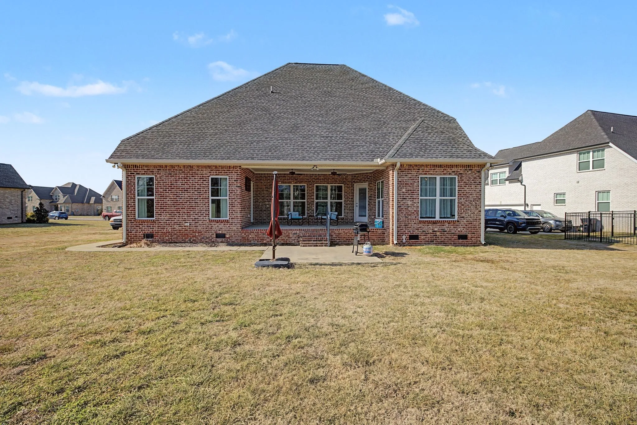 The gourmet kitchen boasts granite and quartz countertops, ideal for both daily living and hosting gatherings. Step outside to enjoy both front and back covered porches overlooking a large yard — perfect for relaxing evenings or family fun.