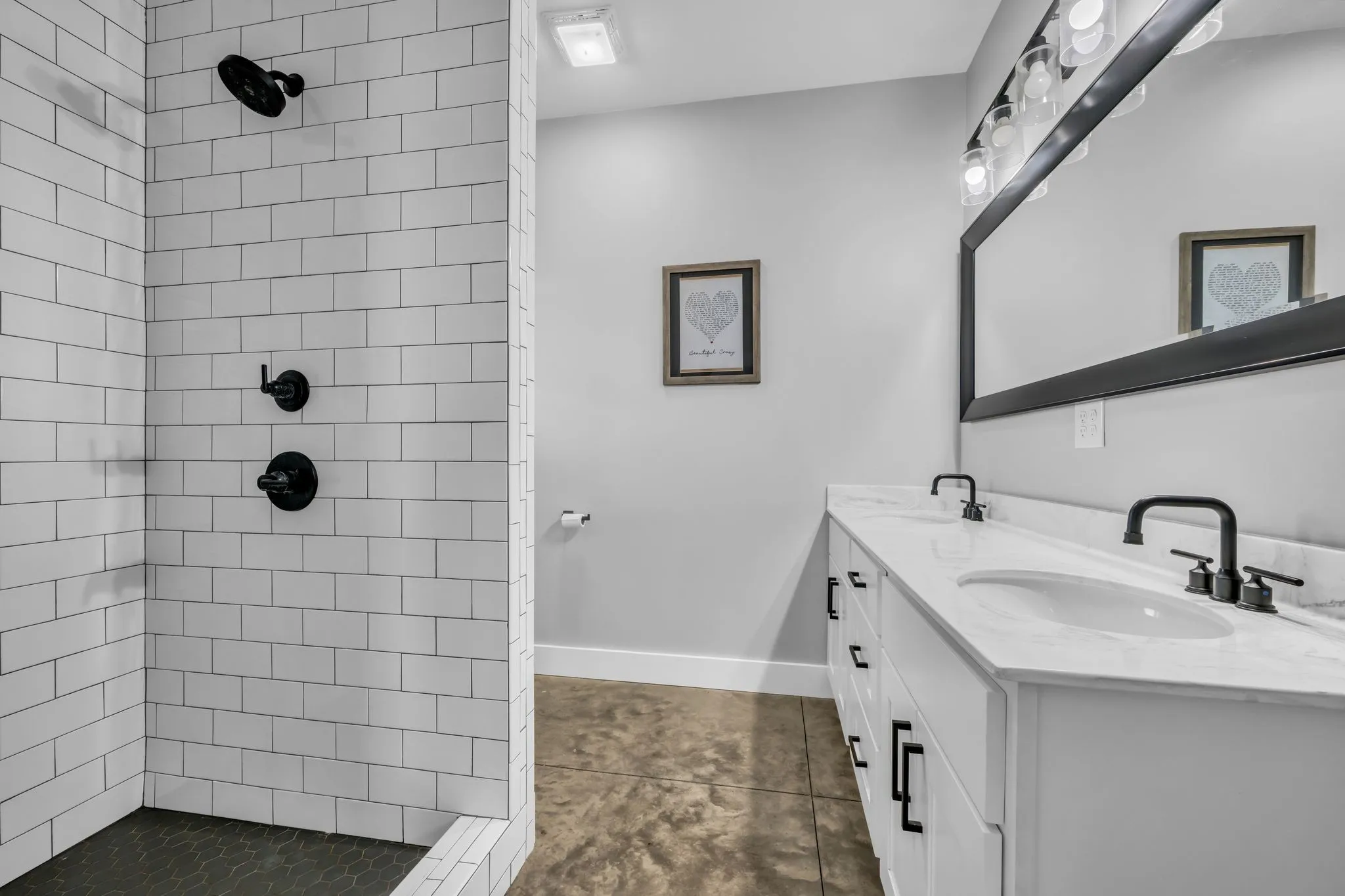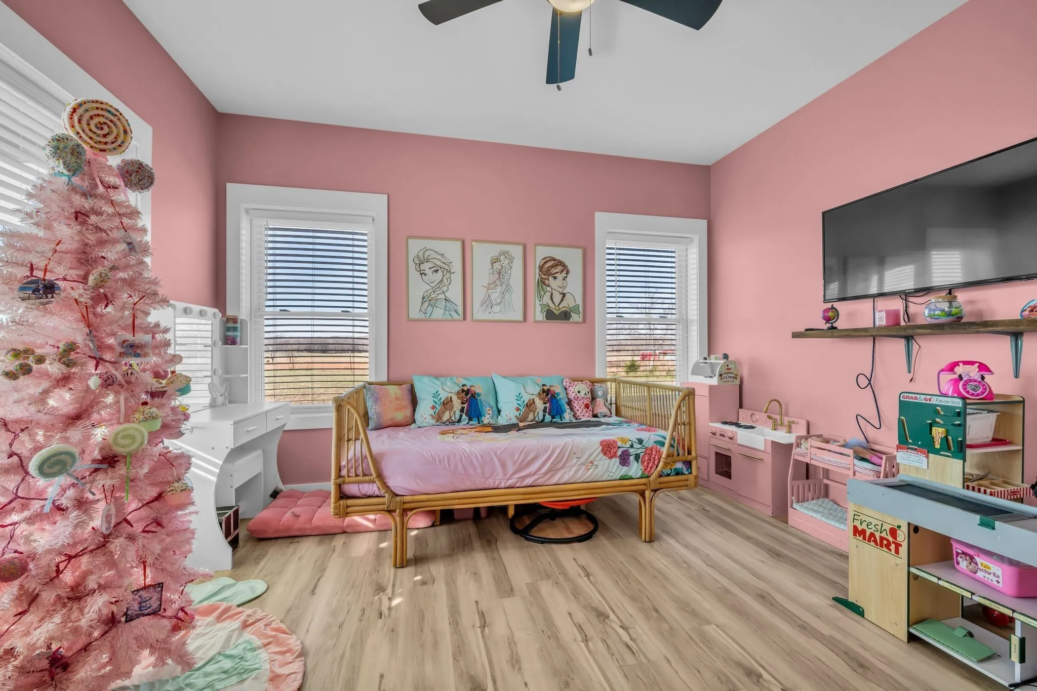 The primary suite is a private retreat with a custom walk-in closet and spa-like bath featuring cultured marble finishes, double vanities, and a tiled walk-in shower with dual shower heads and a center rain shower. Upgrades include 3’ solid wood doors, LVP flooring, TV wall mounts throughout, and energy-efficient double-hung argon gas–filled windows.