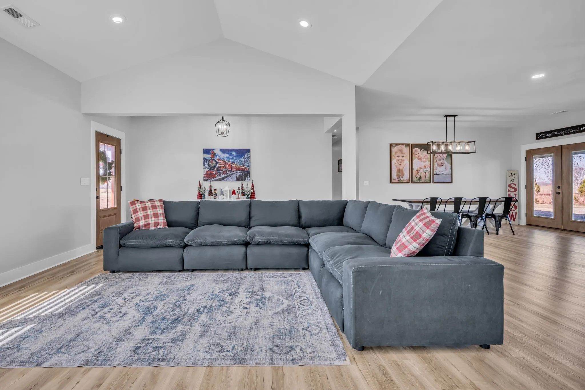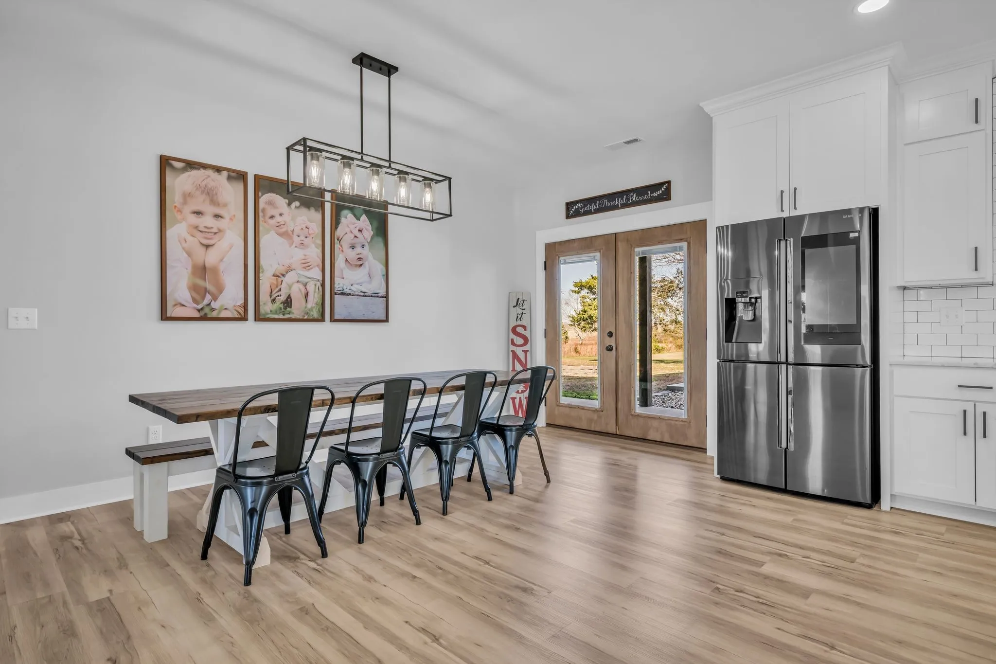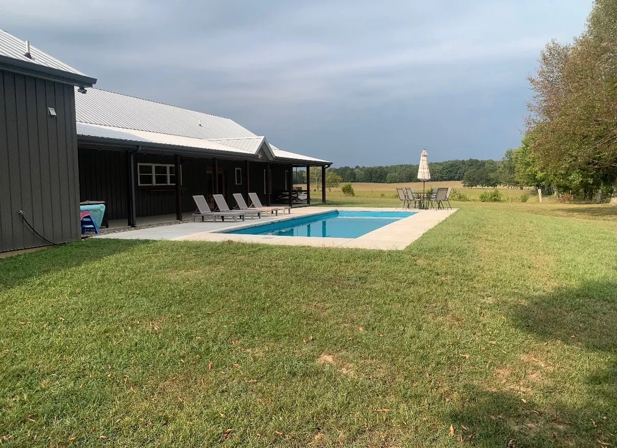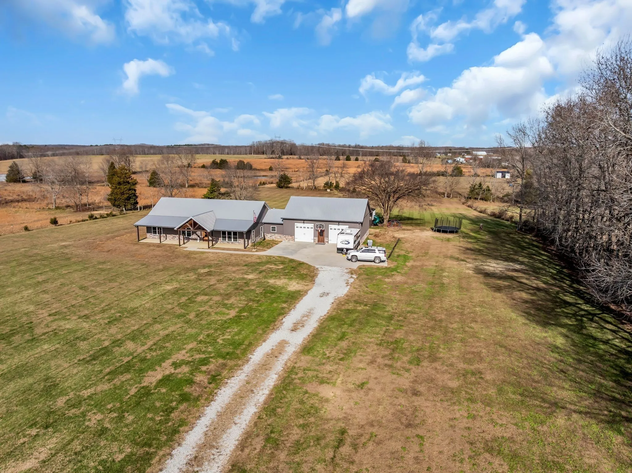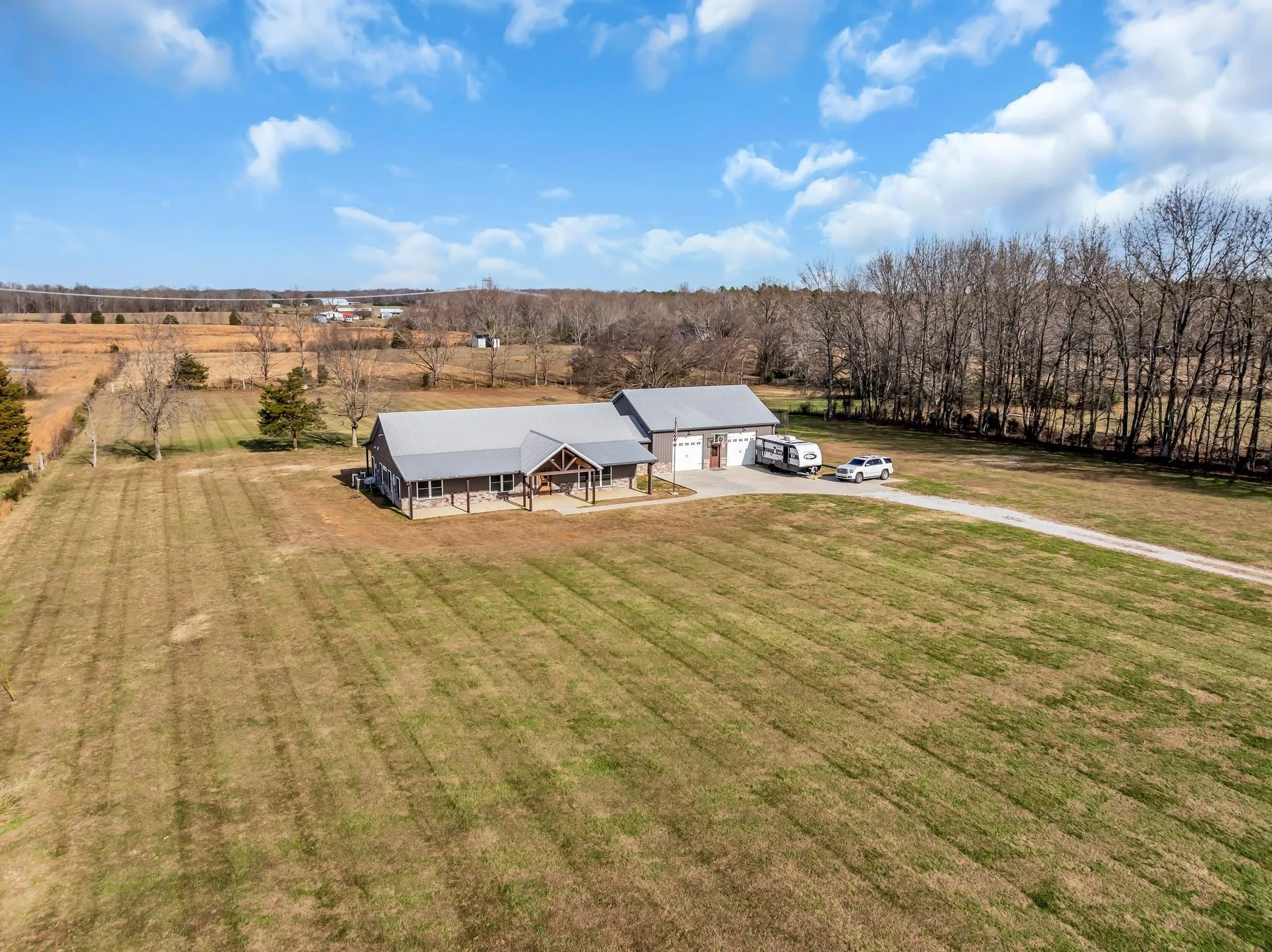 Luxury meets functionality on 5 acres in this exceptional 3 Bedroom barndominium-style home featuring metal siding with rock accents and covered front and rear porches. Open-concept living showcases a gas rock fireplace and custom built-in cabinetry throughout. The custom kitchen offers an oversized bar, Quartzite countertops, soft-close cabinetry, smart appliances, and a hidden walk-in pantry.