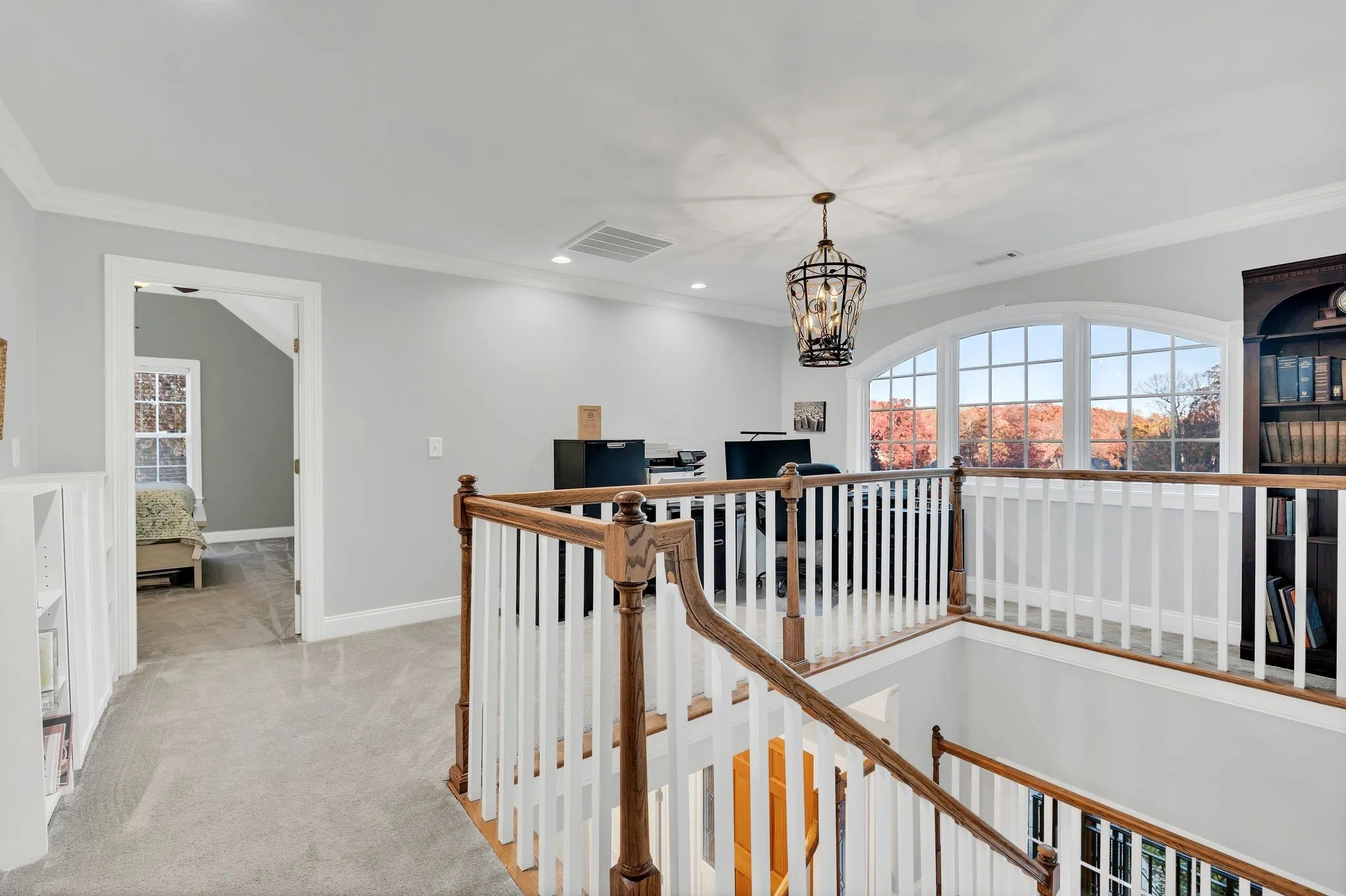 Nestled on a spacious lot in a charming, secluded subdivision on the edge of town, McCormick Grove offers peaceful living surrounded by mature oaks. These trees frame serene views of nearly an acre from the expansive back deck, perfect for relaxation or a large gathering. A welcoming covered front porch leads into the foyer and opens to a generously sized living room featuring a double-sided gas fireplace. On the opposite side, a cozy gathering room seamlessly flows into the kitchen and a large dining area, which boasts panoramic views of the backyard—where you might even spot deer foraging for acorns.