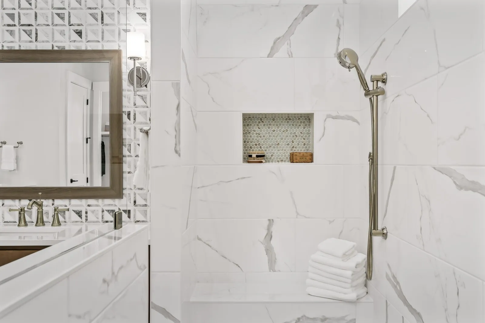 The luxurious primary retreat is designed for comfort and sophistication, featuring dual walk-in closets, split vanities with a linen closet, and an oversized spa-style shower. A light-filled main-level guest suite with private bath provides ideal accommodations for visitors seeking stair-free access.