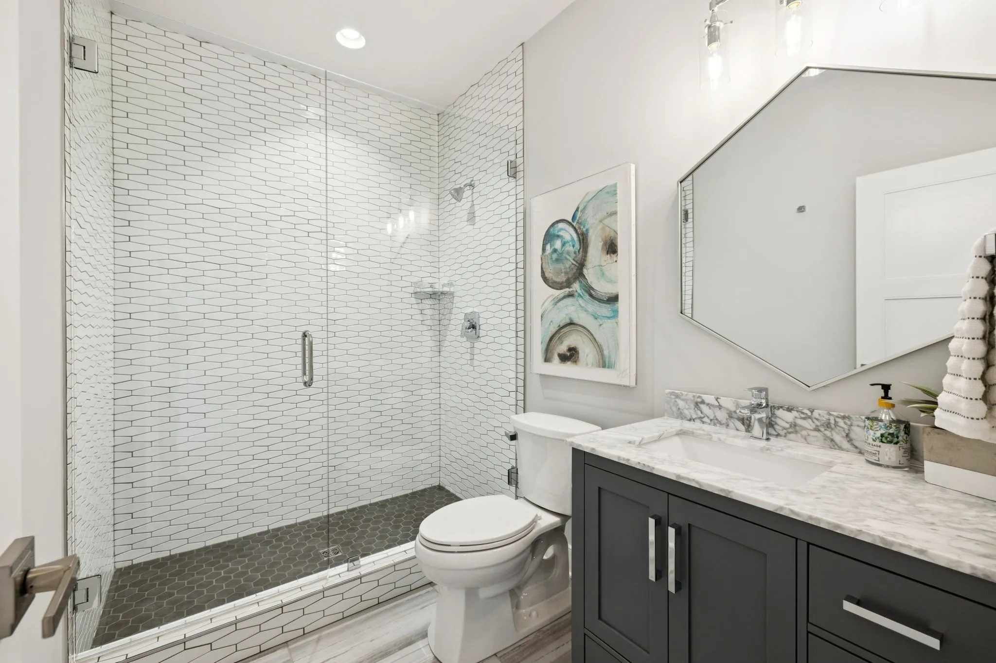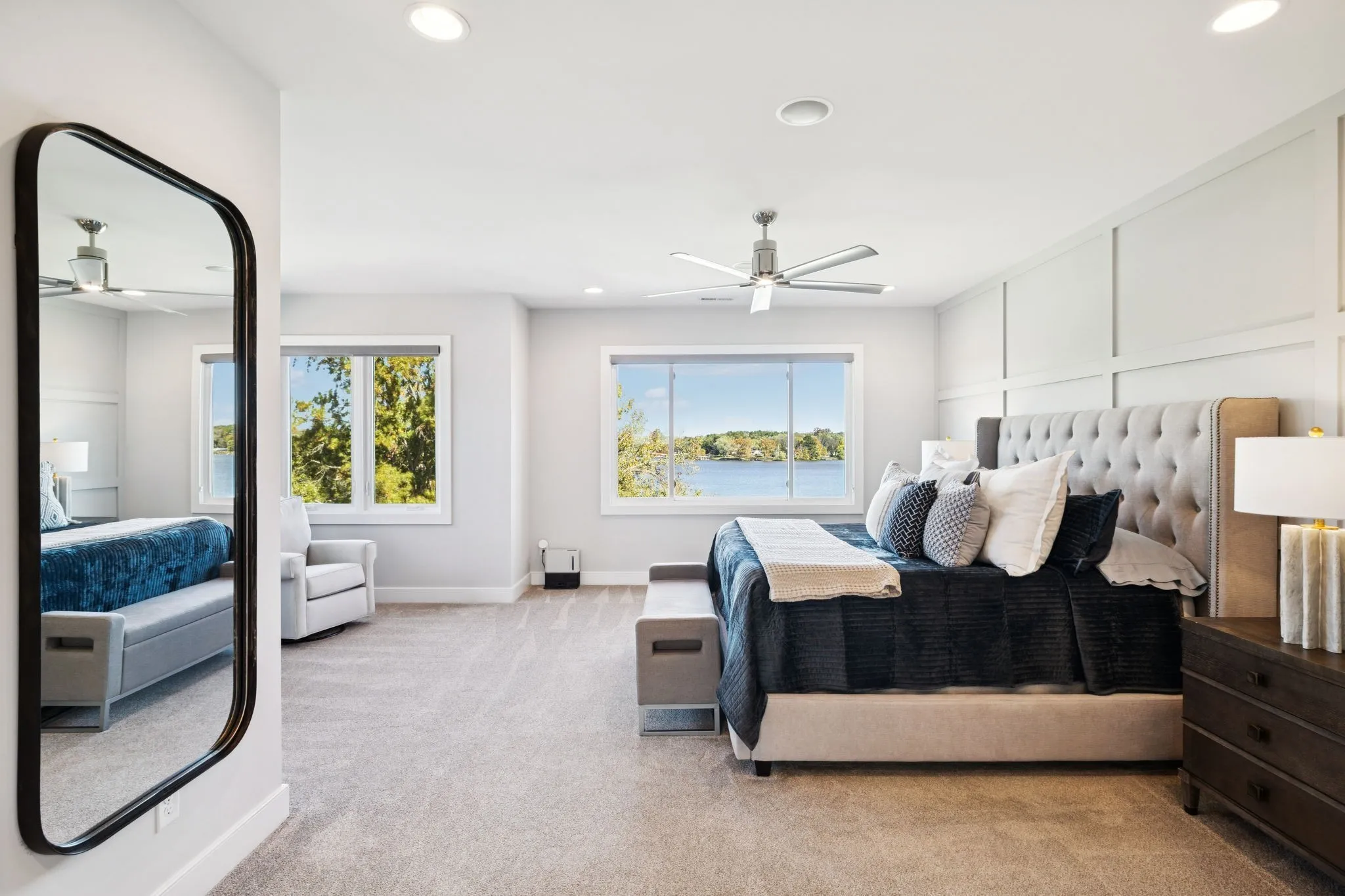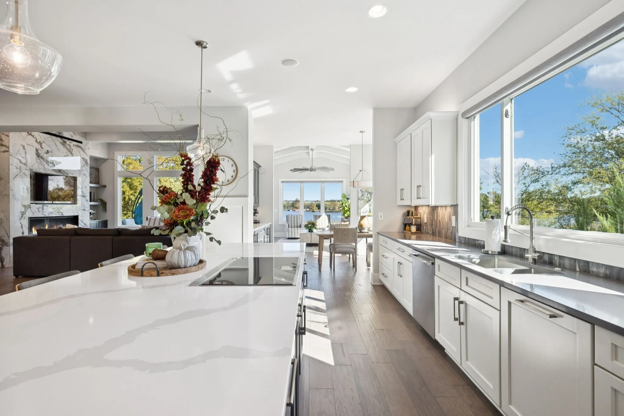 Inside, designer finishes elevate every space. The show-stopping kitchen features quartz countertops, premium Thermador appliances, and double ovens, seamlessly connecting to the main living area where a marble fireplace and panoramic lake views create a stunning focal point. The primary suite is a private retreat with a spa-inspired bath complete with a soaking tub, glass-enclosed shower, and dual vanities.