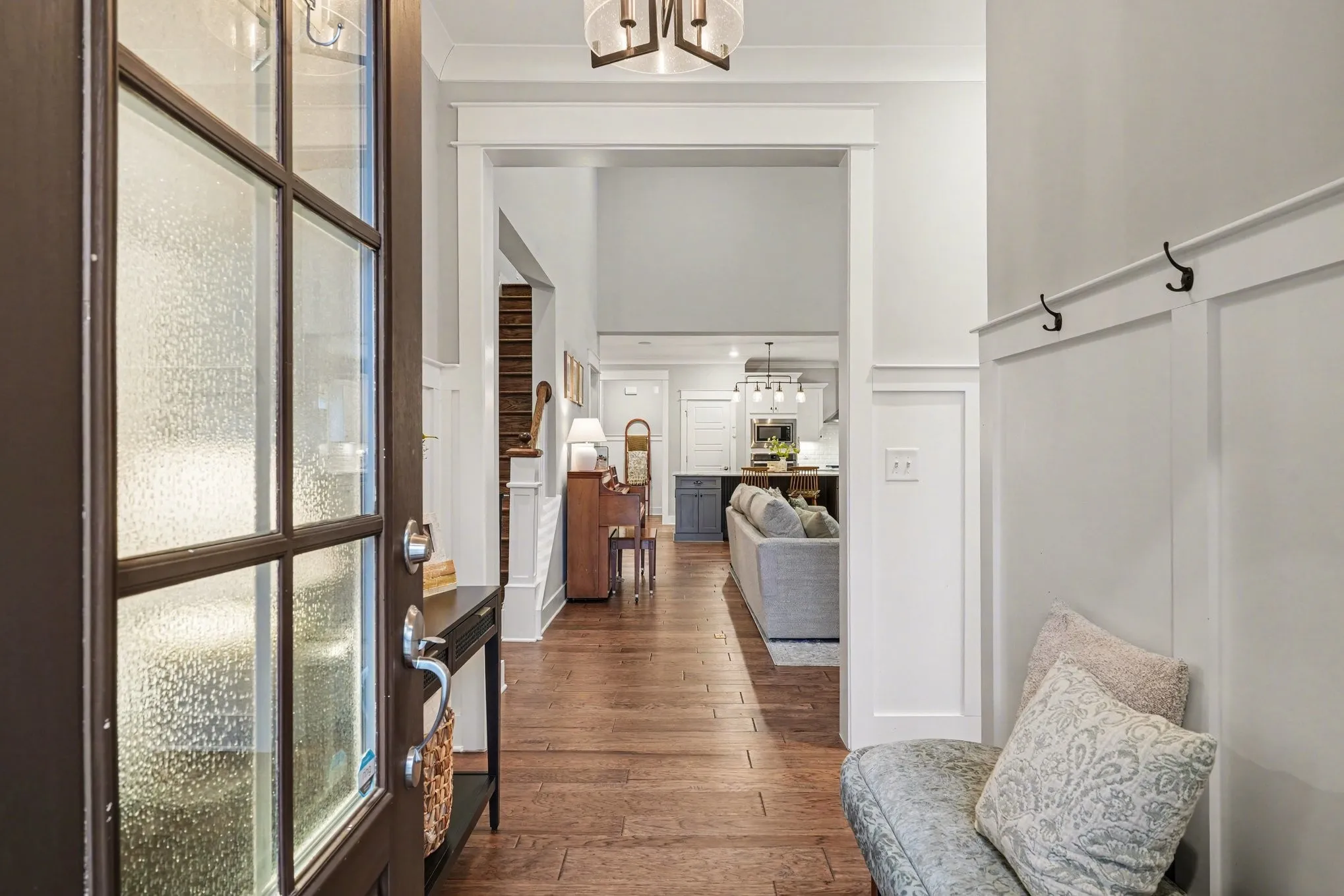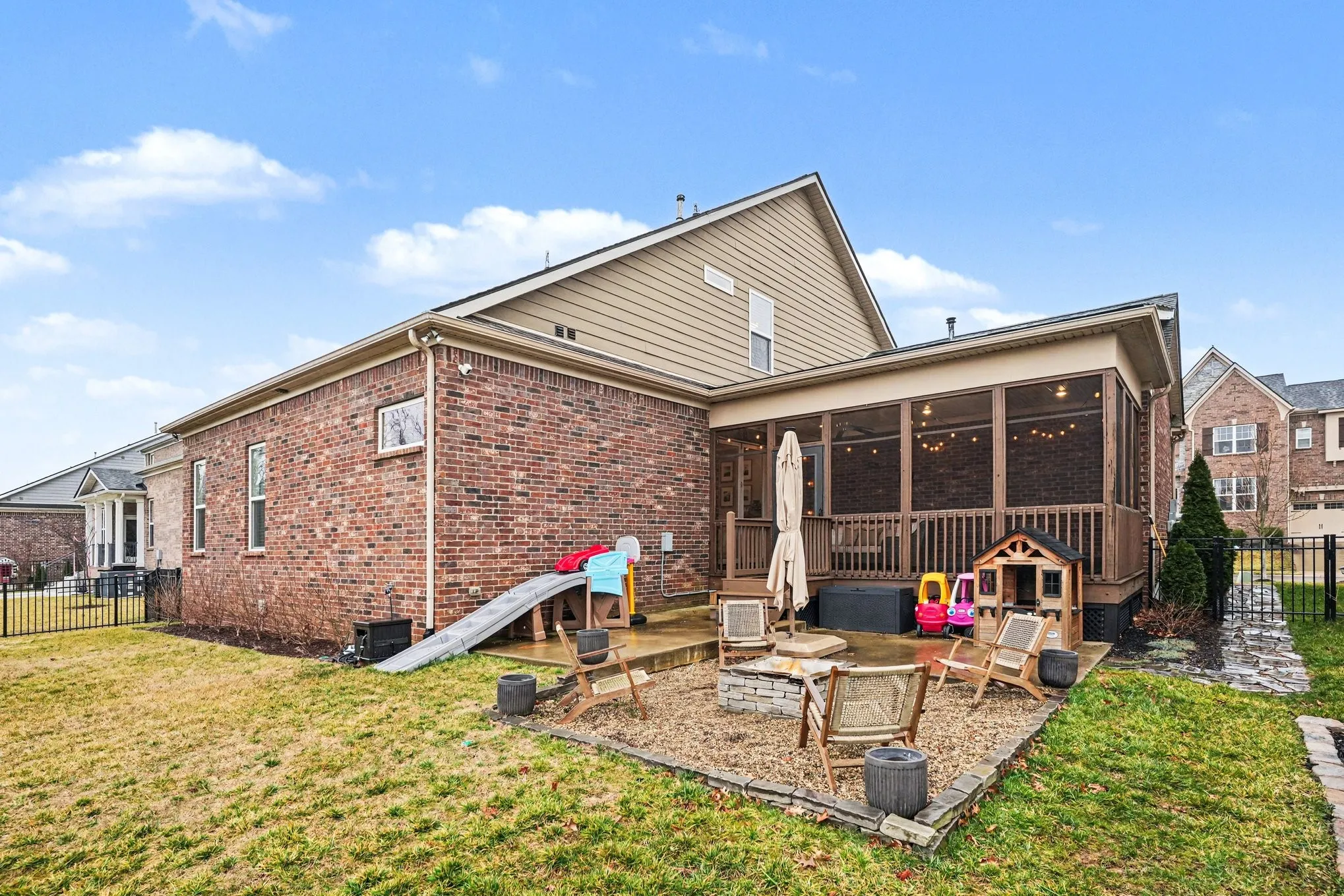 Three bedrooms located on the main floor, everyone stays connected while still enjoying their own space. Upstairs, a private bedroom, full bath, large bonus room and walk in storage -perfect for a teen retreat, guest suite, playroom or home office. Designed for indoor outdoor living, the accordion doors open to the fully screened porch and extend your living space. Large private backyard is fenced in. Thoughtful details include built in speakers, stylish wood accent walls in the bedrooms, a drop zone and a beautifully finished tiled laundry room with cabinetry.This home blends high end finishes with practical design, creating a warm, open and airy space that truly lives beautifully.