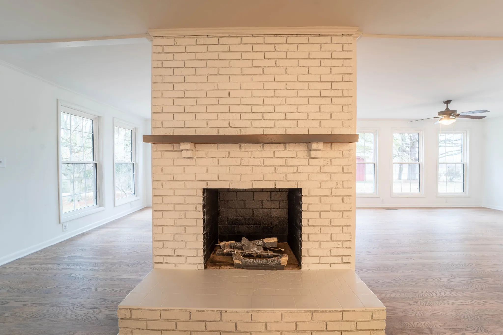 Original hardwood floors add warmth and authenticity, and large windows frame breathtaking views of rolling land surrounded by mature trees. The kitchen provides a functional layout with electric cooktop, oven, and refrigerator included.