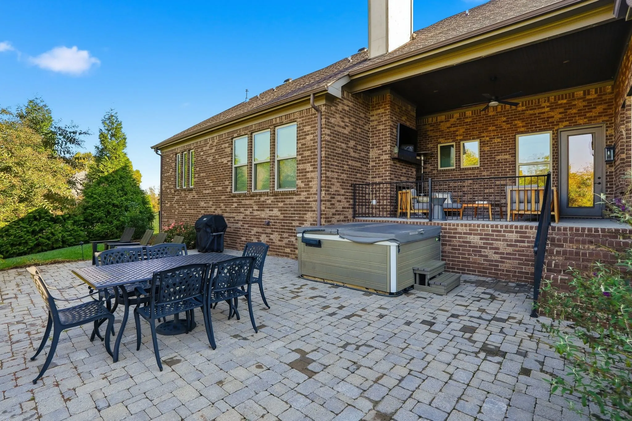 Step into this elegant all-brick home in Weatherford Estates. The rolling green hills and established trees and grass make this home very stately. As you enter the home the office to the right hand side has a polished feel to it with floor to ceiling bookshelves that will remain with the home. The expansive dining room to the left connects to the butler pantry flowing into the chef’s kitchen with granite countertops and stainless steel Kitchen Aide appliances. The eat-kitchen opens to the vaulted ceiling in the great room featuring wood beams, gas fireplace with stone reaching to the ceiling. The family room and kitchen look out to a covered porch with another fireplace and lower patio. The large backyard is fully fenced with mature trees. The main level includes a spacious and chic primary suite with garden tub and large walk in shower and closet. Also included is the laundry room near the primary suite. A guest suite is conveniently located on the main level for easy access. Upstairs boasts two other generously sized bedroom ensuites with walk-in closets. The bonus room has a kitchenette with sink, microwave and countertop and also has a sizable hobby room with a half bath. This home has a three-car garage and a built in storm shelter that can withstand a EF-5 tornado. It also includes a security system, irrigation system, Tesla Charger (240 volt), whole home surge protection and the upscale hot-tub! The home has a brand new roof and carpeting as of January 2026. Another added bonus is the home has high speed fiber internet. Don’t miss this opportunity to live in Franklin near shopping and restaurants on over an acre!