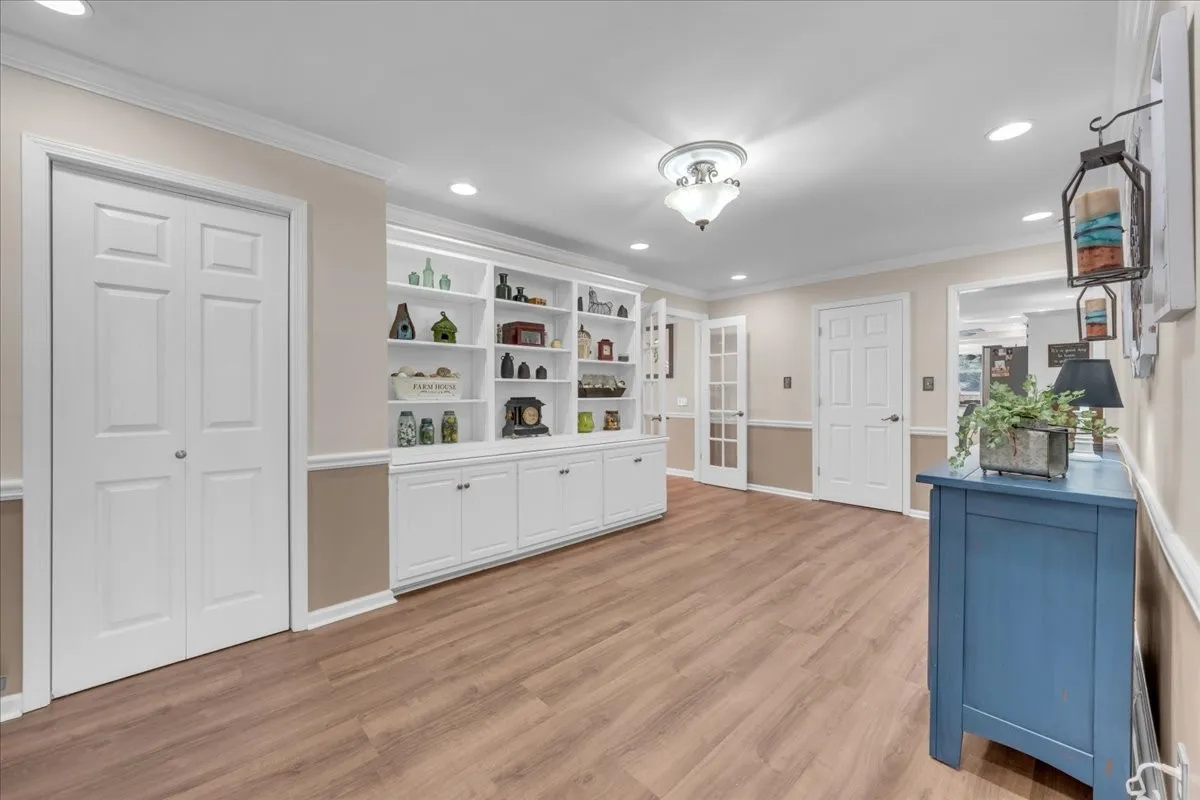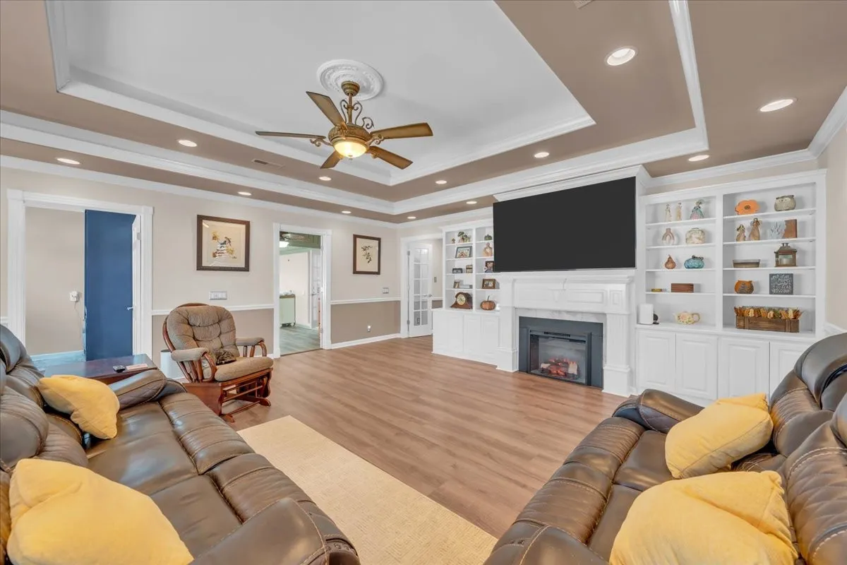 Inside, you’ll find a thoughtfully designed floor plan featuring a formal dining room, dedicated office, spacious living room, and an enclosed sunroom that provides additional space for relaxing or hosting guests. The large main living area showcases trey ceilings, custom built-ins, an electric fireplace, and sliding glass doors that open directly onto the pool patio for seamless indoor-outdoor living.