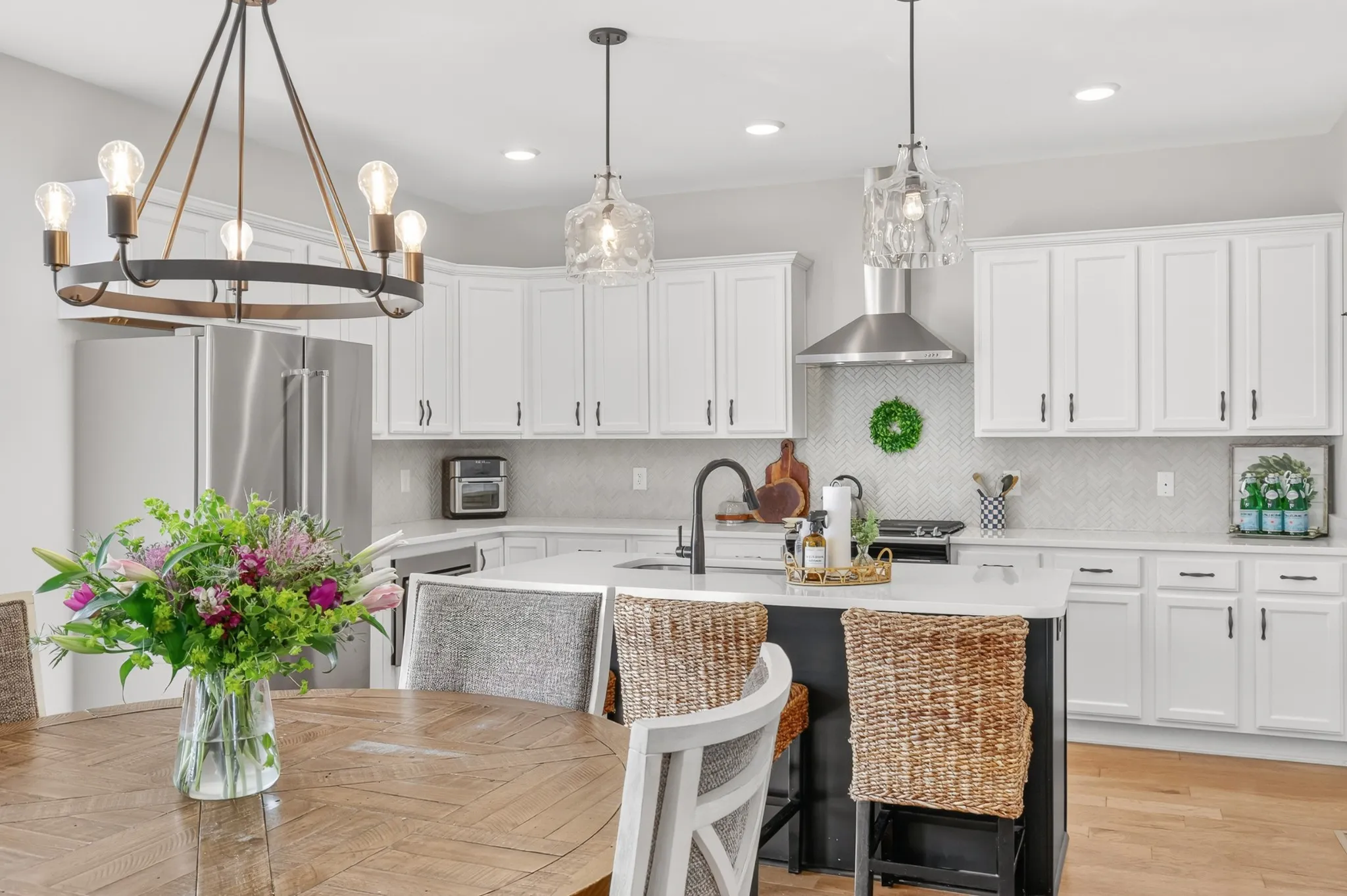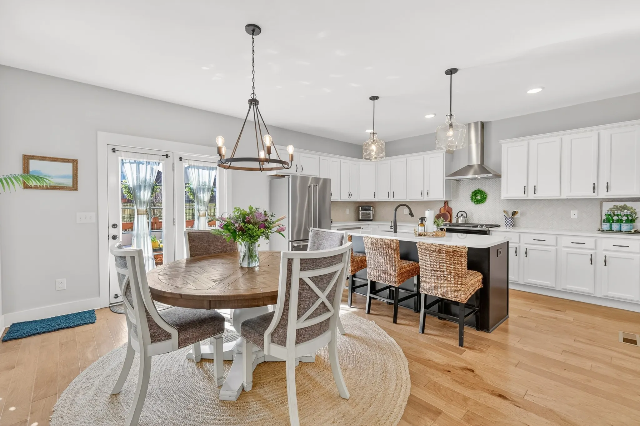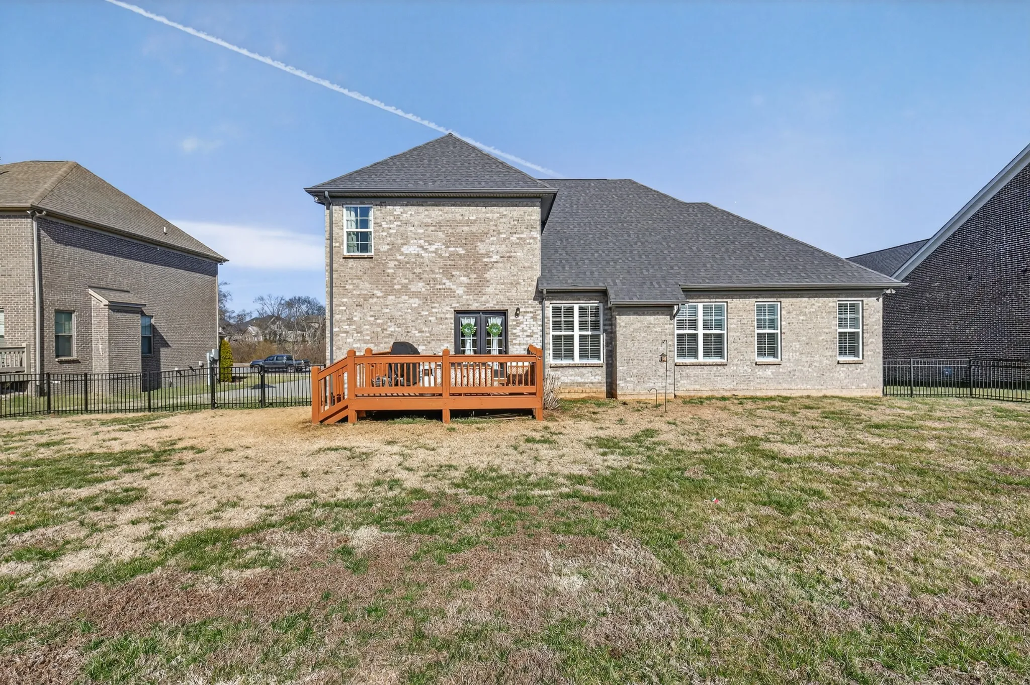 This all-brick, three-bedroom, 2.5-bath home features a spacious three-car garage with plenty of storage and a fully fenced backyard, perfect for pets, play, and outdoor entertaining. Inside, the open-concept living, dining, and kitchen area offers easy maintenance and beautiful hardwood flooring, creating an inviting space for everyday living and gatherings. Plantation shutters throughout the main level let light fill the home.