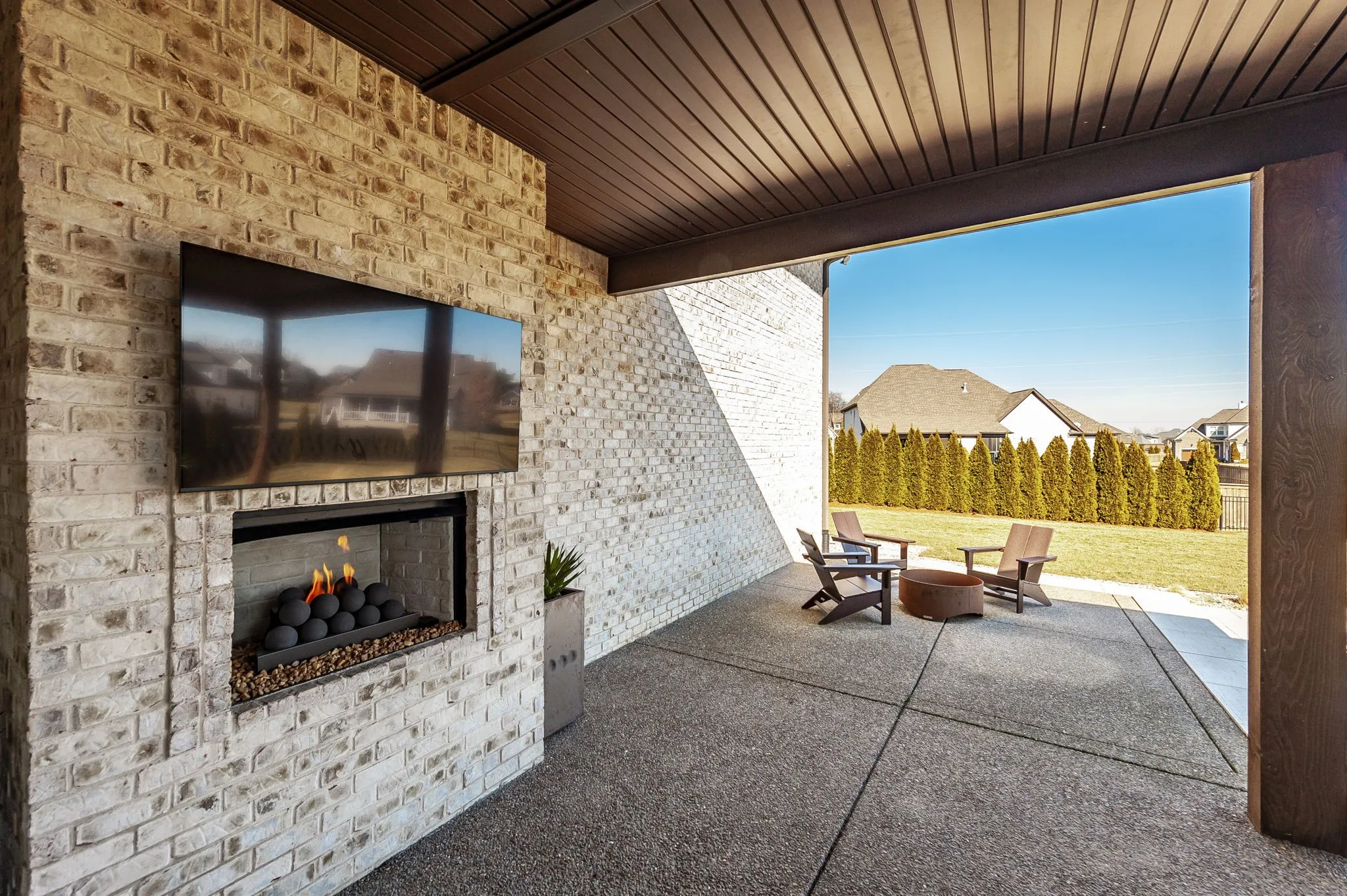 Inside, elevated finishes and intentional design define the space. Wide-plank flooring flows seamlessly through an open-concept layout filled with natural light. The living room is anchored by a sleek, linear fireplace framed in a floor-to-ceiling matte finish tile, creating a sophisticated focal point that feels both warm and contemporary.
