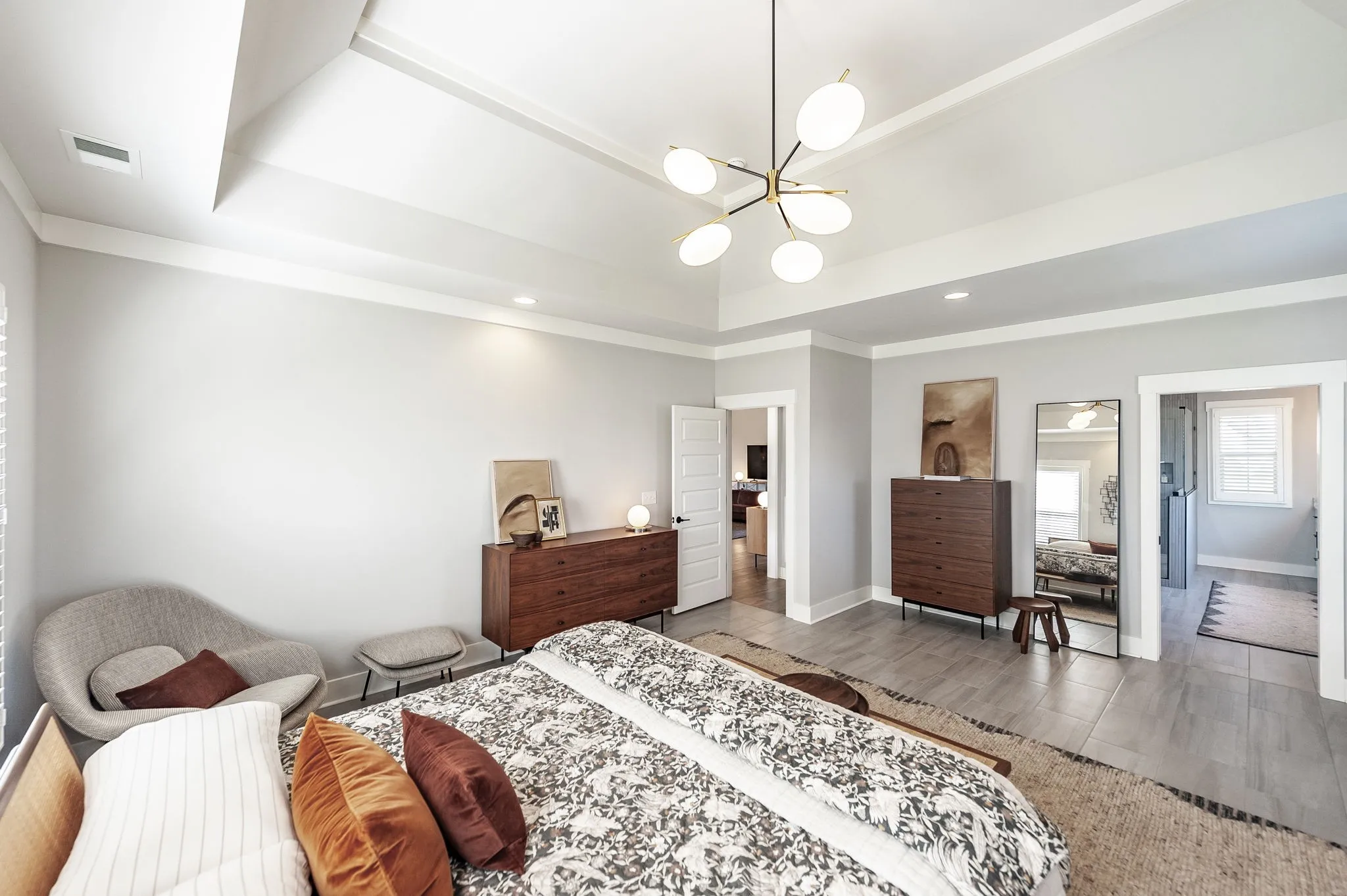 Architectural details elevate the dining space with a coffered ceiling and statement lighting, while expansive windows and French doors invite sunlight to pour in, offering seamless indoor-outdoor connection. The overall aesthetic is clean, curated, and effortlessly modern — ideal for both intimate evenings and elevated entertaining.