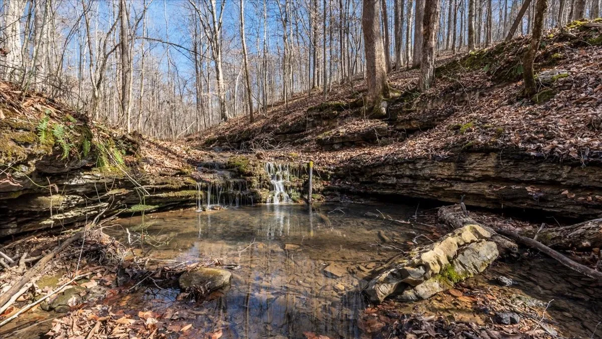 The land is exceptional. Two creeks wind through the property, complemented by two waterfalls, including a dramatic waterfall exceeding 40 feet that forms the headwaters of Stillhouse Branch, flowing naturally into Center Hill Lake. Mature hardwoods surround the tract, creating total seclusion, natural beauty, and a timeless sense of permanence.