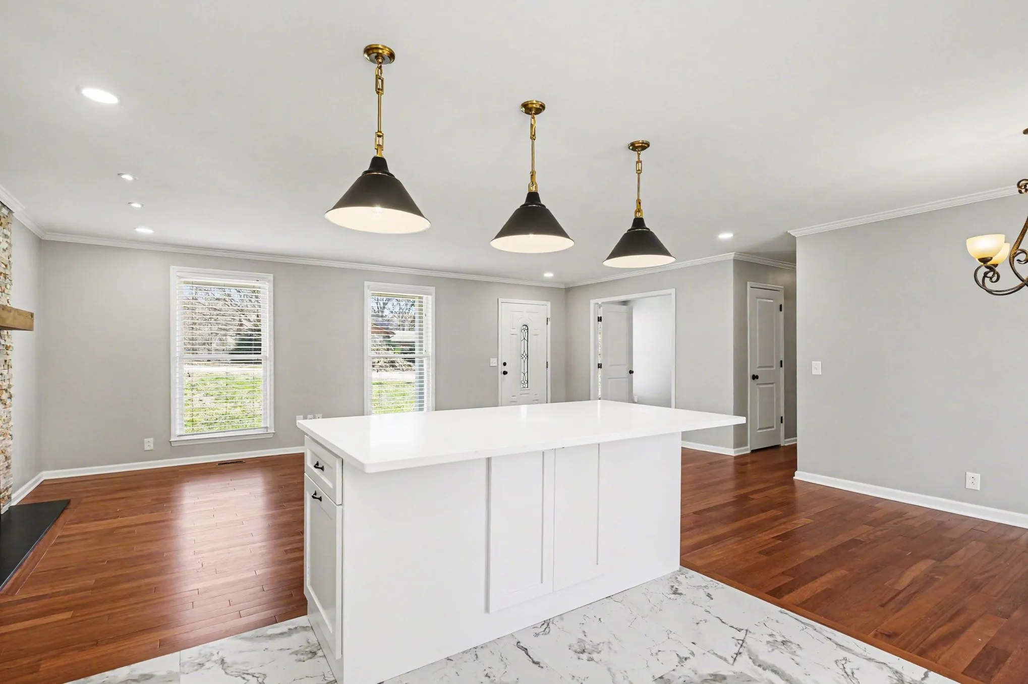 The brand-new kitchen is both functional and beautiful with custom Shaker cabinets, quartz countertops, a large island with pendant lighting, farmhouse sink, porcelain flooring, crown molding, and new Samsung stainless appliances—ideal for busy households and everyday living.