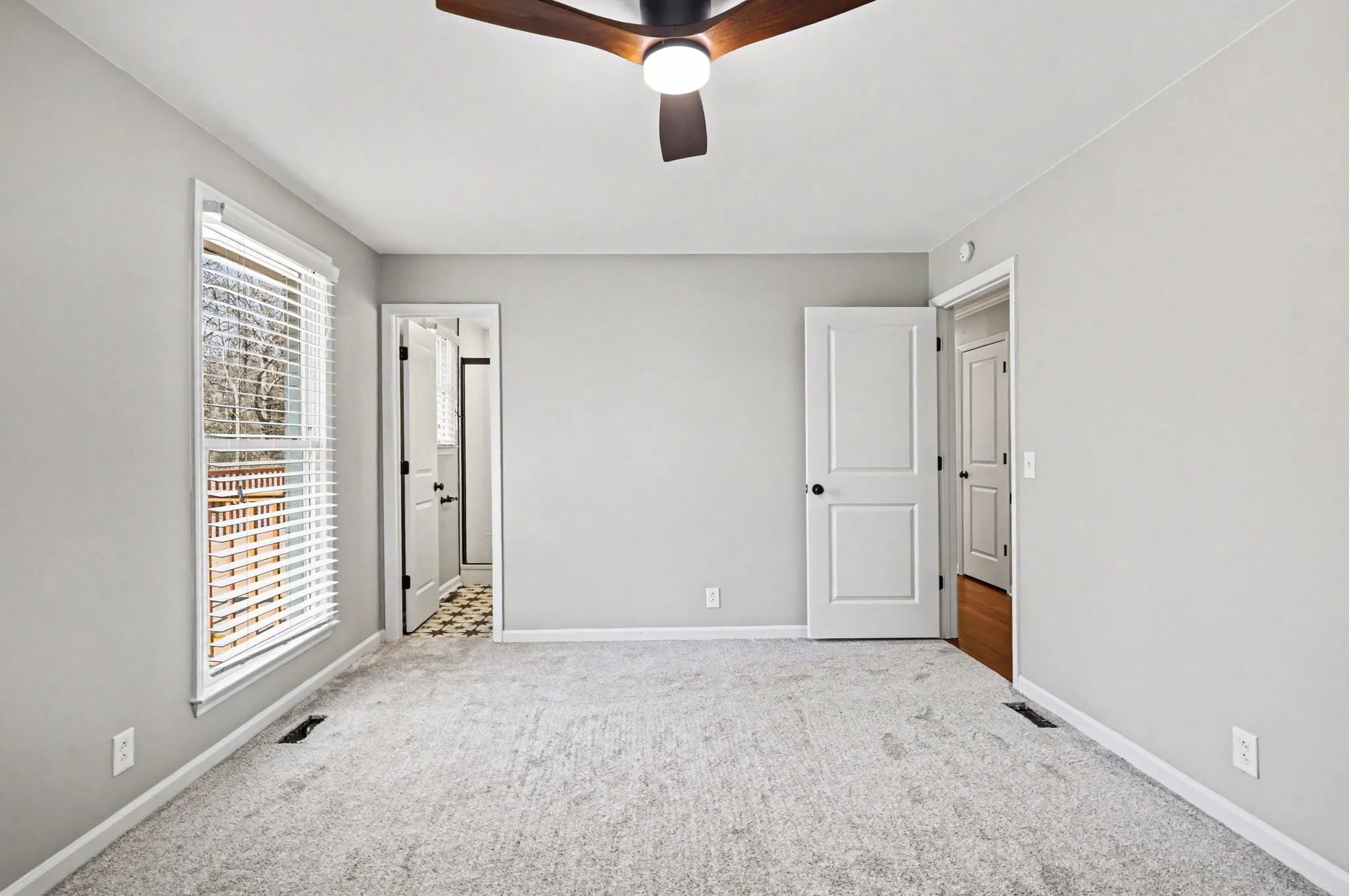 The primary suite offers new carpet, ceiling fan, a custom walk-in closet, and an ensuite bath with porcelain flooring and shower. Three additional bedrooms provide flexibility —one featuring French doors. The laundry area includes a new Samsung stackable washer and dryer and a new 50-gallon water heater.