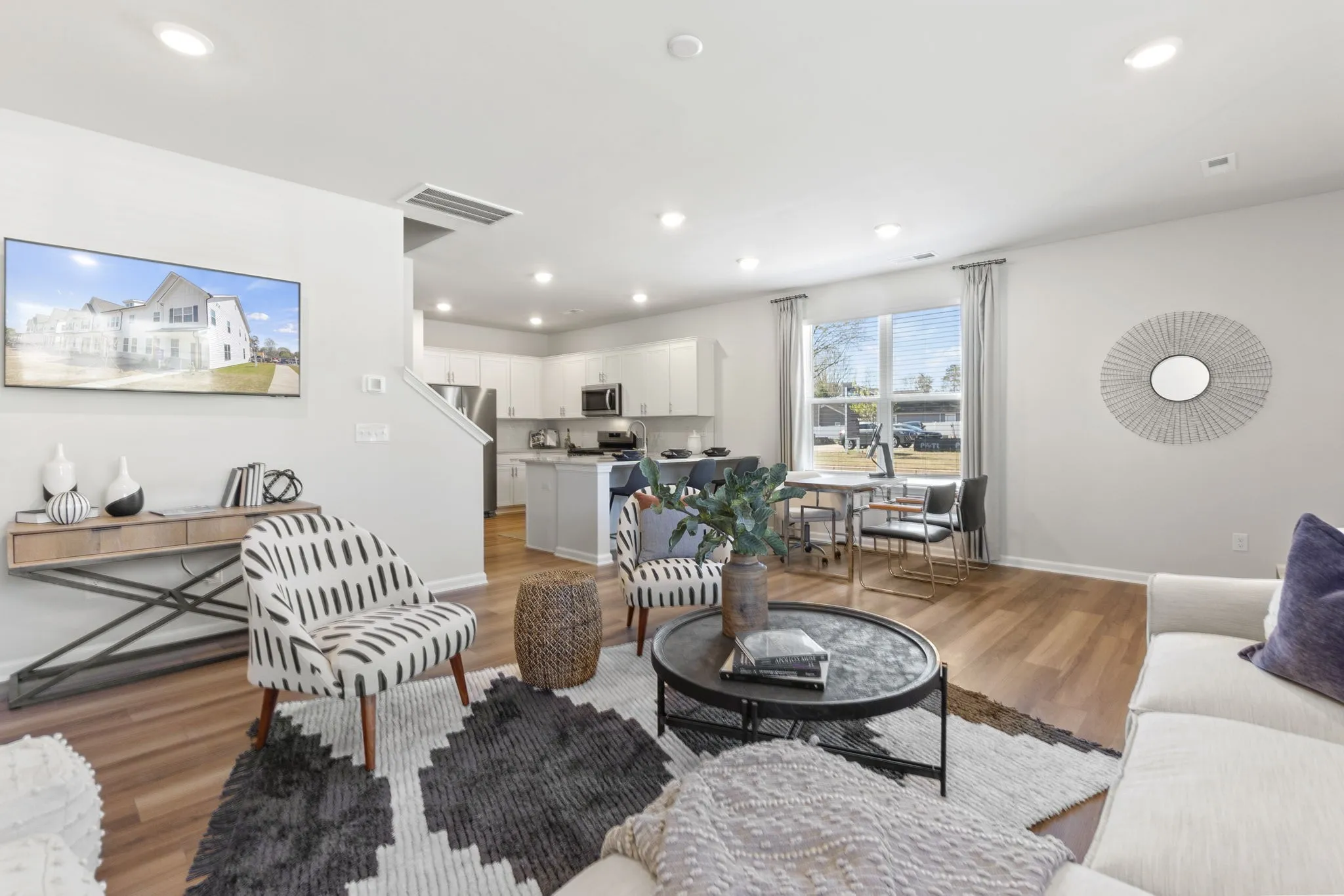 Designed to shine, the Cameron floorplan offers open living and dining areas creating a welcoming space to gather. In the kitchen, shaker style cabinets are paired with quartz countertops and a crisp white backsplash, adding contrast and a modern finish that elevates the entire space. A convenient powder bath and smart storage keep the main level both stylish and functional.