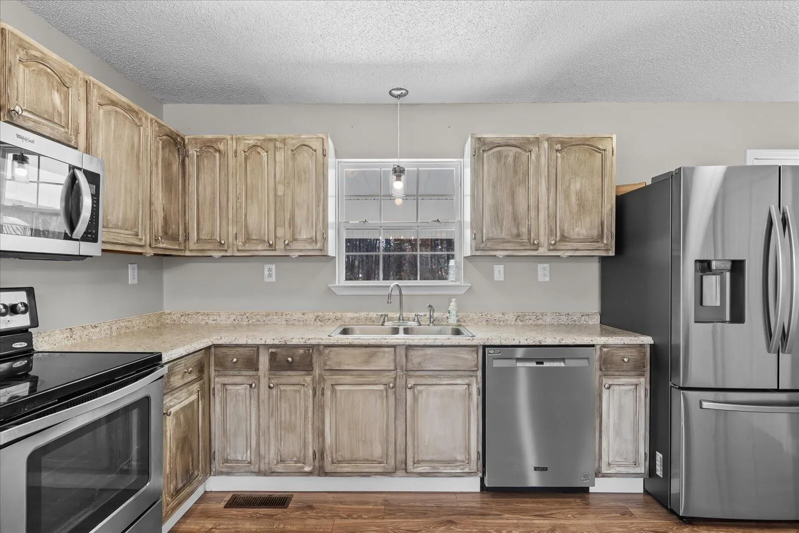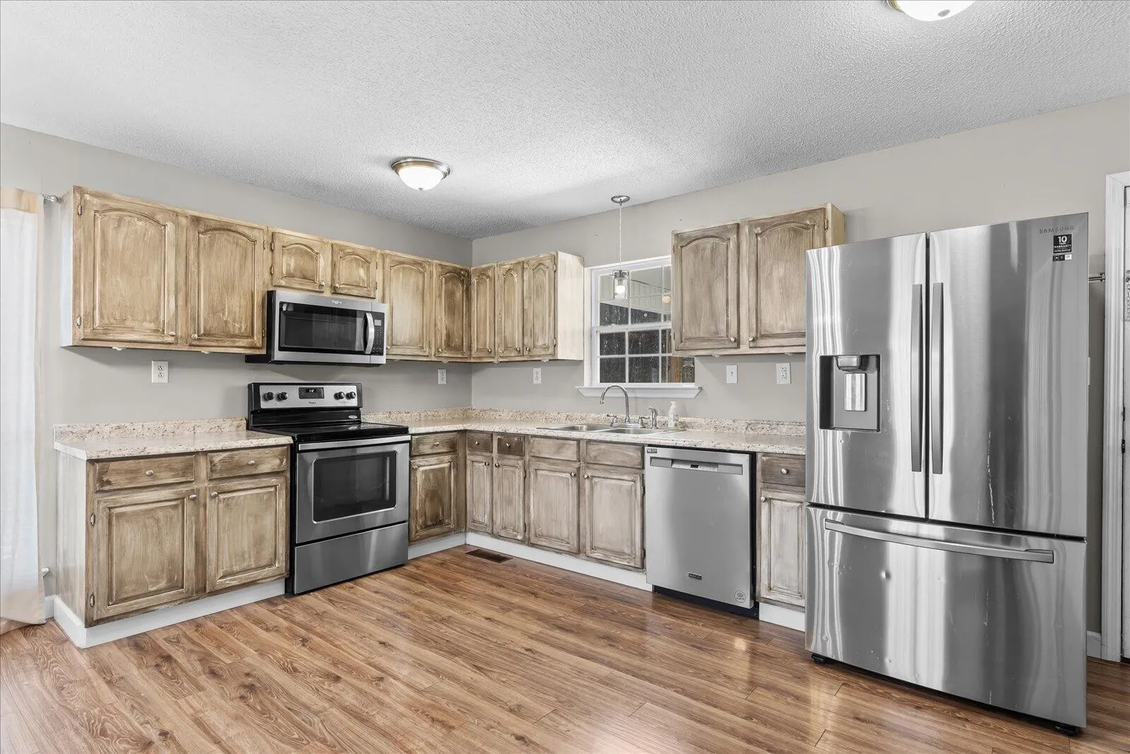 The kitchen offers abundant cabinetry, stainless steel appliances, and excellent workspace for cooking and gathering.