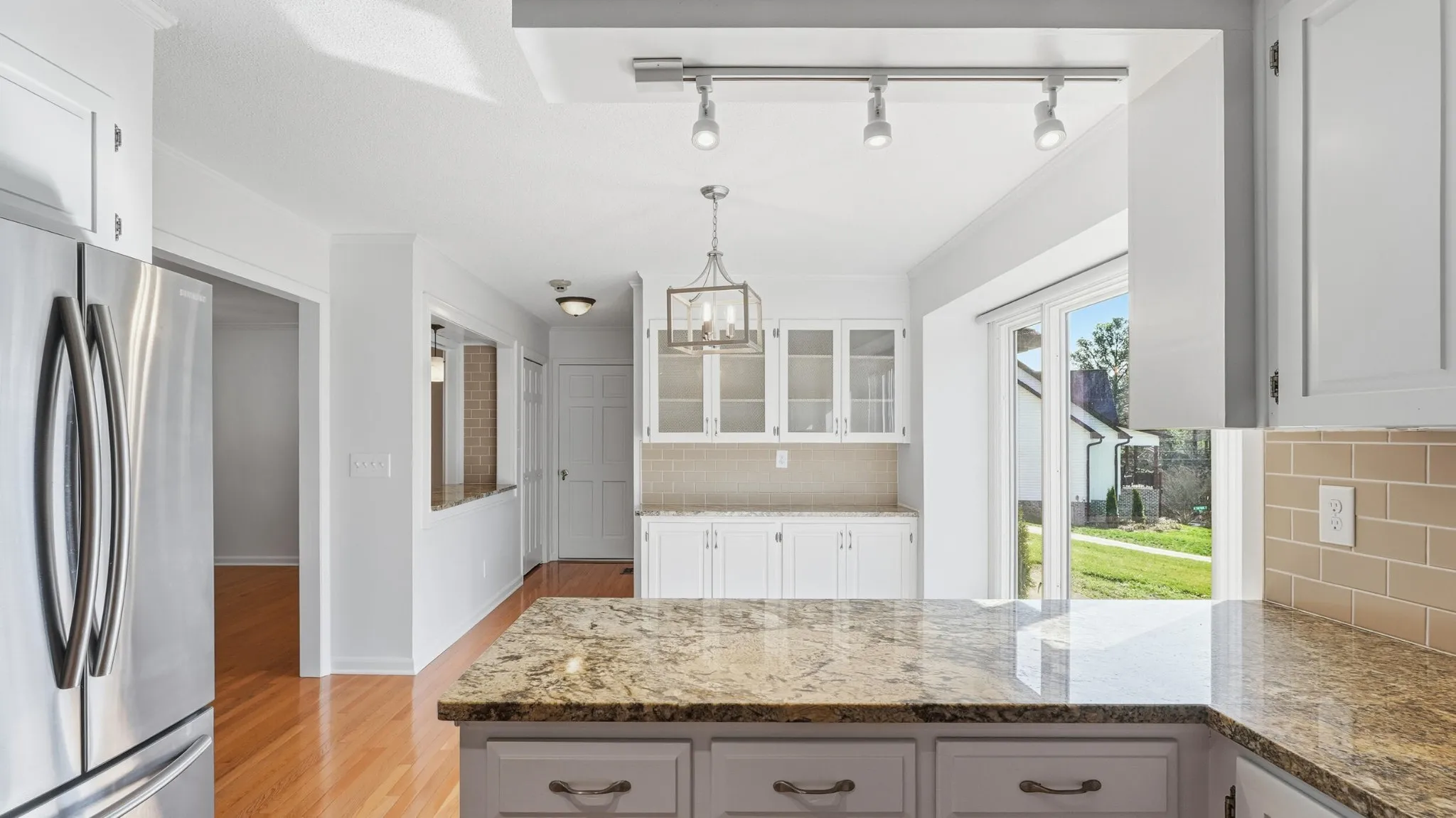 A welcoming foyer opens to a light-filled living room anchored by a fireplace and framed by expansive windows that invite abundant natural light. Rich hardwood flooring extends through the main living areas, dining room, and kitchen, enhancing the home’s cohesive and refined aesthetic. Custom built-ins and subtle architectural details add depth and interest, while the layout offers both comfort and functionality for everyday living and effortless entertaining.