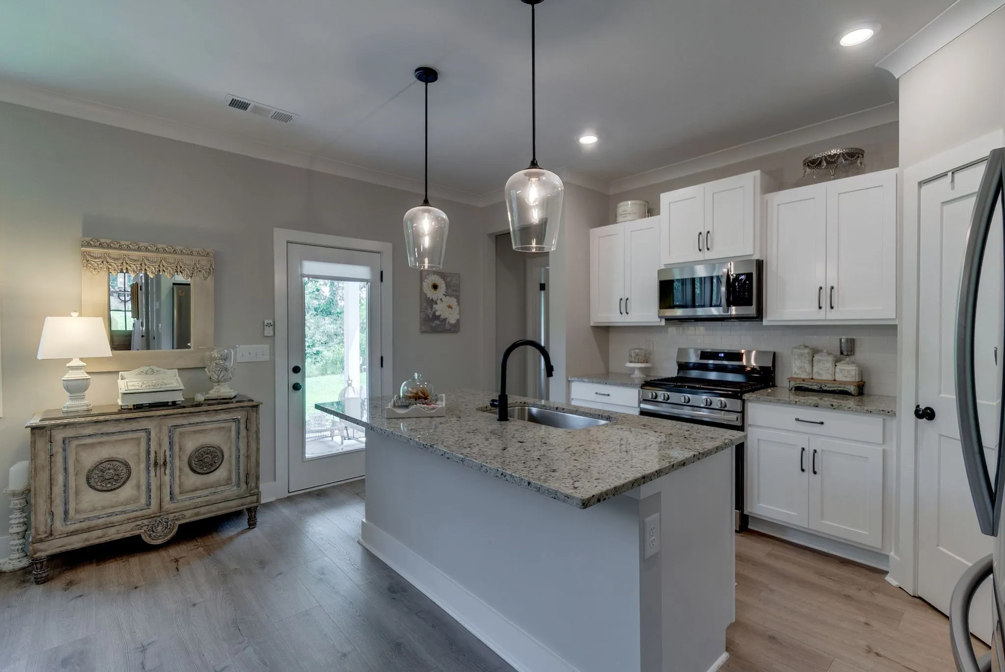 Enjoy outdoor living on covered front and back porches, each boasting beautiful tongue-n-groove-stained ceilings – perfect for relaxing or entertaining. The heart of this home is the gourmet kitchen, a chef’s dream outfitted with upscale appliances, gas cooking, brilliant granite counters, and a massive island.