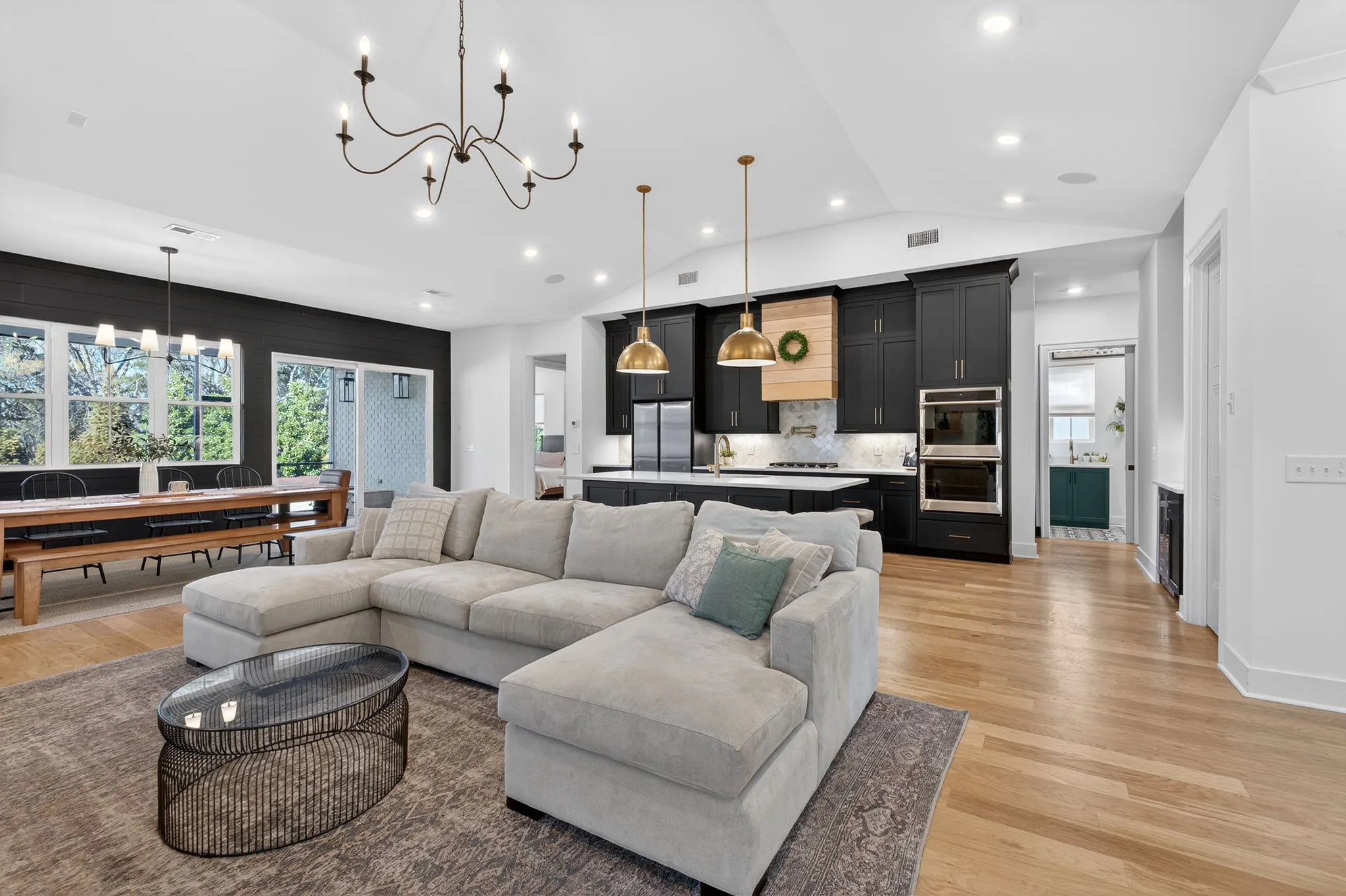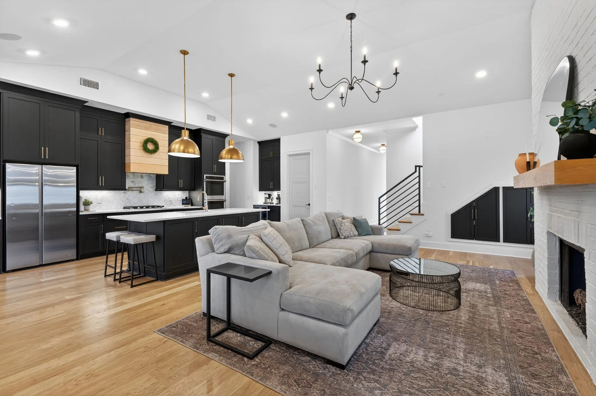 Inside features hardwood floors, soaring ceilings, custom built-ins, floor-to-ceiling gas fireplace, and a chef’s kitchen with quartz countertops, marble backsplash, pot filler, wine fridge, large custom pantry, and island seating on both sides.