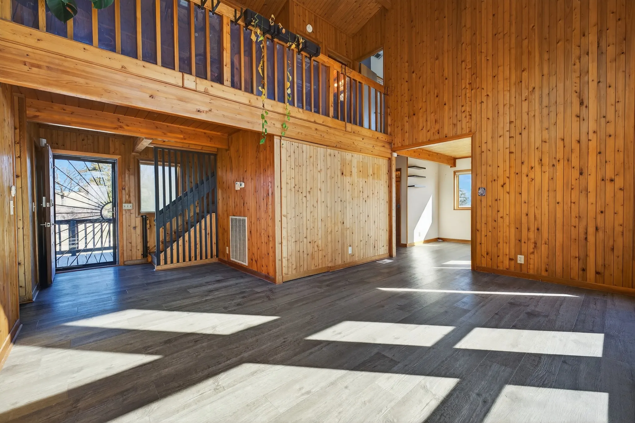 Spacious front and back decks invite you to step directly into nature. Inside, soaring ceilings and massive windows flood the home with abundant natural light, creating a bright, open feel. A modern staircase ascends to an interior balcony that overlooks the living area below.