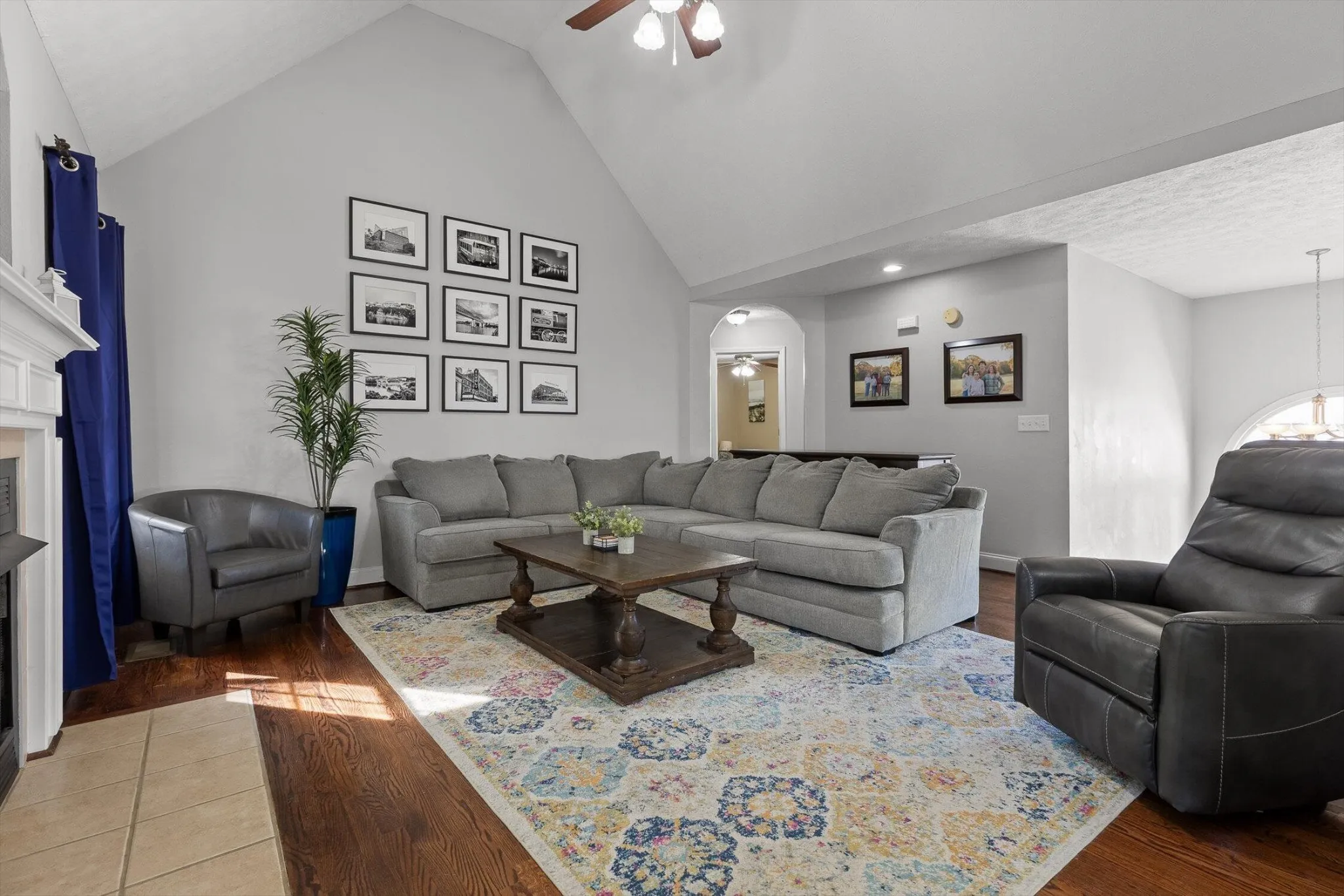 Step inside to find hardwood floors, warm natural light, and a stunning fireplace that serves as the focal point of the main living area. The kitchen includes custom cabinetry, plenty of countertop space, stainless appliances, and a pantry for extra storage.