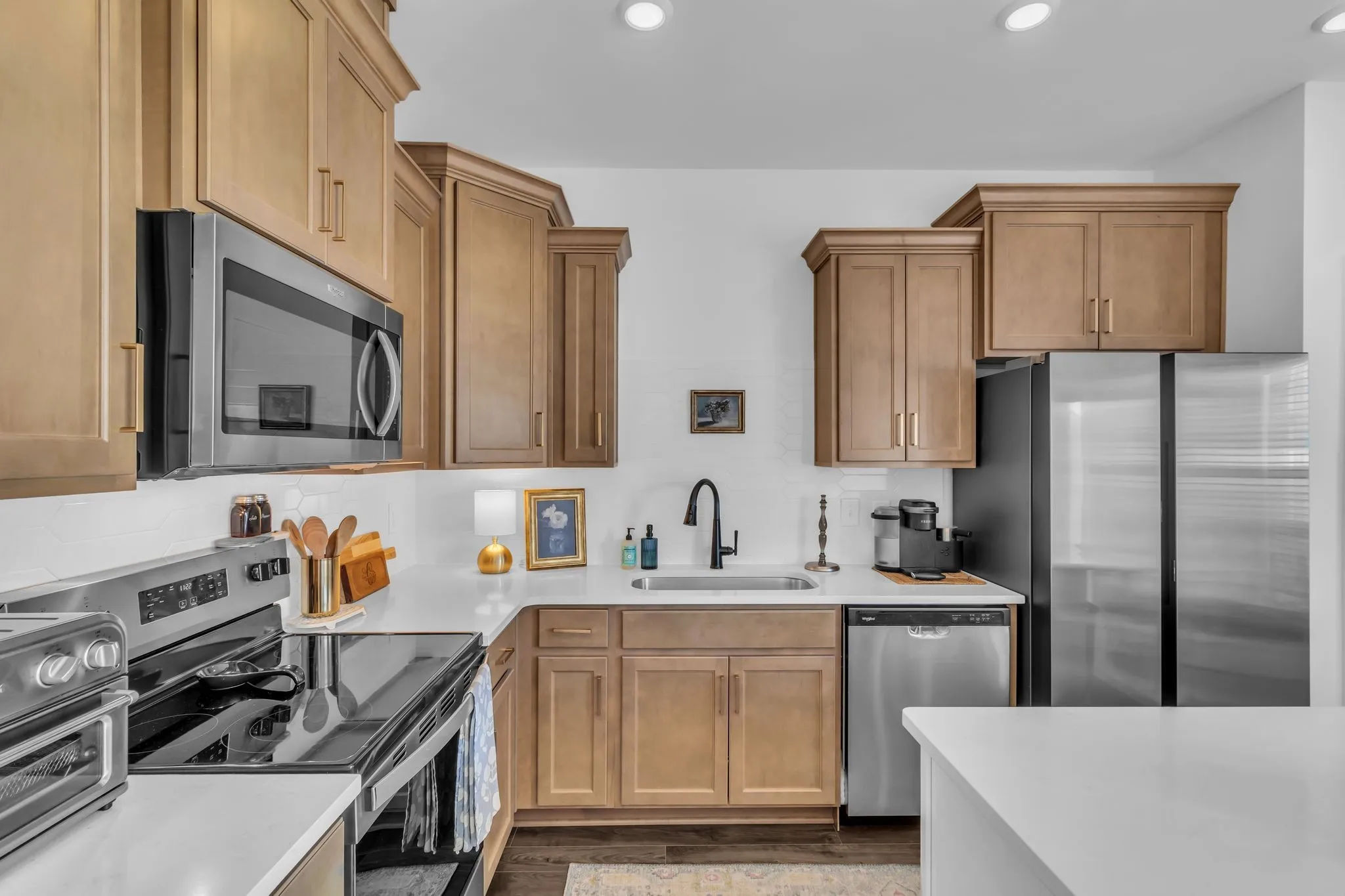 The home includes luxury plank vinyl flooring throughout (no carpet), designer lighting, custom blinds, and top-down woven shades. The bright kitchen features a Samsung Bespoke refrigerator with nugget and cube ice and opens to a private balcony, ideal for everyday enjoyment.