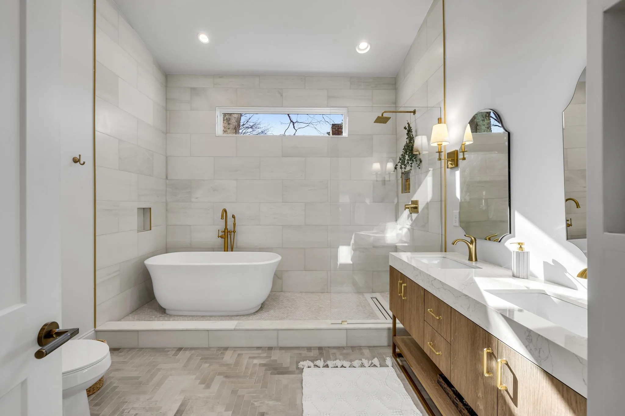 The spacious bathroom was designed to feel spa-like and airy with a soaking tub, waterfall-style shower, and double vanity.