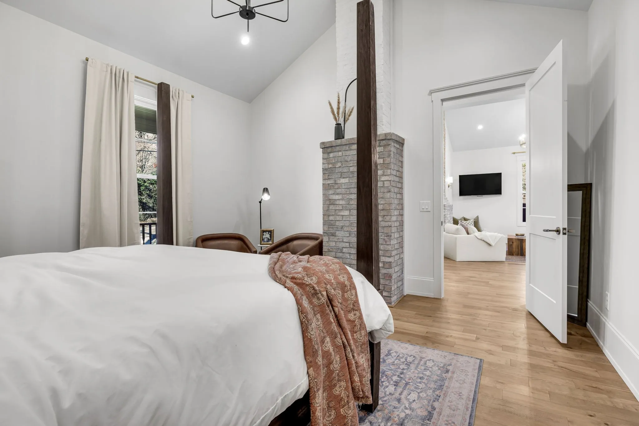 You’ll find exposed brick chimneys in most of the rooms, tall ceilings, and open living spaces perfect for gathering. Even the front door was sourced to match the time period.