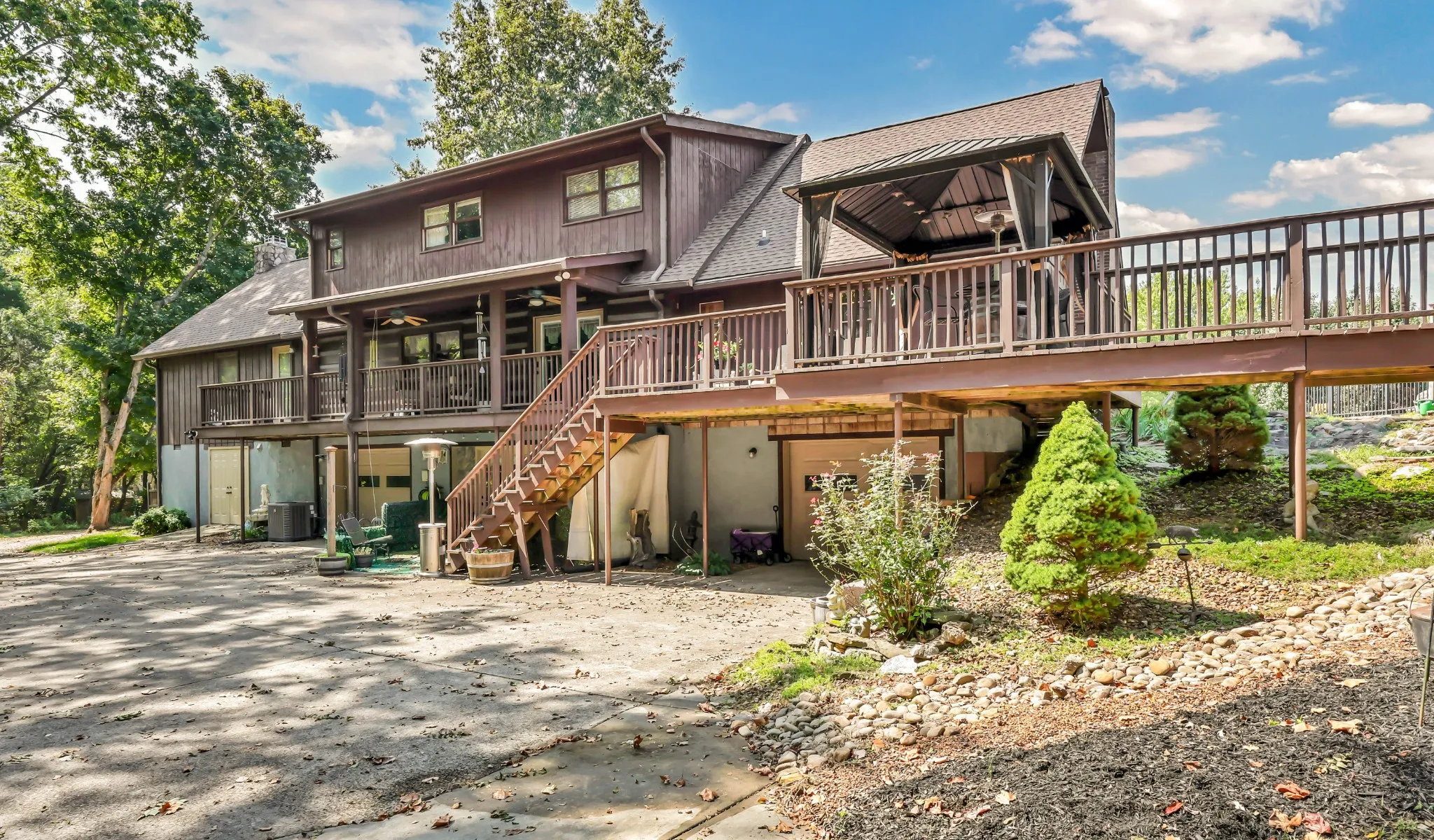 Only 2 miles from Exit 11 in the Sango area and located within the Rossview High School limit! (***September 2025 photos posted, updated photos coming soon***) Welcome to the tranquility of the front porch and swing as you enter into your cozy, rustic, extended log cabin home! Open the door to an open-concept great room , dining room and to the 1st of 4 fireplaces! Open concept dining area into kitchen with a large island boasting beautiful granite counter tops and stainless steel kitchen appliances and over-sink TV. 3 other fireplaces are located in spacious main floor 28X20 primary en-suite bedroom,in the the high celings rec rm/2nd living rm (lg TV included) and one in the finished partial basement. 3 additional bedrooms, full bathroom and a 15 X1 multi-purpose loft area are located on the 2nd floor. 18X24(irregular shaped) finished partial basement/recreation/entertainment room with lots of storage, a “secret room”, exits to 2 separate 1 car garages, a 1/2 bath and walk-out to a patio! ***ADDITIONAL, Oversized(40×24), detached double-garage-door 2 car garage/workshop with a lean-two/covered parking space!*** Enjoy an outdoor relaxation or entertainment experience with the well-maintained HEATED in-ground pool with waterfall, outdoor kitchen/bar, 2 pergolas, pool house, covered front porch and covered rear wood deck, stocked and netted koi pond, playhouse and play set. This property is located on 2.9 acres!