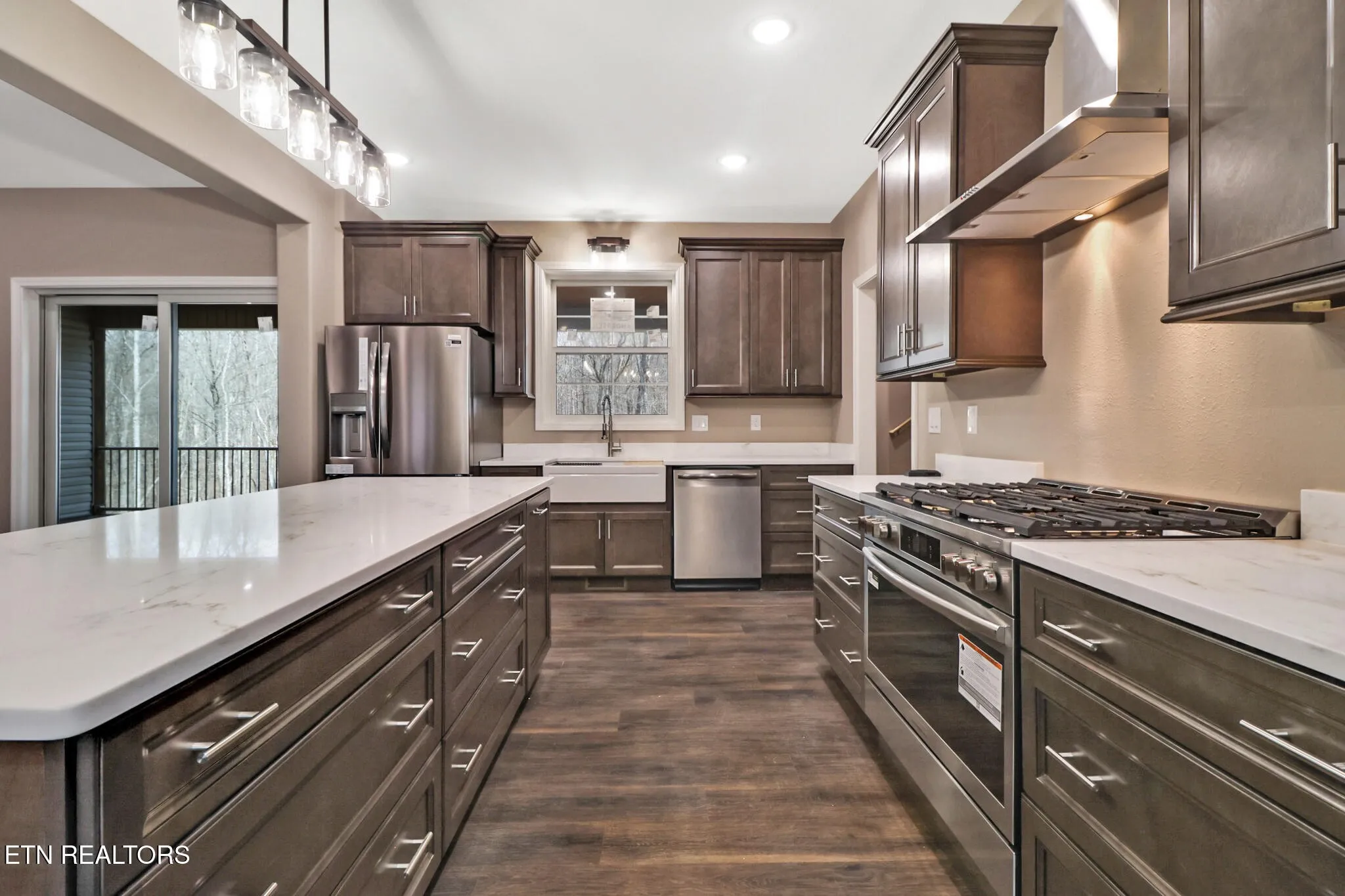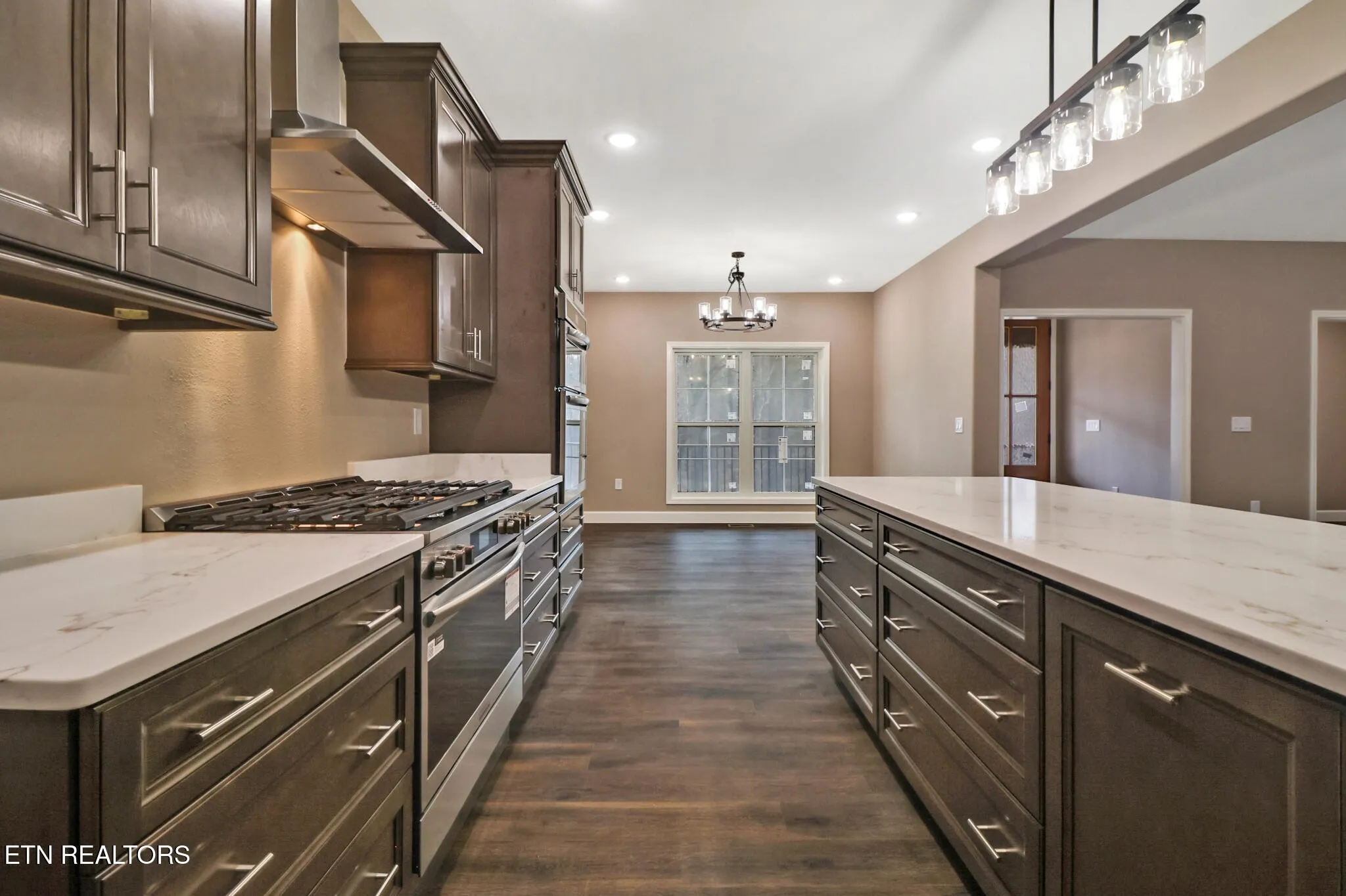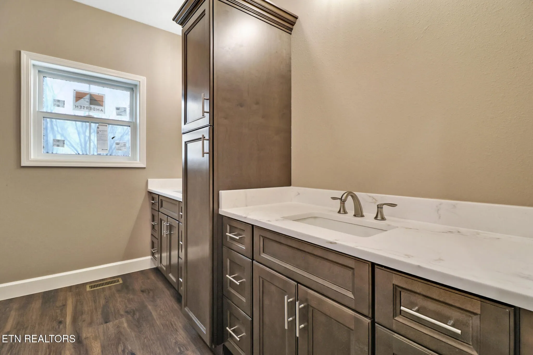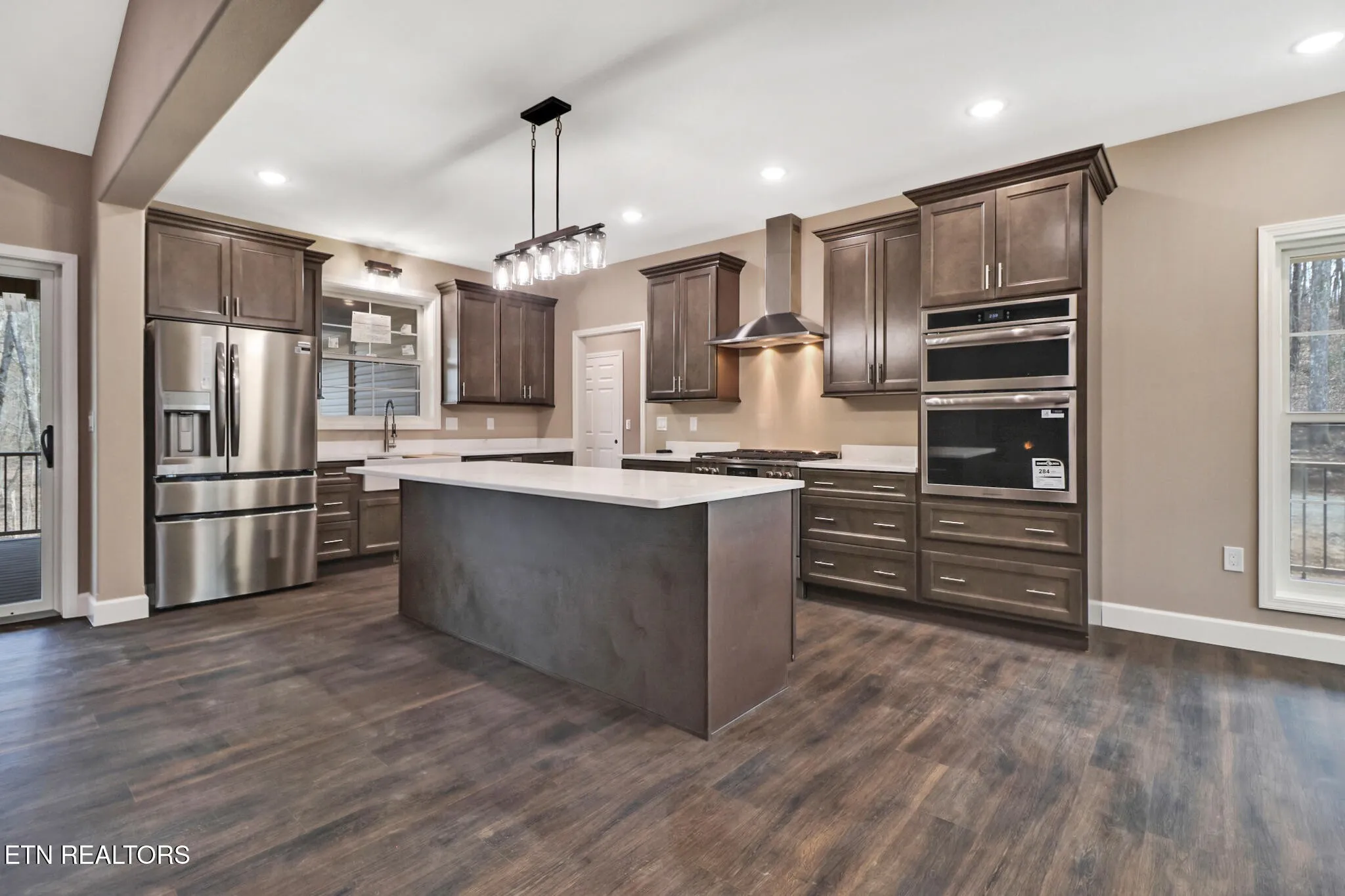 The Chef’s kitchen is a standout, boasting a massive island with abundant storage on one side, including a built-in trash cabinet, and casual dining on the other. The kitchen features an oversized porcelain farm sink, elegant, white-veined quartz countertops (throughout the home), and crown-molded upper cabinets with soft-close drawers and doors. A generous walk-in pantry offers space for future shelving and organization. The kitchen flows into a bright, spacious dining room perfect for hosting. The split-bedroom layout ensures privacy. The luxurious primary suite is a true retreat, featuring a private en-suite bath with a large walk-in tiled shower with dual showerheads, a deep free-standing soaker tub with a large casement window for natural light, and an oversized walk-in closet complete with built-in linen storage.