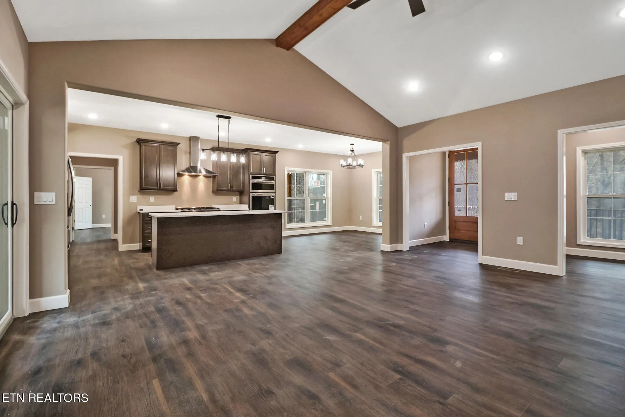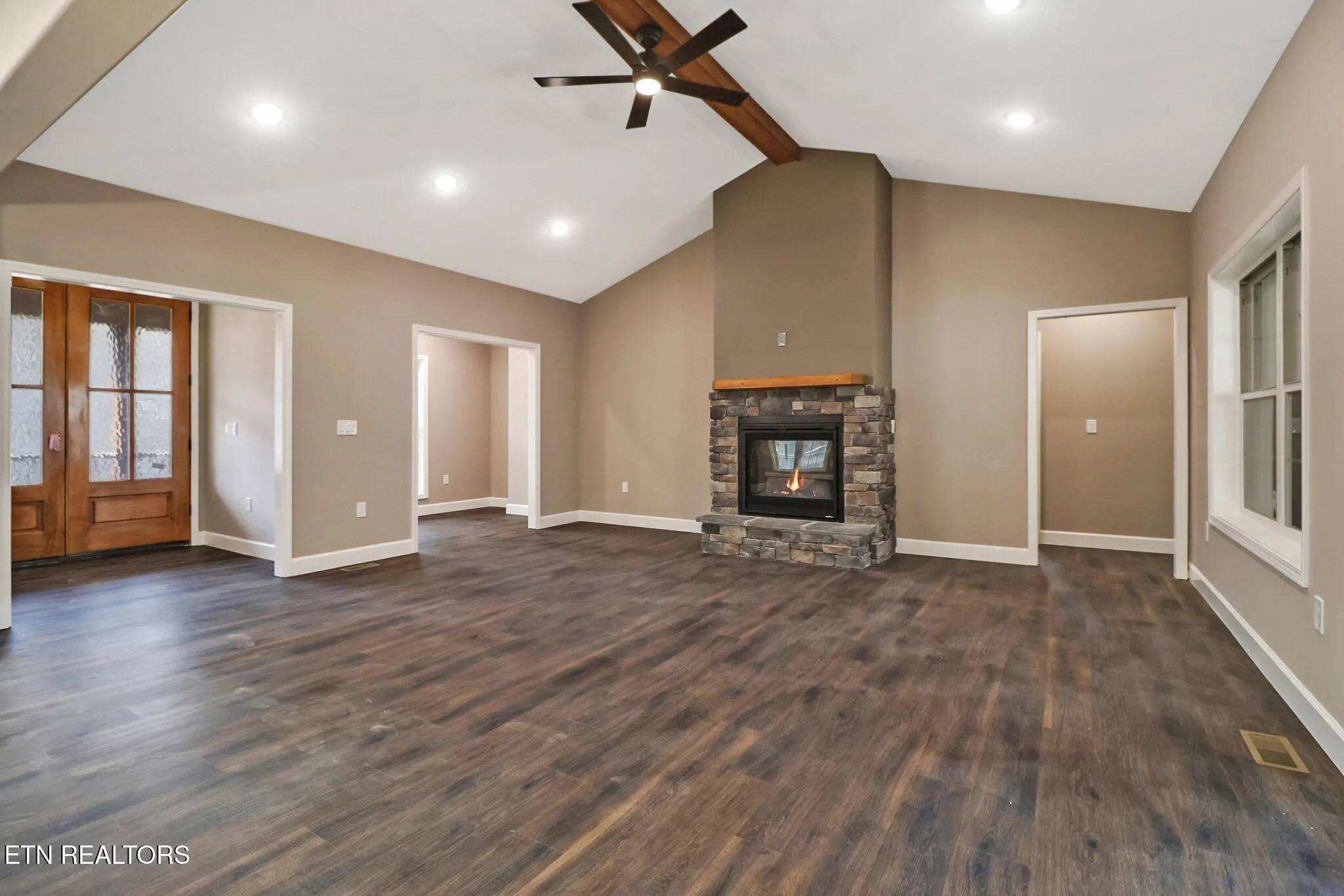 Nestled on a serene 4-acre wooded parcel, this thoughtfully designed single-family home offers the perfect blend of modern comfort and natural tranquility. Spanning 2,596 square feet of thoughtfully finished living space, (which includes a versatile 370-sf bonus room over the garage with its own mini-split HVAC, making it a great space for a hobby, media room, or just storage), the 3-bedroom, 2.5-bath with oversized 2 car garage home delivers ample room for family, work, and relaxation–ideal for today’s buyers seeking space without sacrificing privacy. Step inside the Grand Double Entry Doors into an expansive Great Room featuring soaring vaulted ceilings and a cozy Natural Gas Log Fireplace surrounded by stone–the heart of the home for gatherings year-round. Bathed in natural light, an adjacent dedicated office/study provides a quiet, productive workspace with easy access to the main living areas.