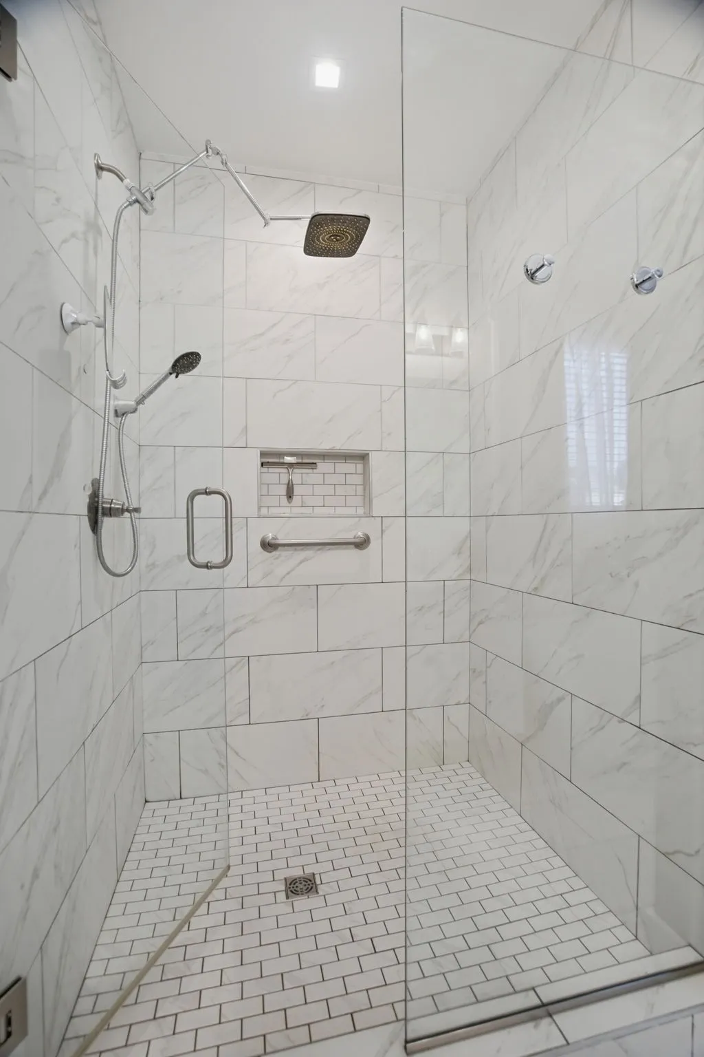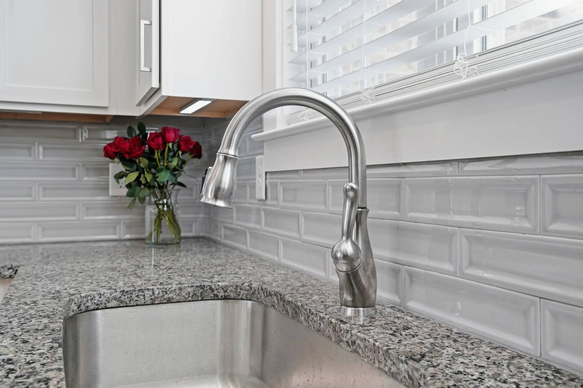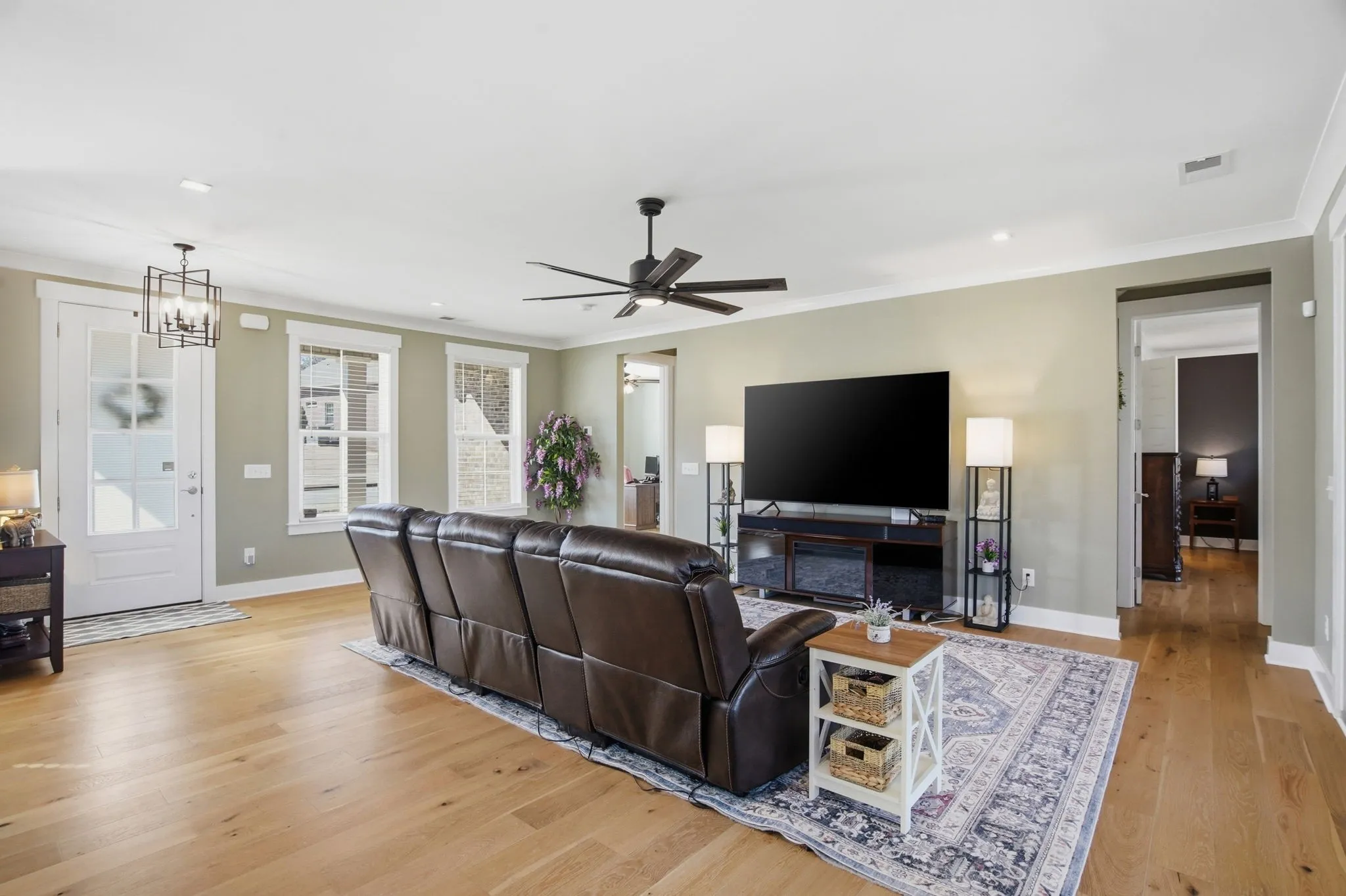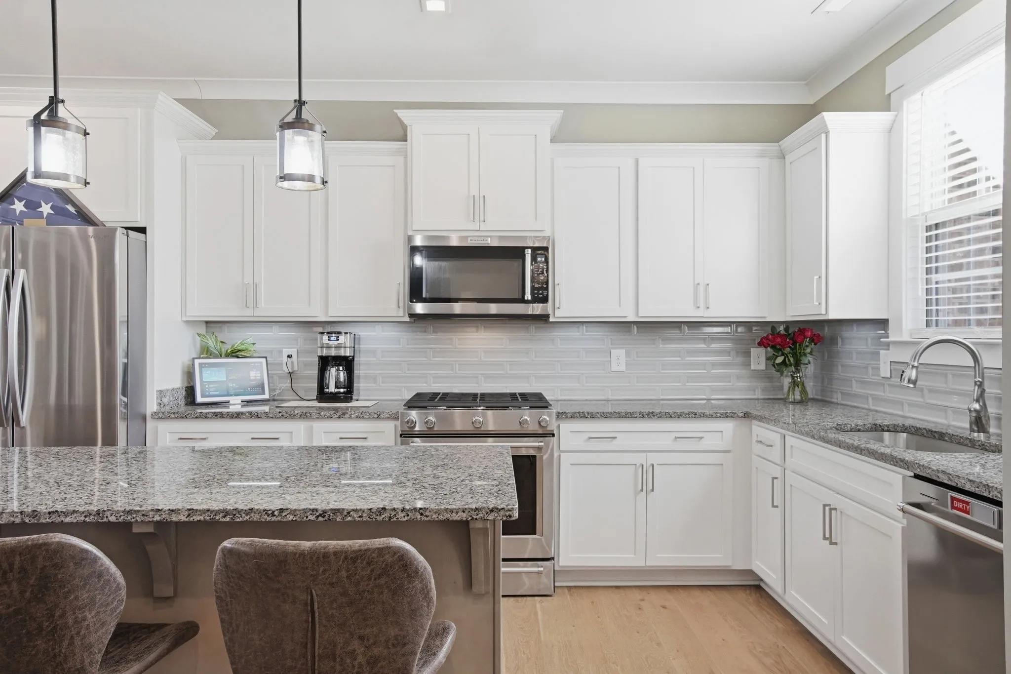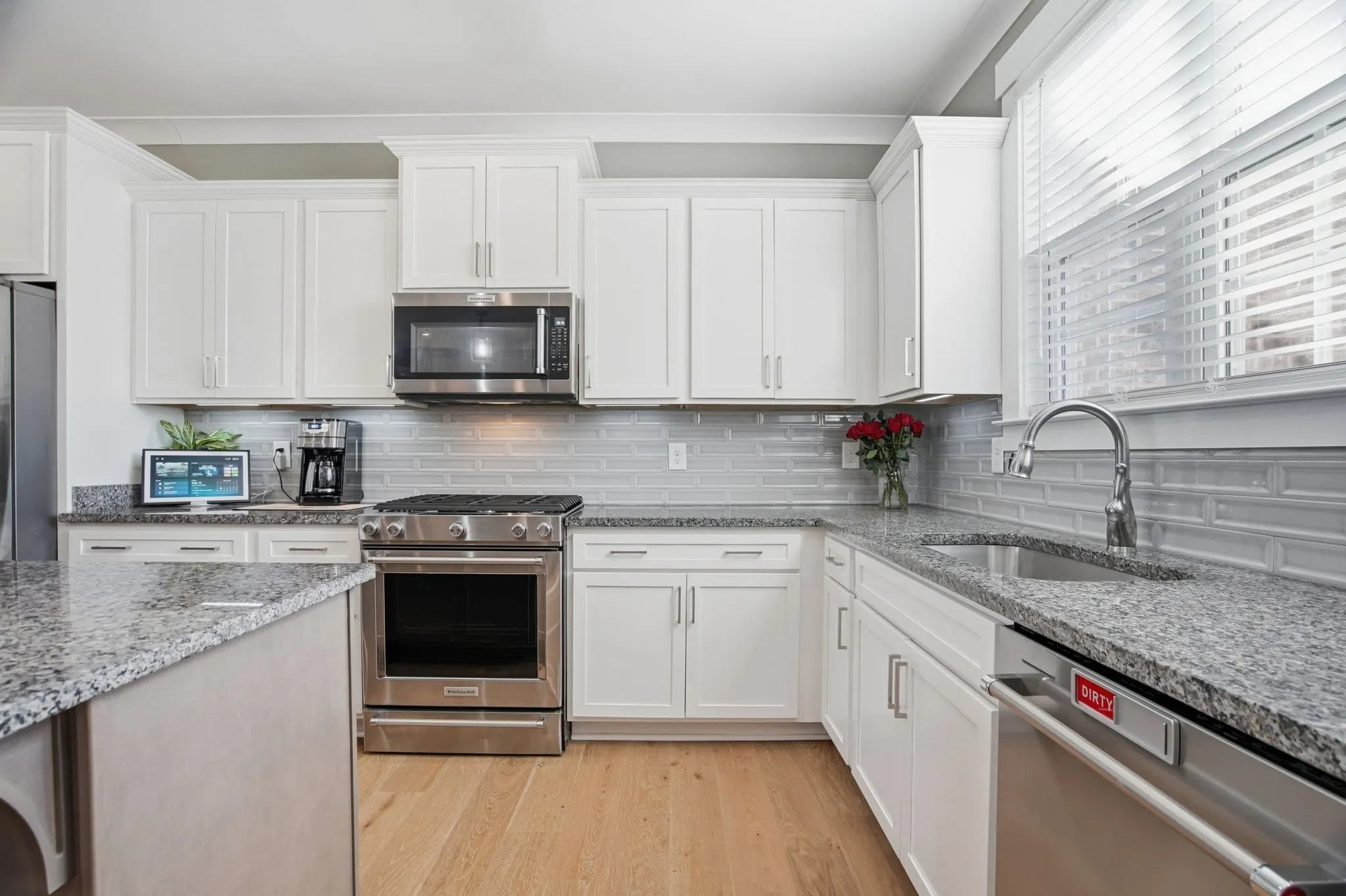 Recent updates include a waterfall shower in the primary bathroom, wooden blinds throughout, a full interior repaint, motion‑sensor under‑cabinet lighting in the kitchen, freshly mulched landscaping, and security cameras around the perimeter. The garage features custom cabinetry for excellent storage.