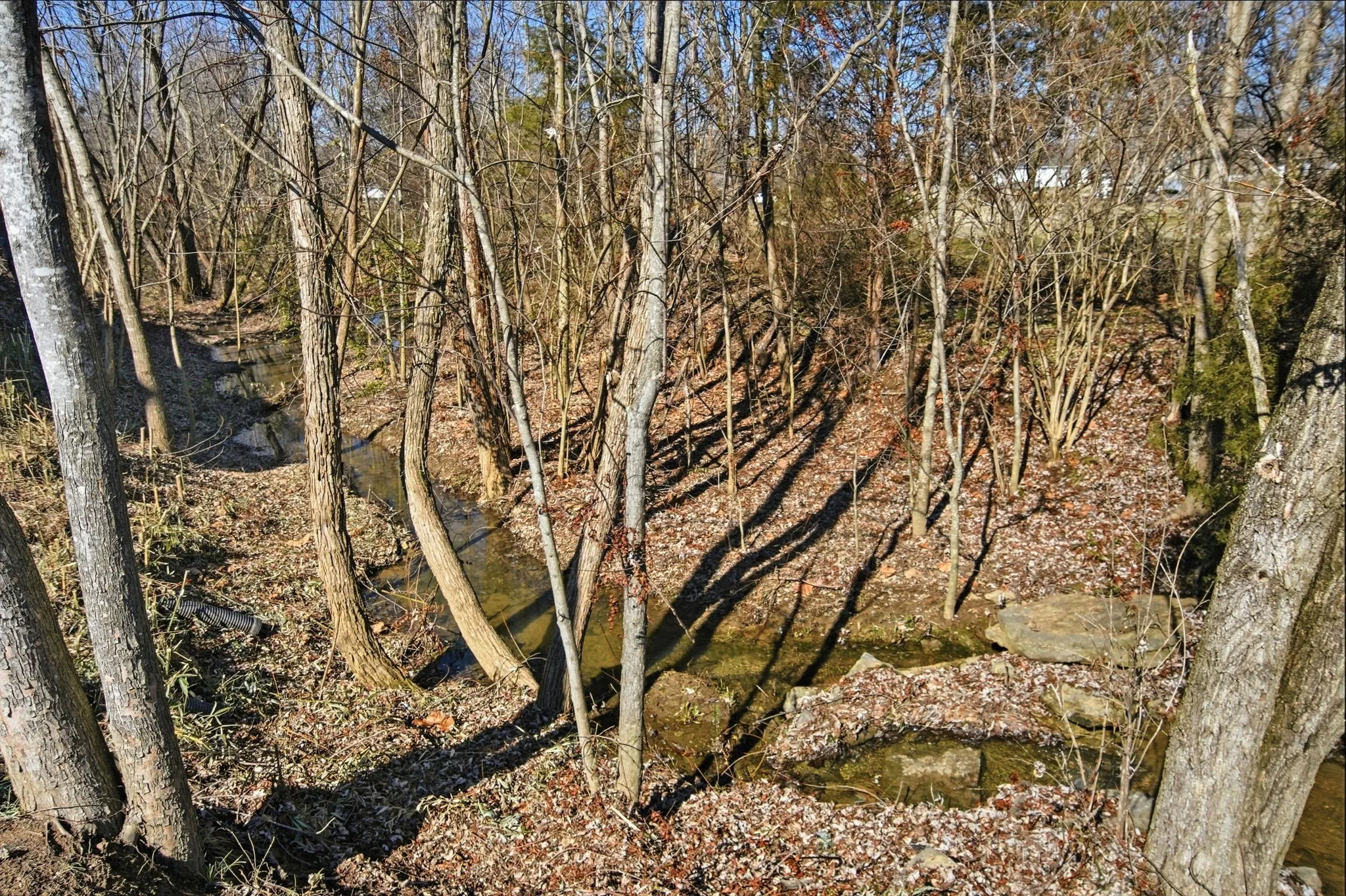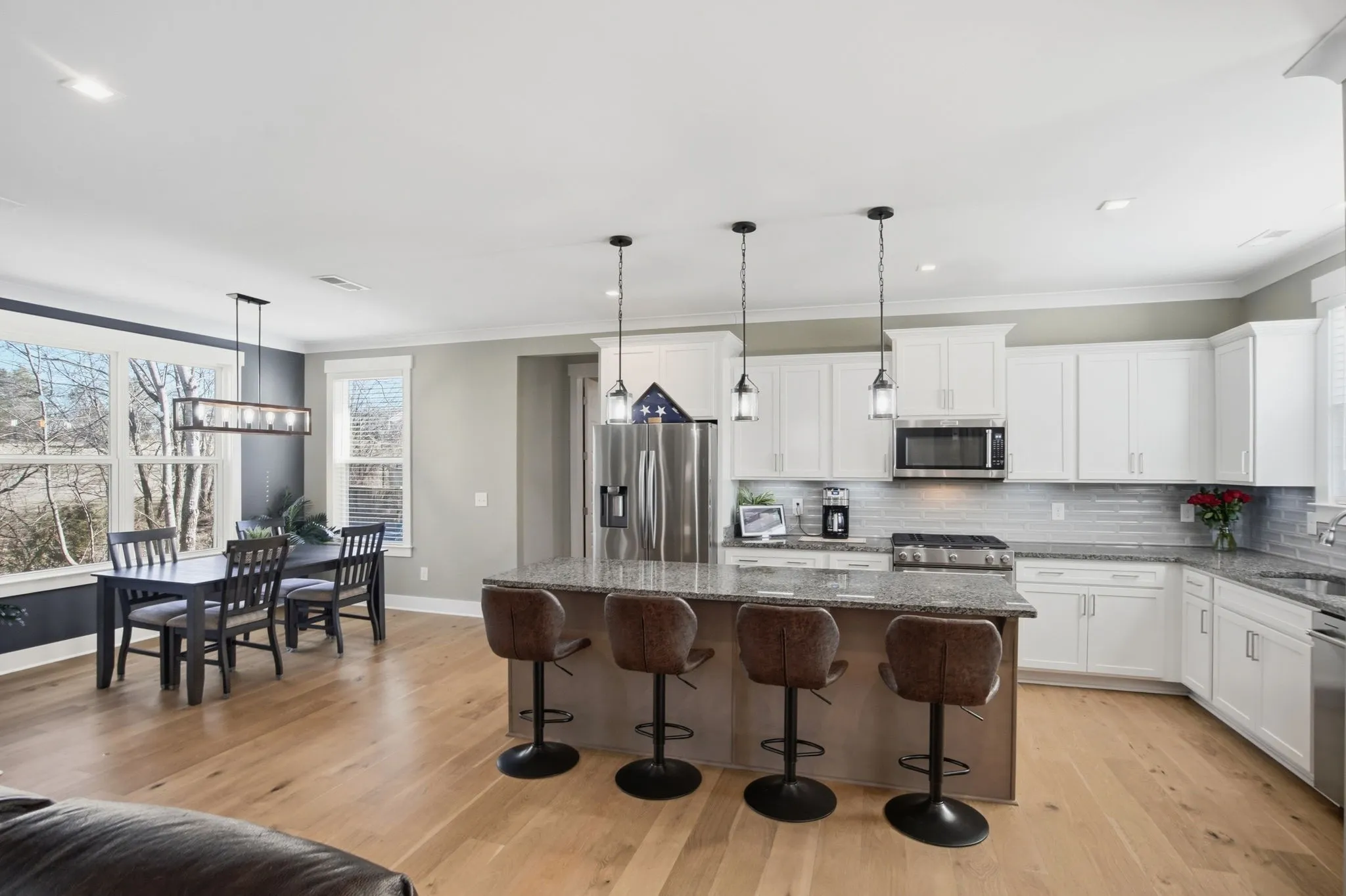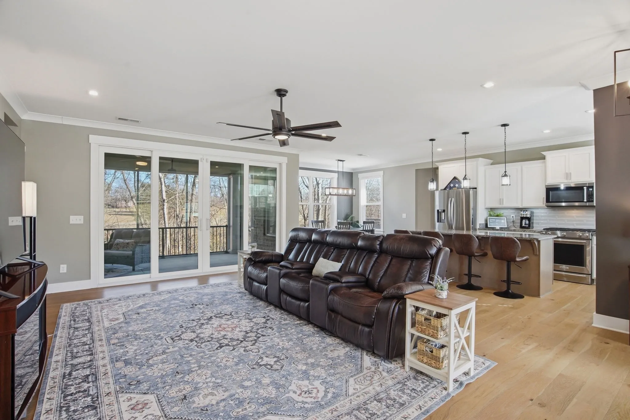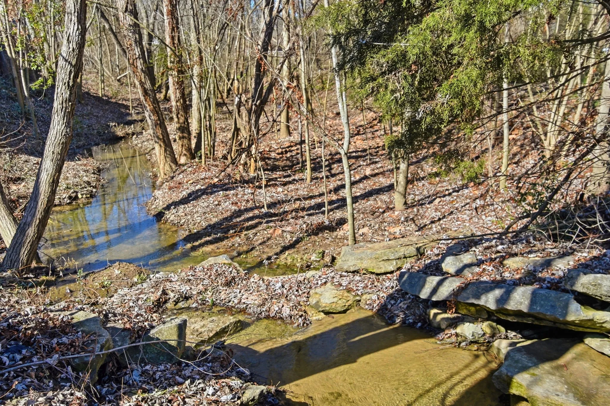 A standout feature is the screened‑in porch with its own gas fireplace — a true year‑round living space. It overlooks a tree‑lined yard with a creek and a newly coated patio. It’s an easy place to unwind, whether you’re listening to crickets at night or enjoying the fireplace on cooler evenings. With no houses behind you, privacy comes naturally.