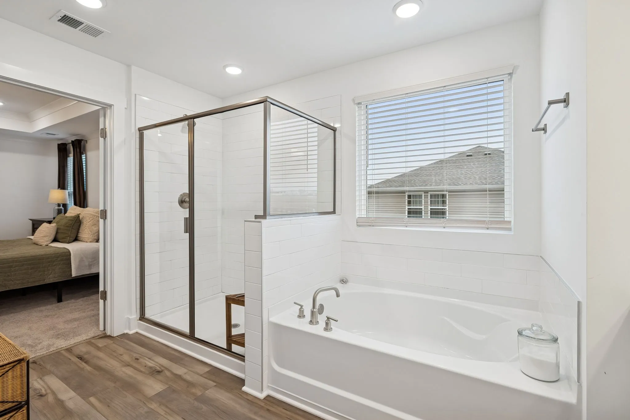 Upstairs, all four bedrooms are thoughtfully positioned alongside a large bonus/loft space and an oversized laundry room complete with cabinetry and quartz countertops. The primary suite is massive — offering two generous walk-in closets, dual vanities, a separate soaking tub, and walk-in shower.