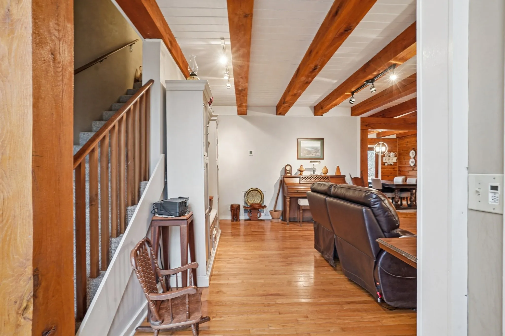 The interior showcases classic log home appeal with exposed beams and inviting natural textures. A gas fireplace anchors the main living area and creates the perfect setting for relaxing evenings or entertaining guests. Natural light enhances the home’s welcoming atmosphere and highlights the craftsmanship throughout.