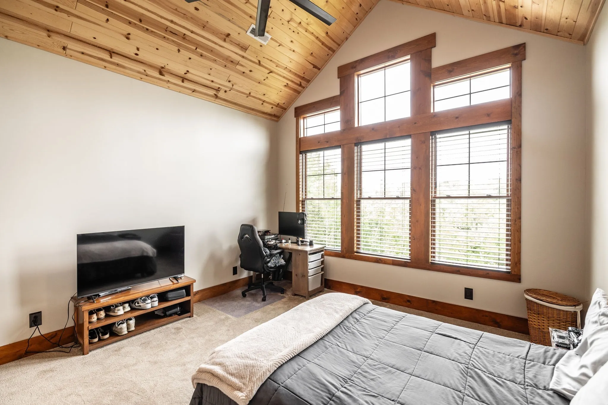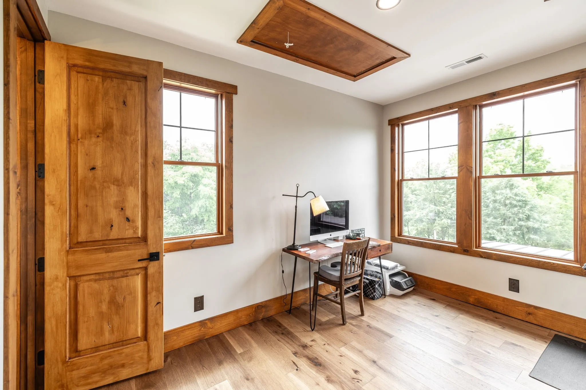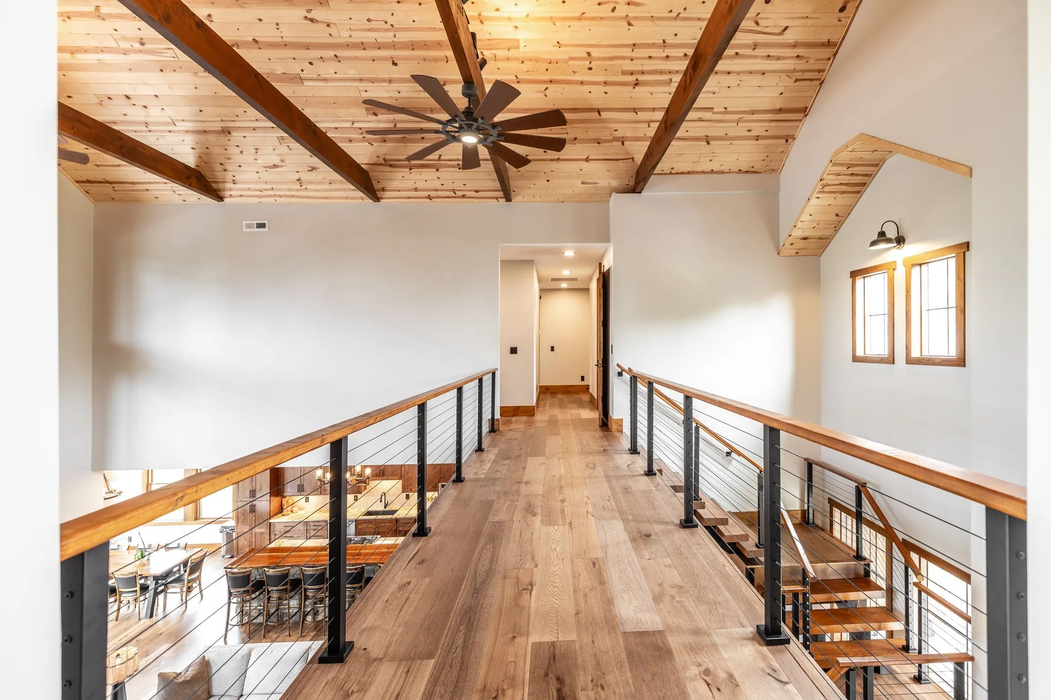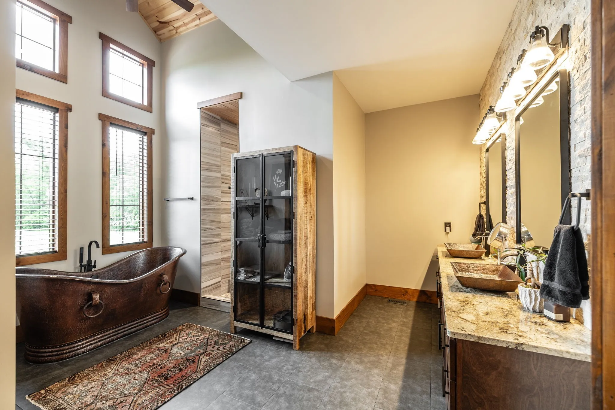 Chef’s kitchen with Hickory cabinets, granite & butcher block counters, black walnut bar top, double ovens, gas cooktop, ice maker, and double refrigerator. Enjoy a copper tub, custom stairs, wideplank Hickory floors, and tongue & groove ceilings throughout.
