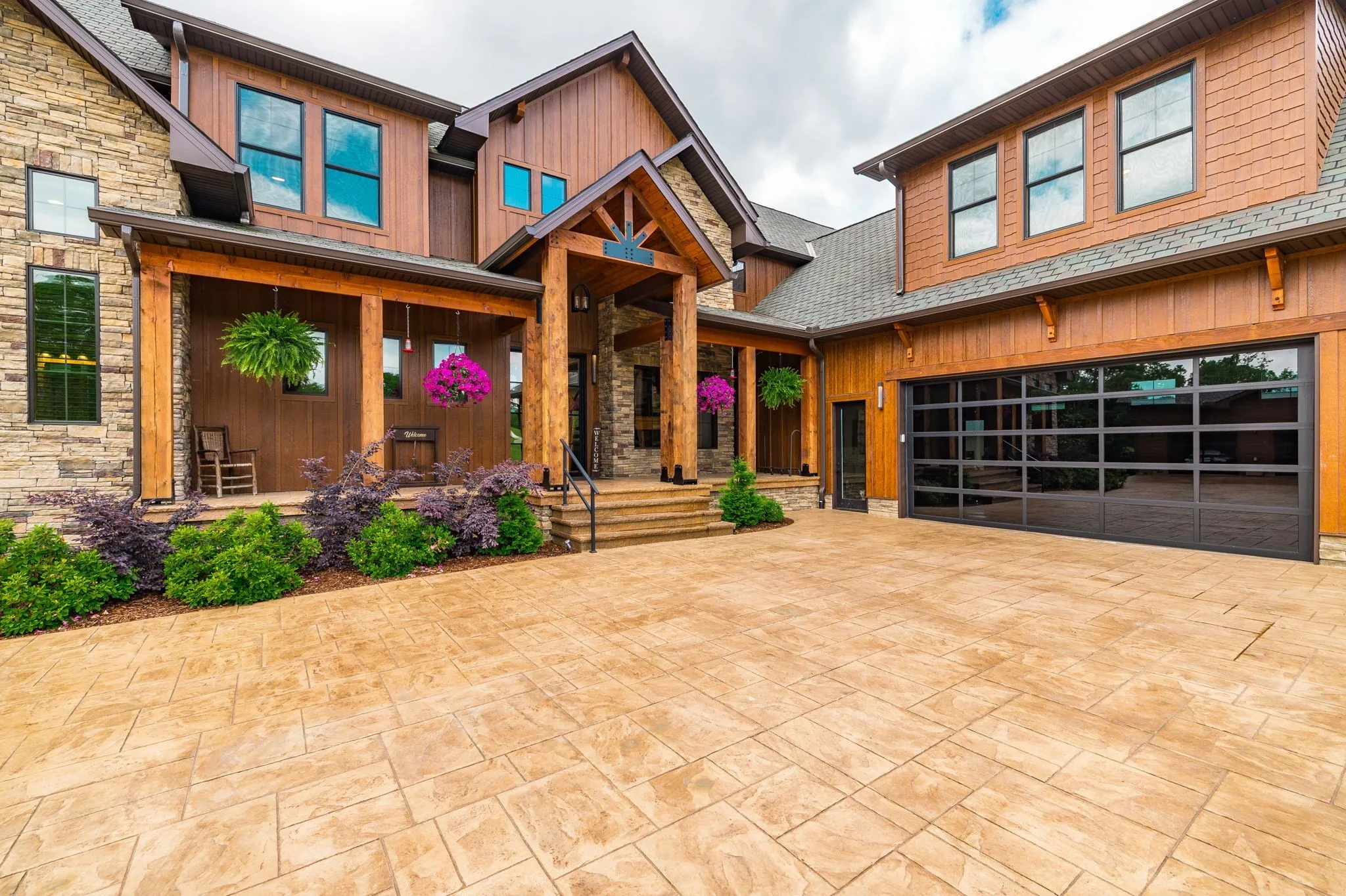 Outdoor features: heated/cooled automated pool, travertine deck, hot tub, screened porch, and TimberTech decking. Exterior includes Diamond Kote siding, stone, architectural shingles, metal roof, and stamped concrete.