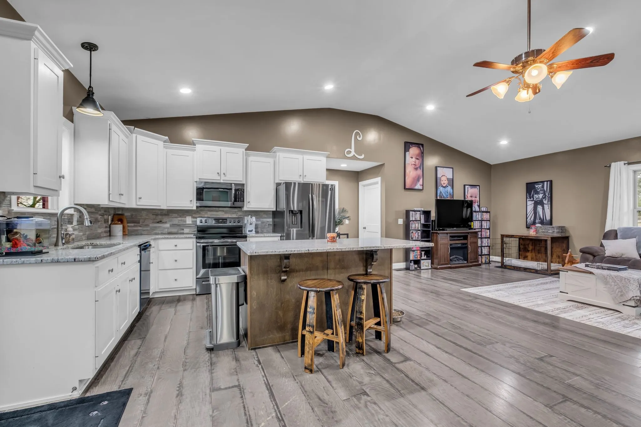 From the moment you enter, you’re greeted by soaring ceilings and a light-filled, open-concept design that reflects both elegance and comfort. Rich luxury vinyl plank flooring flows seamlessly throughout the main living spaces, complemented by a refined kitchen featuring stainless steel appliances, gleaming granite countertops and generous workspace for entertaining.