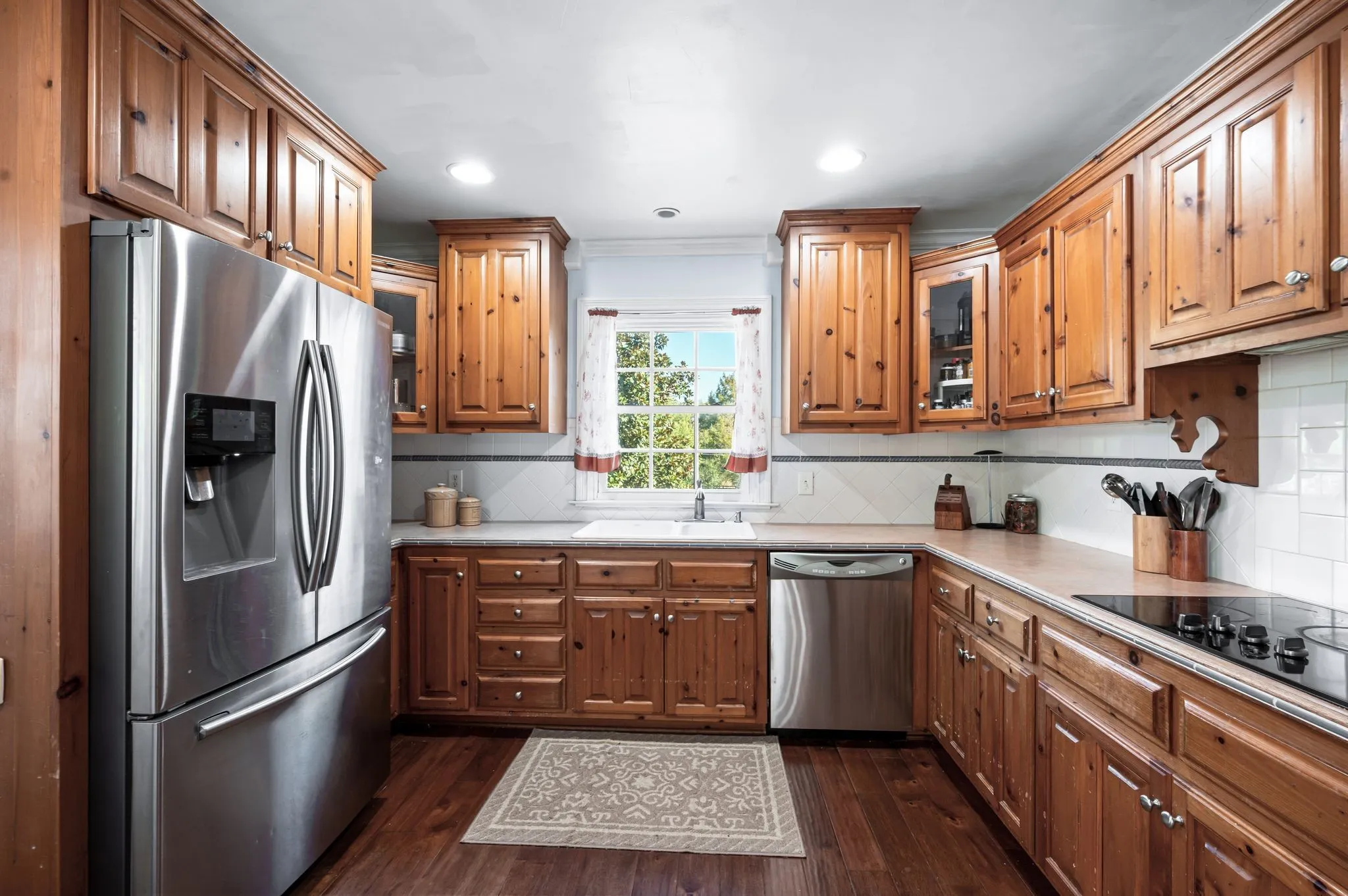 Interior finishes blend warmth and sophistication, with ceramic wood-look flooring in the kitchen and solid oak floors throughout the main level.
