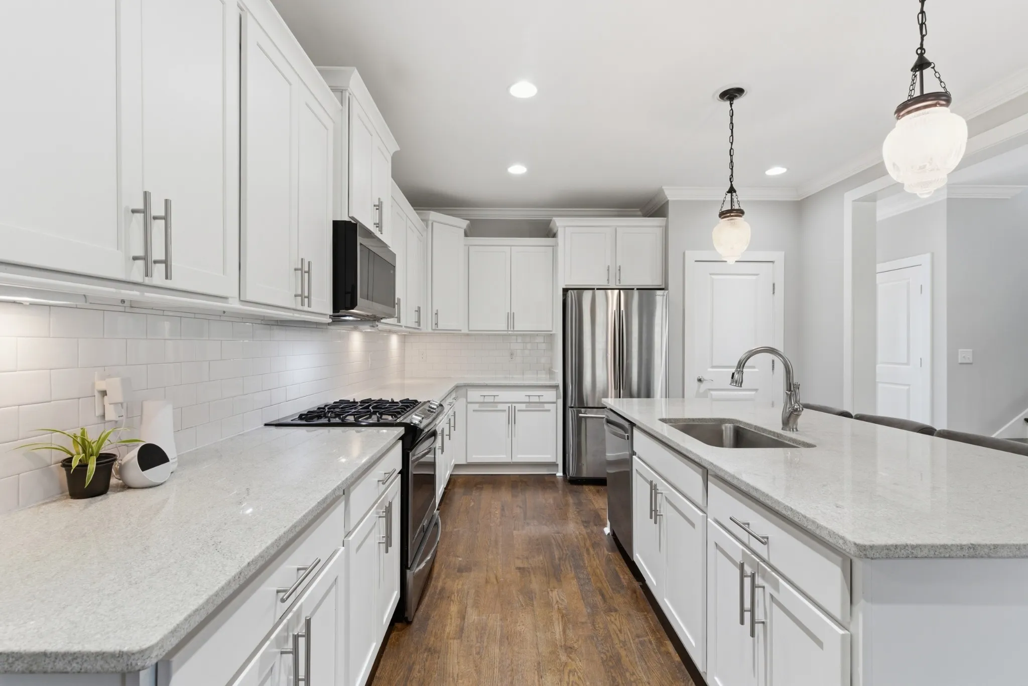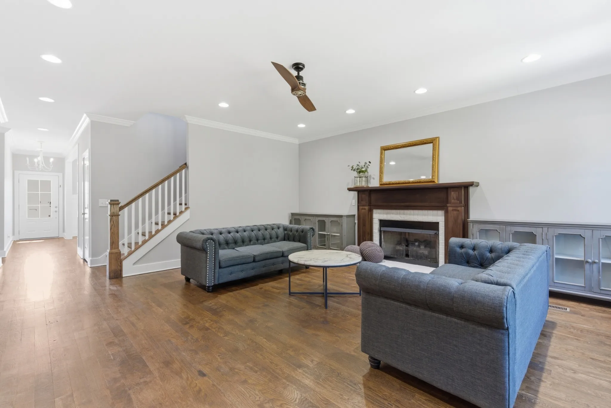 Step inside to find abundant natural light, fresh paint in most rooms, cozy gas fireplace, and a thoughtful layout designed for both relaxing and entertaining. The main level features natural hardwood & engineered wood flooring with no carpet, custom built-in plantation shutters, and a spacious living area that flows seamlessly into the kitchen, complete with quartz countertops and generous storage. Multiple walk-in closets — including custom closet system in the MBR to ensure everything is organized and elevated.