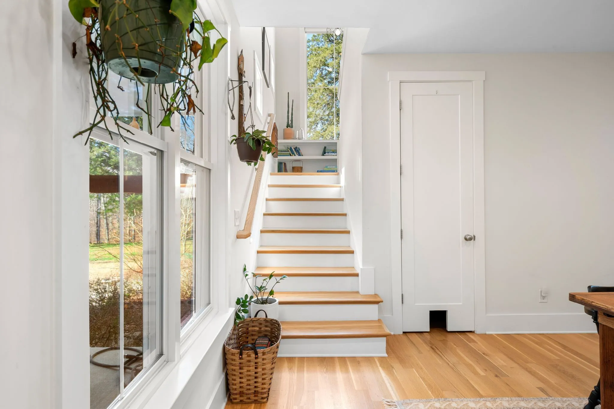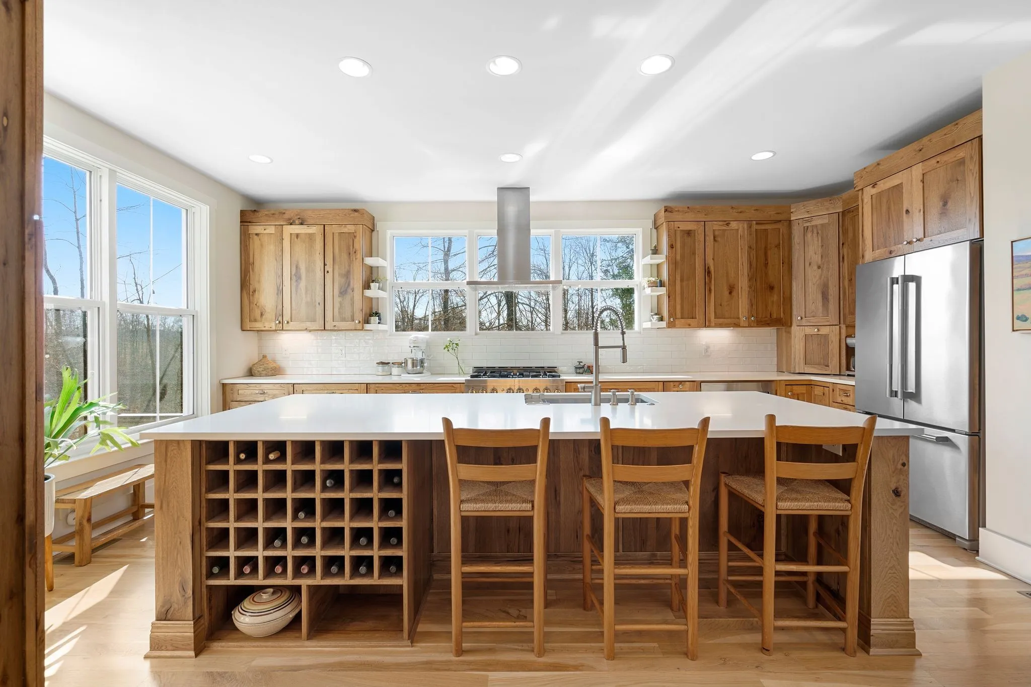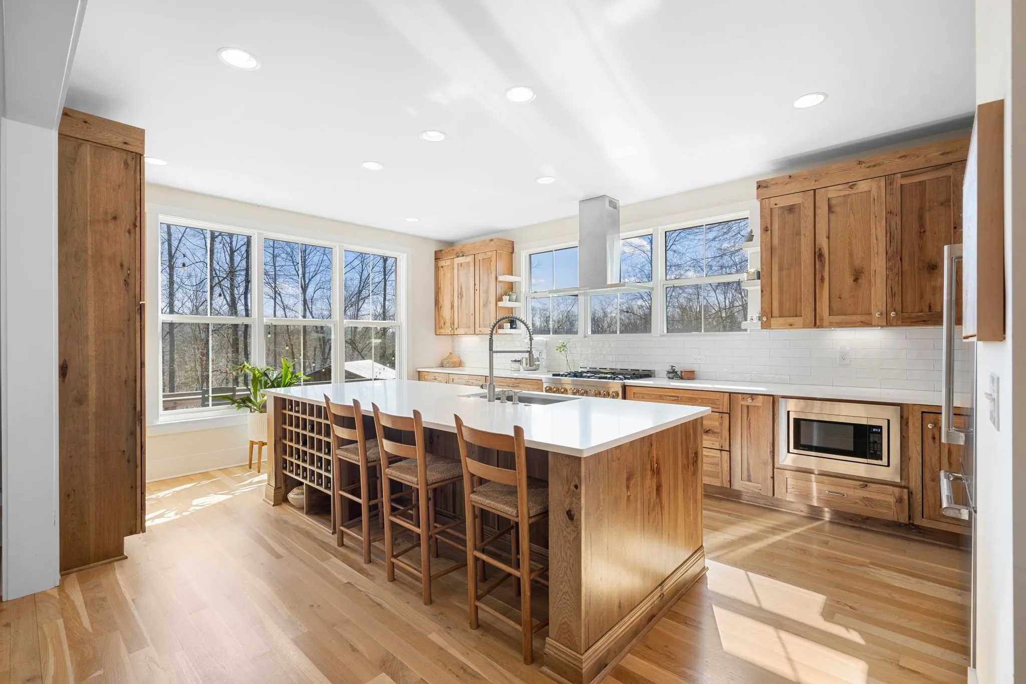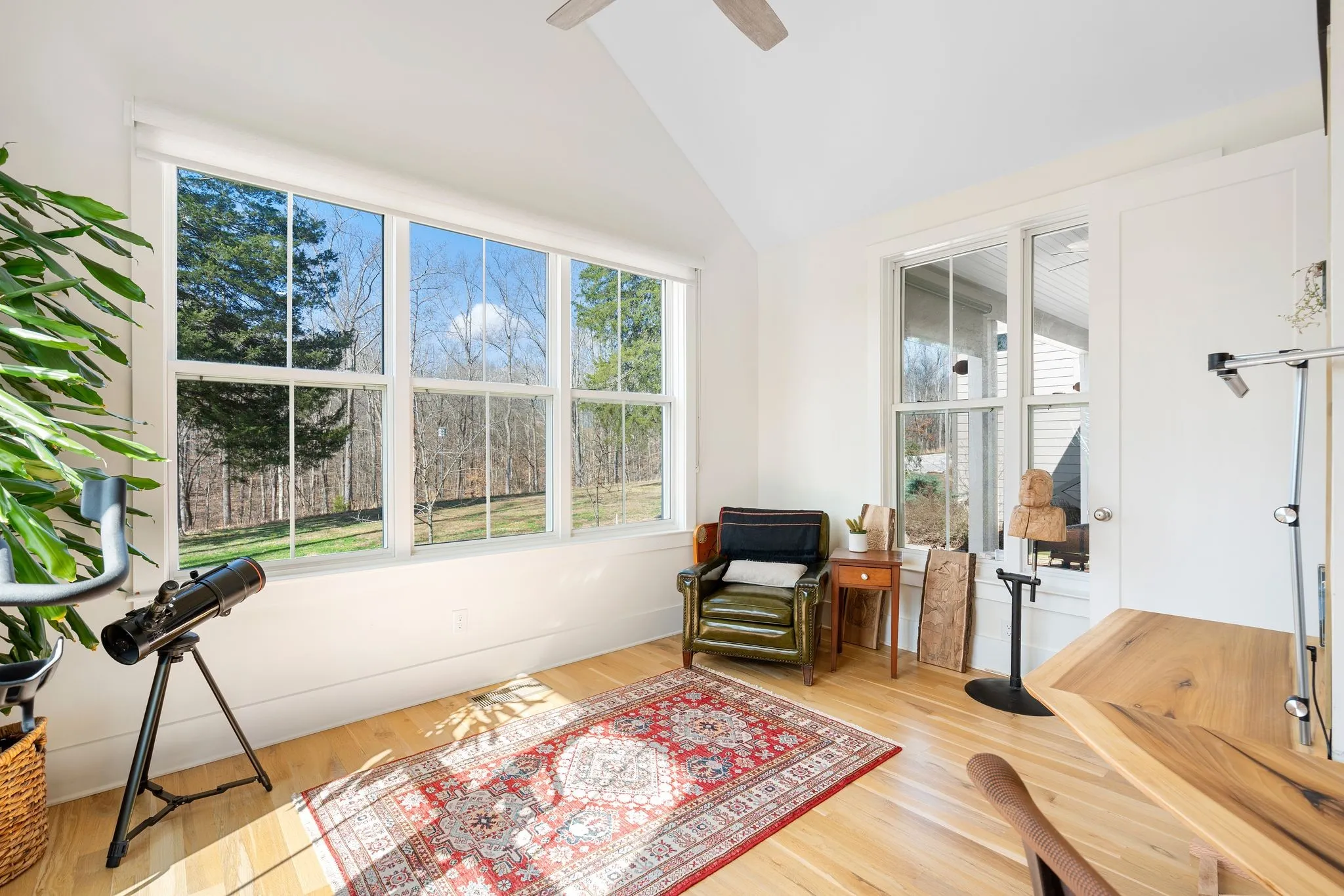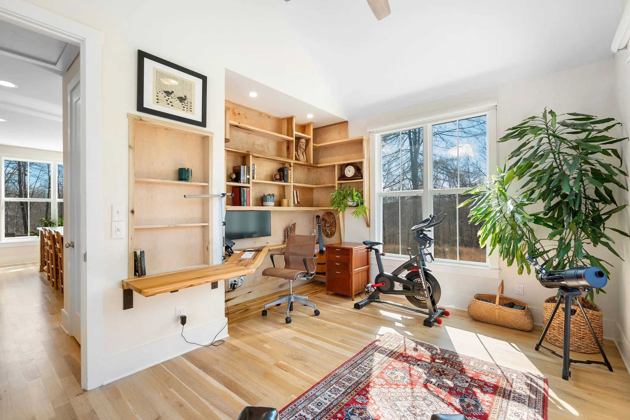 Inside, a bright, open kitchen with hickory cabinetry flows into the dining and living areas, ideal for gathering and entertaining. The primary suite features corner windows, a spa-style bath with soaking tub and separate shower, and a walk-in closet with custom built-ins. A guest bedroom with its own bath is also on the main level. Upstairs, there are two spacious bedrooms, a shared bath, and a comfortable common area. Large windows throughout and an architecturally distinctive clerestory fill the main living and dining spaces with natural light. White oak hardwood floors run throughout the main level, with carpet in the upstairs bedrooms. A dedicated office includes custom wood shelving and a built-in desk, plus a downstairs gathering room ideal for an additional office, school, or reading space.