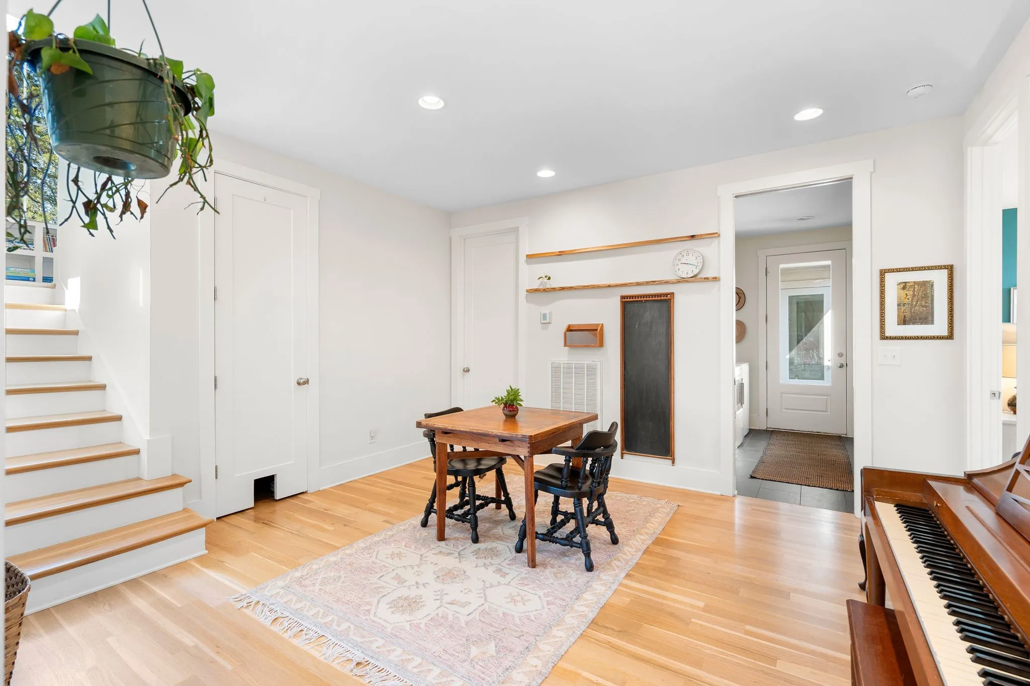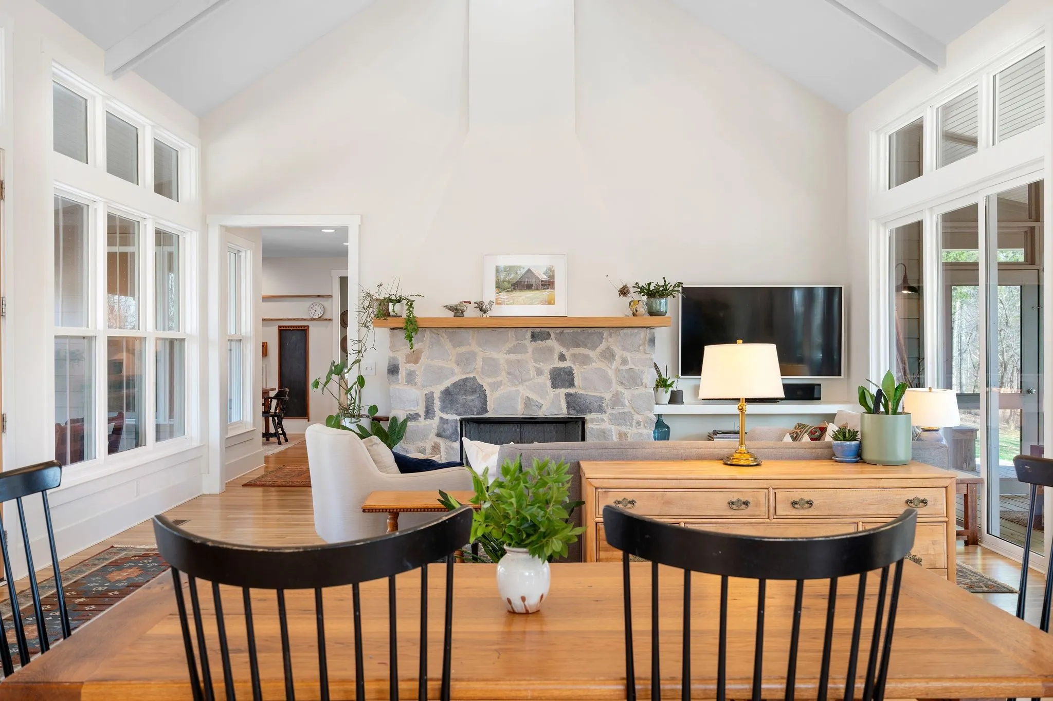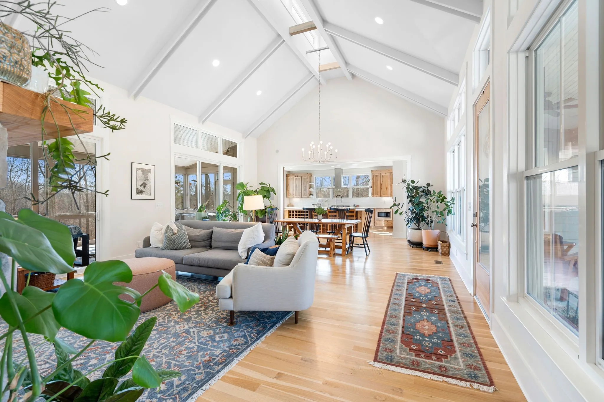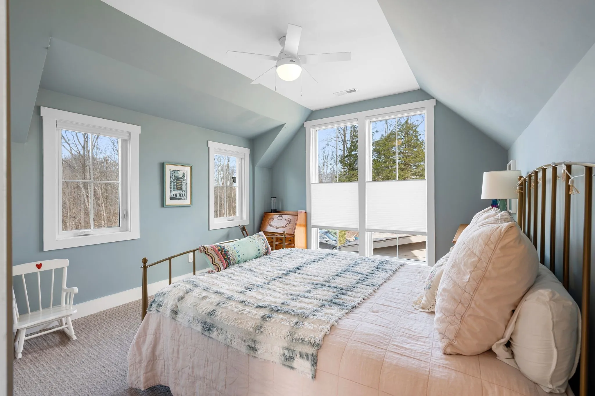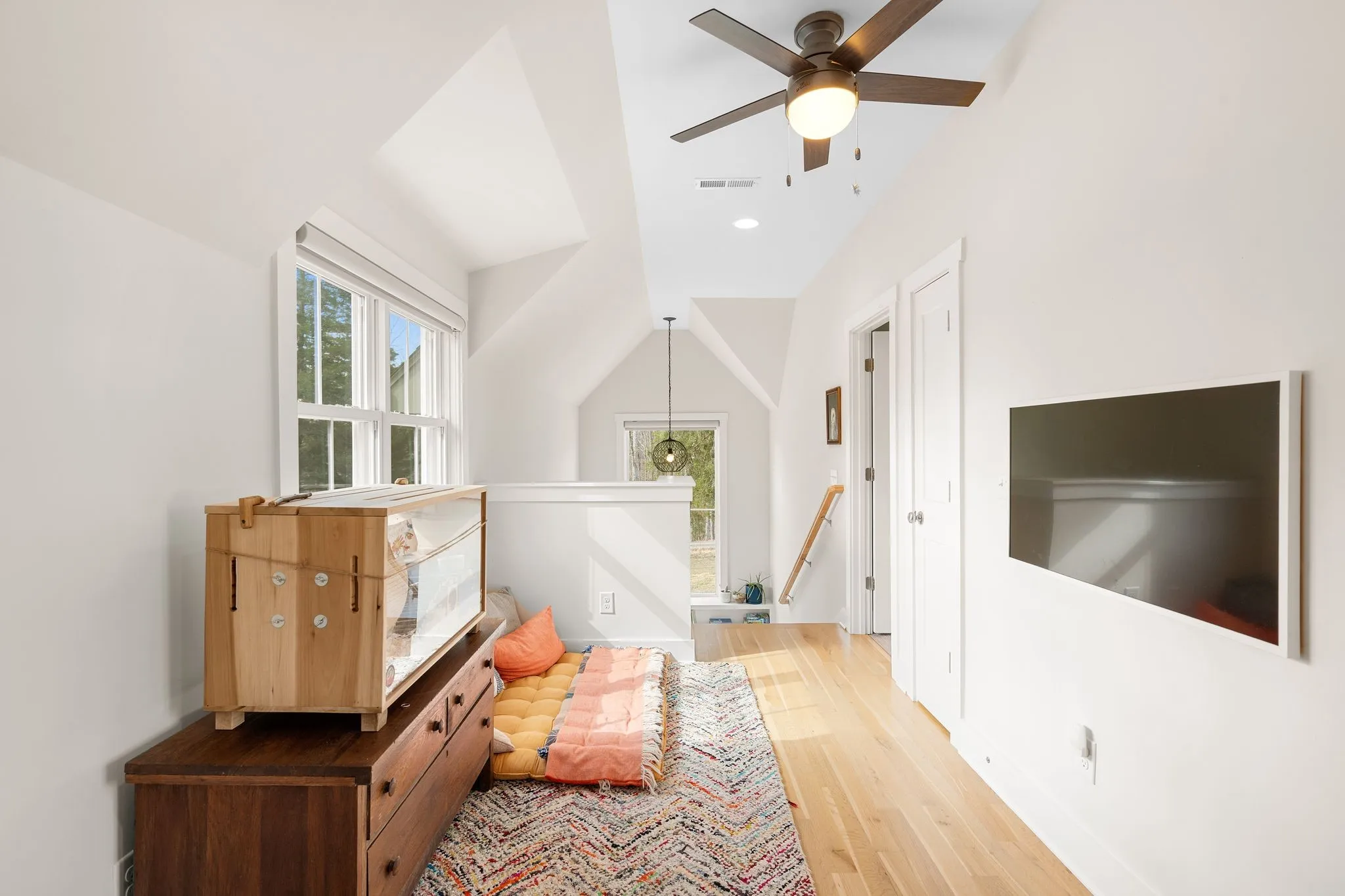 Inside, a bright, open kitchen with hickory cabinetry flows into the dining and living areas, ideal for gathering and entertaining. The primary suite features corner windows, a spa-style bath with soaking tub and separate shower, and a walk-in closet with custom built-ins. A guest bedroom with its own bath is also on the main level. Upstairs, there are two spacious bedrooms, a shared bath, and a comfortable common area. Large windows throughout and an architecturally distinctive clerestory fill the main living and dining spaces with natural light. White oak hardwood floors run throughout the main level, with carpet in the upstairs bedrooms. A dedicated office includes custom wood shelving and a built-in desk, plus a downstairs gathering room ideal for an additional office, school, or reading space.