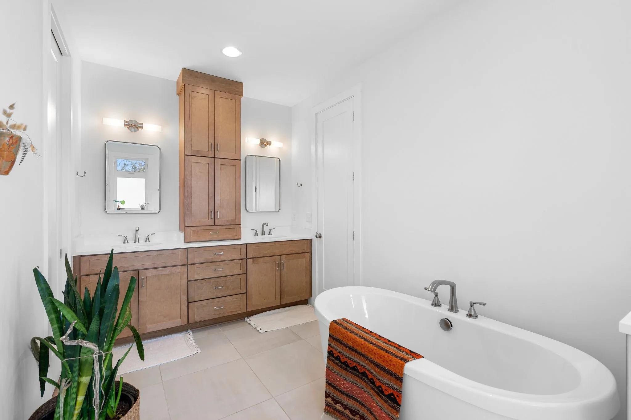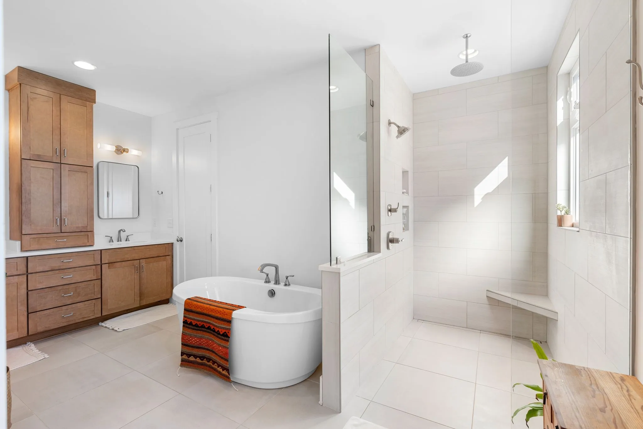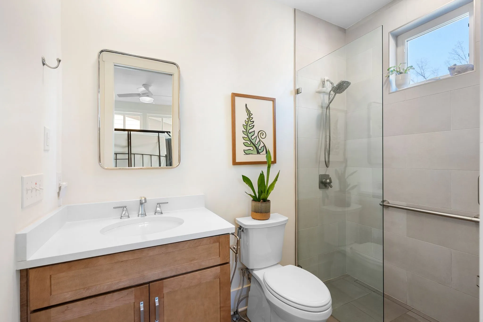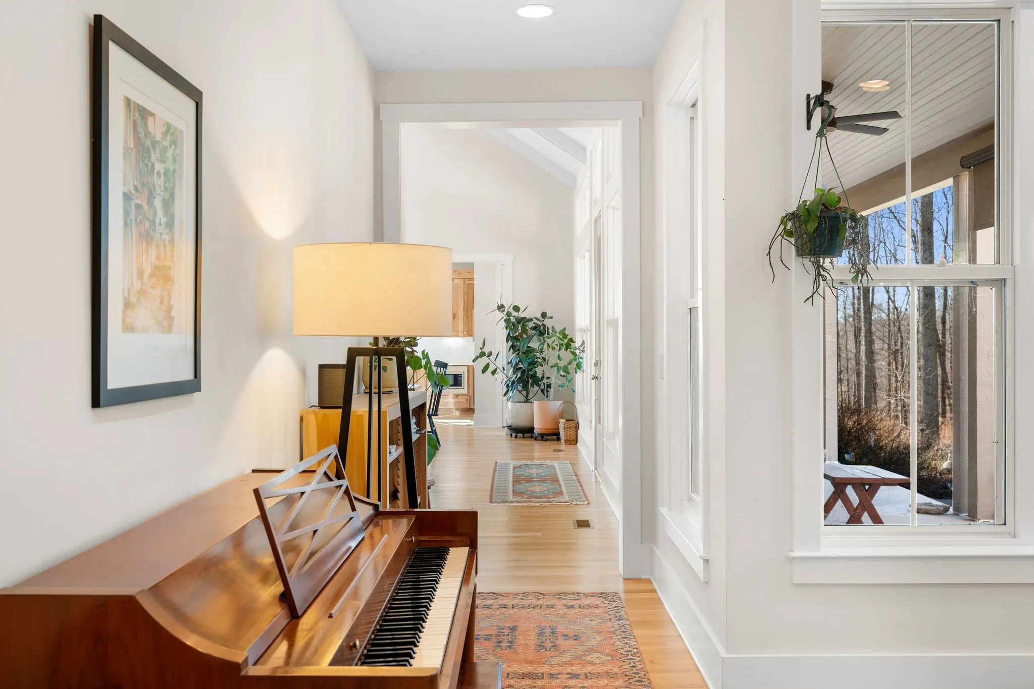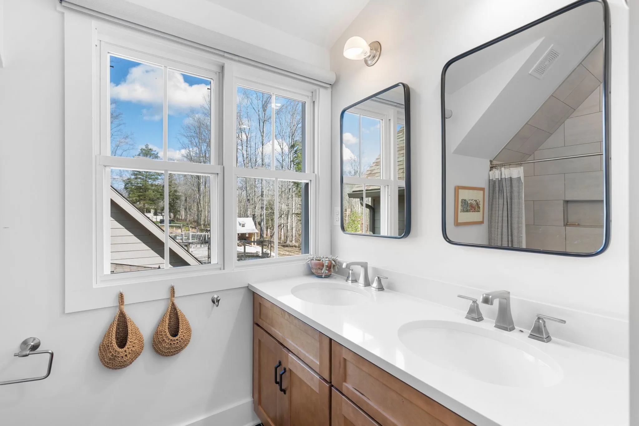 Inside, a bright, open kitchen with hickory cabinetry flows into the dining and living areas, ideal for gathering and entertaining. The primary suite features corner windows, a spa-style bath with soaking tub and separate shower, and a walk-in closet with custom built-ins. A guest bedroom with its own bath is also on the main level. Upstairs, there are two spacious bedrooms, a shared bath, and a comfortable common area. Large windows throughout and an architecturally distinctive clerestory fill the main living and dining spaces with natural light. White oak hardwood floors run throughout the main level, with carpet in the upstairs bedrooms. A dedicated office includes custom wood shelving and a built-in desk, plus a downstairs gathering room ideal for an additional office, school, or reading space.