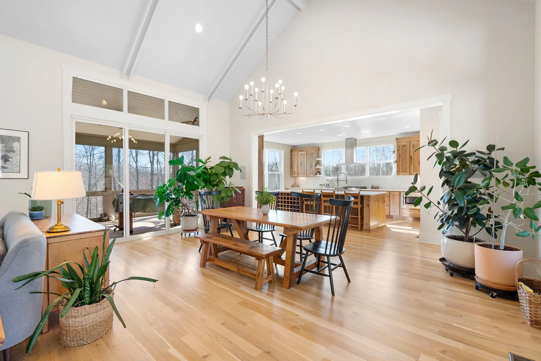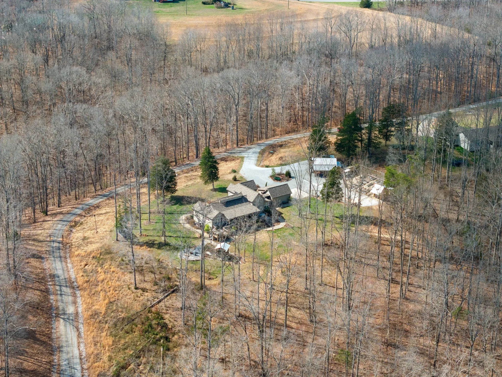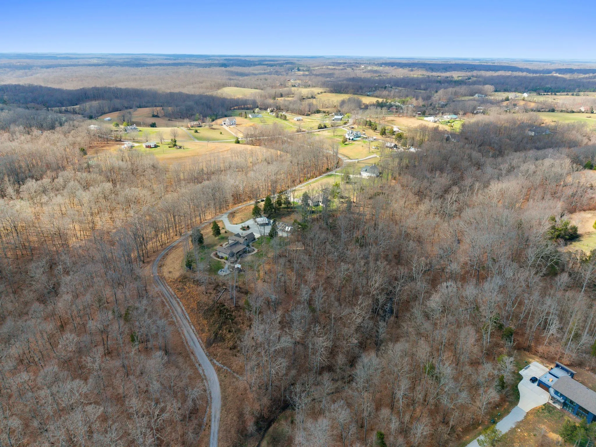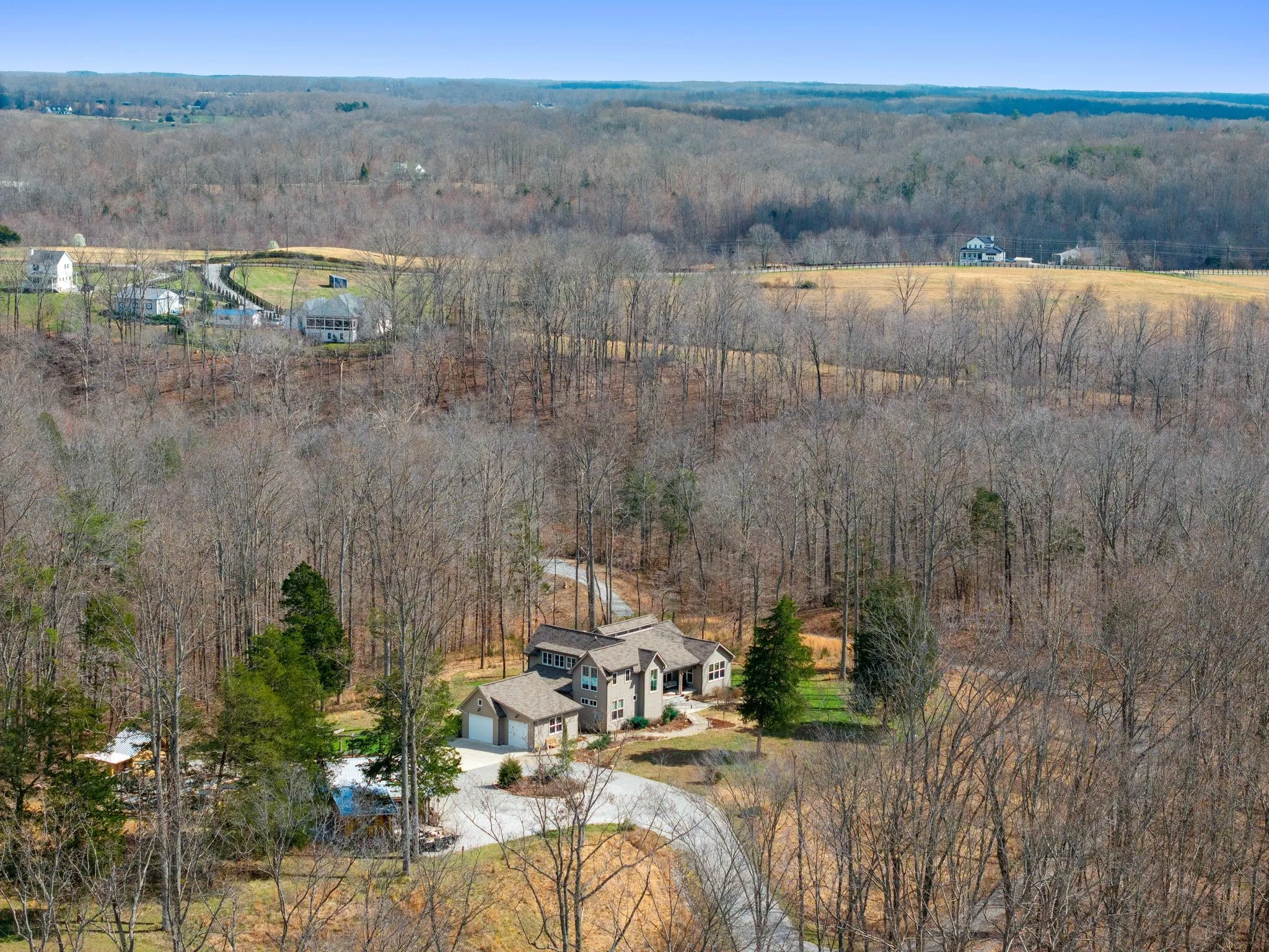 Gorgeous custom Perch Plan modern farmhouse on 5 private acres at the end of a quiet dead-end road in the picturesque farmland of Williamson County. Perched atop a serene ridge and surrounded by forest and native prairie, the grounds are thoughtfully landscaped with native trees, grasses, and wildflowers, creating a setting that feels both intentional and effortlessly natural.