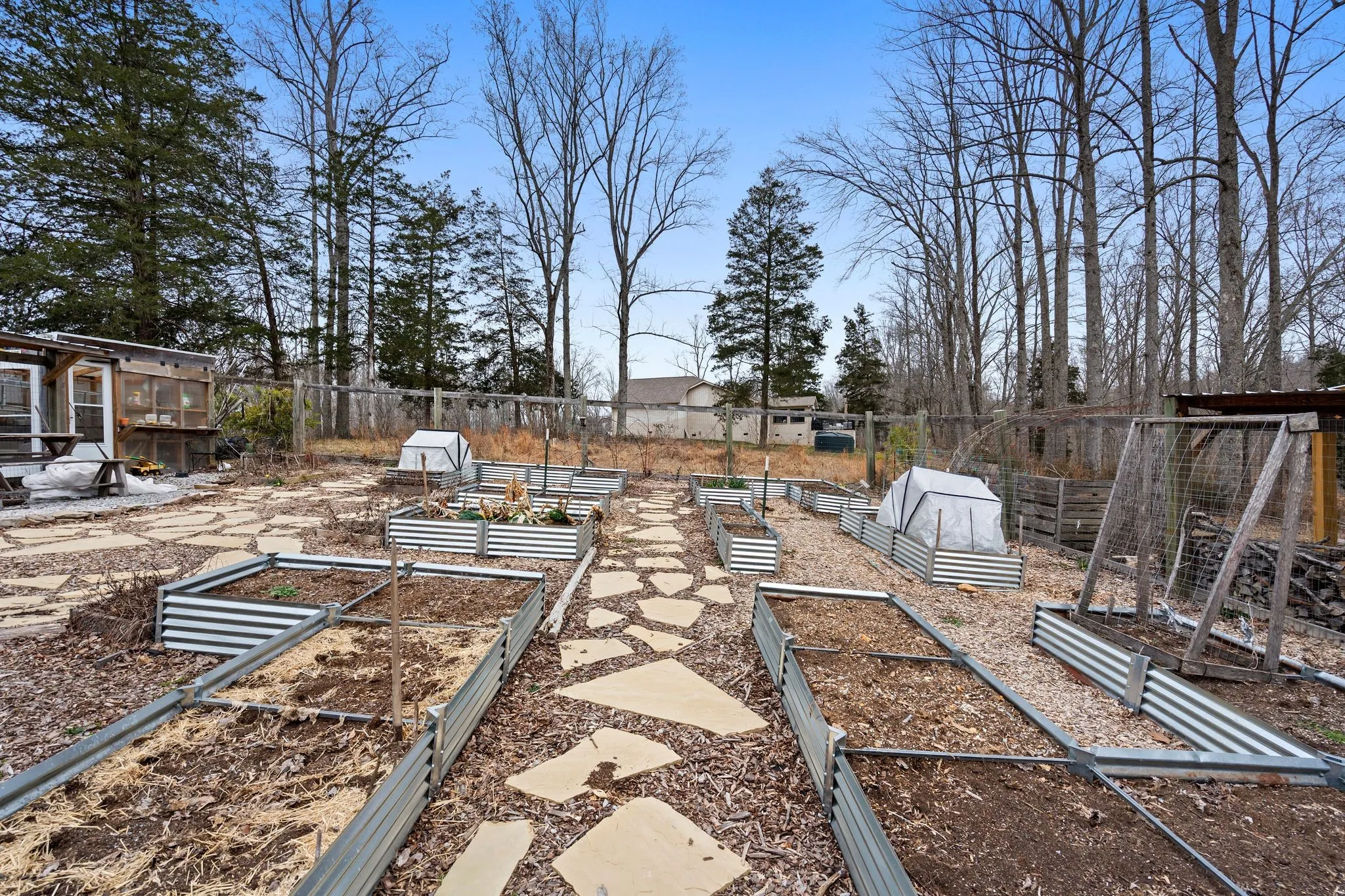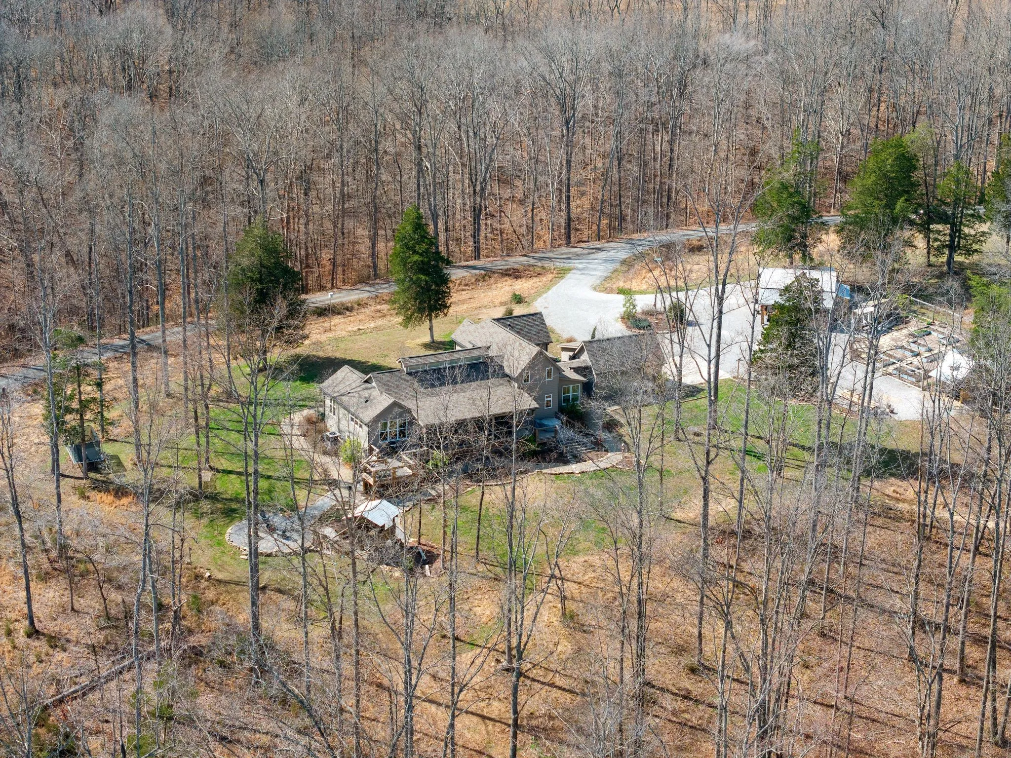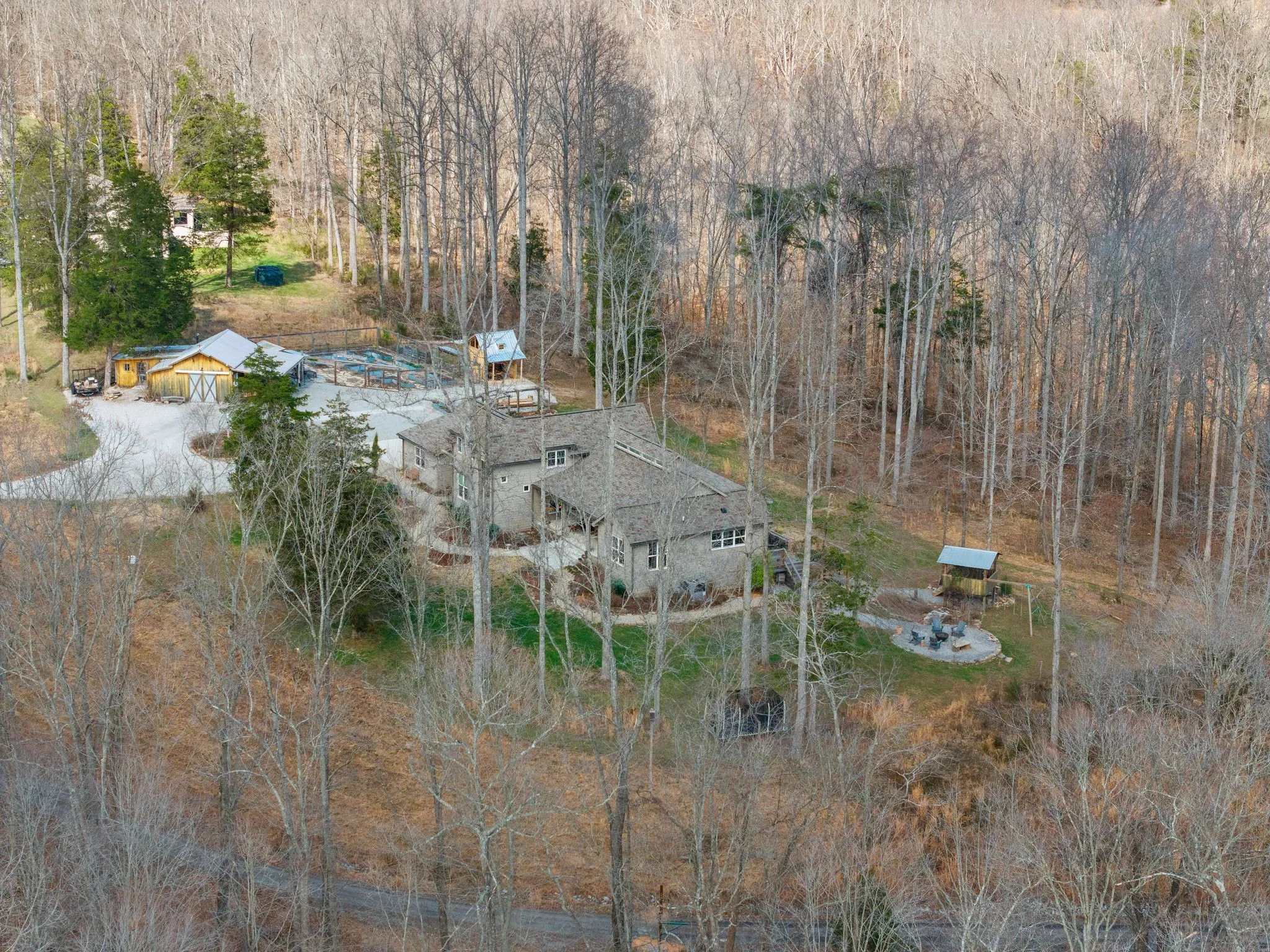 The property includes a fenced garden with raised beds, a greenhouse, a grape arbor, an herb garden, fruit trees, and berry bushes. A wooden barn with attached workshop provides extra parking and storage, plus an RV hookup. A whimsical treehouse and firepit complete the retreat. Trails (wide enough for a UTV) lead to a year-round spring-fed creek, where a newer deck overlooks the water. Well water with whole-house filtration. A true nature lover’s paradise and a must-see.