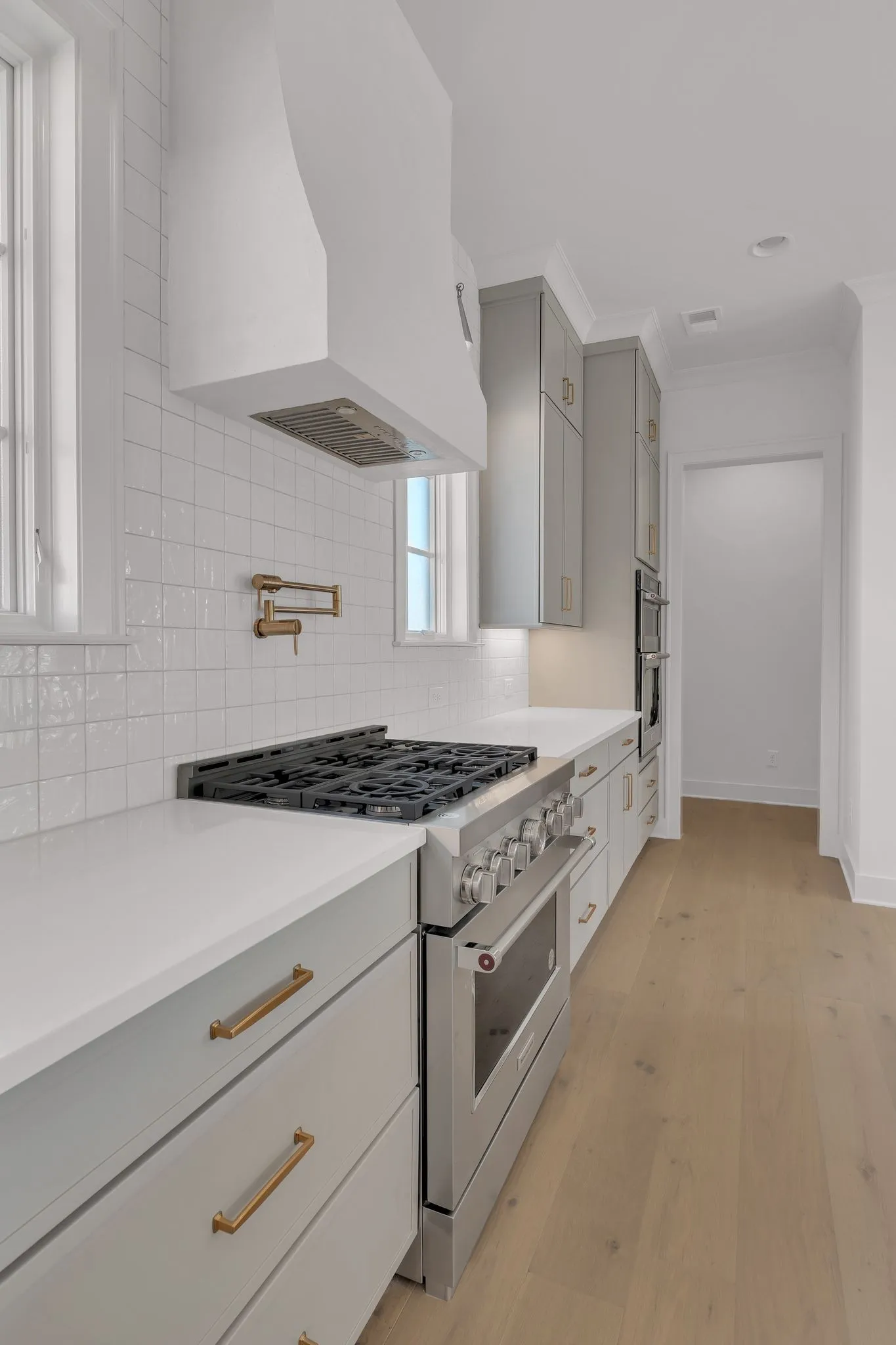 At the heart of the home, the fully equipped chef’s kitchen is designed to impress, featuring stainless KitchenAid appliances, a six-burner gas range, second electric wall oven, and a built-in microwave that also functions as a convection oven. A French door refrigerator/freezer completes the space. An oversized pantry with upper and lower cabinetry, abundant shelving, and a second refrigerator provides exceptional storage and functionality.