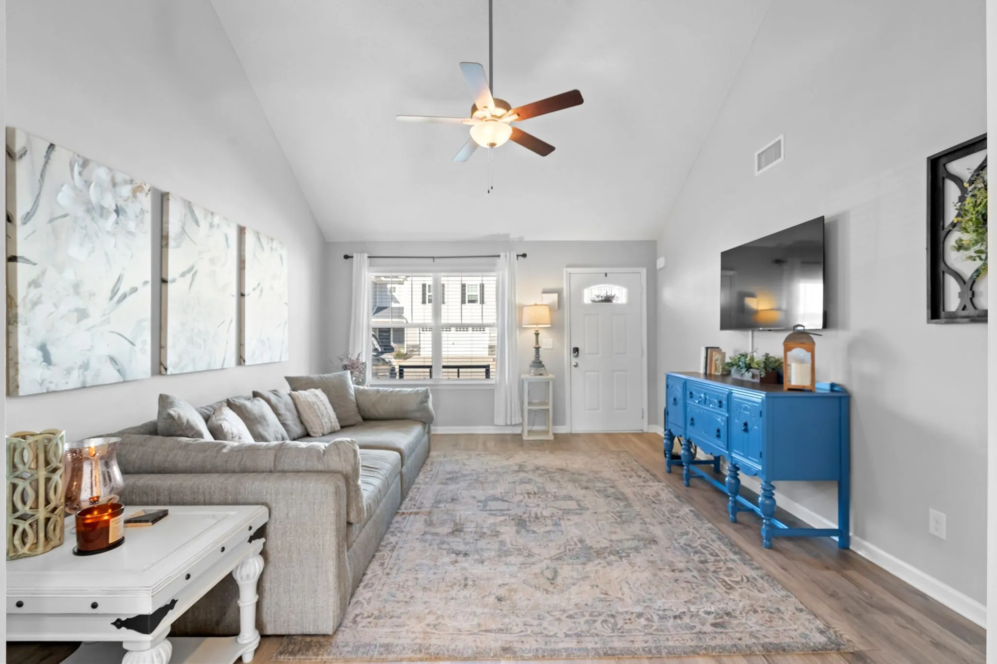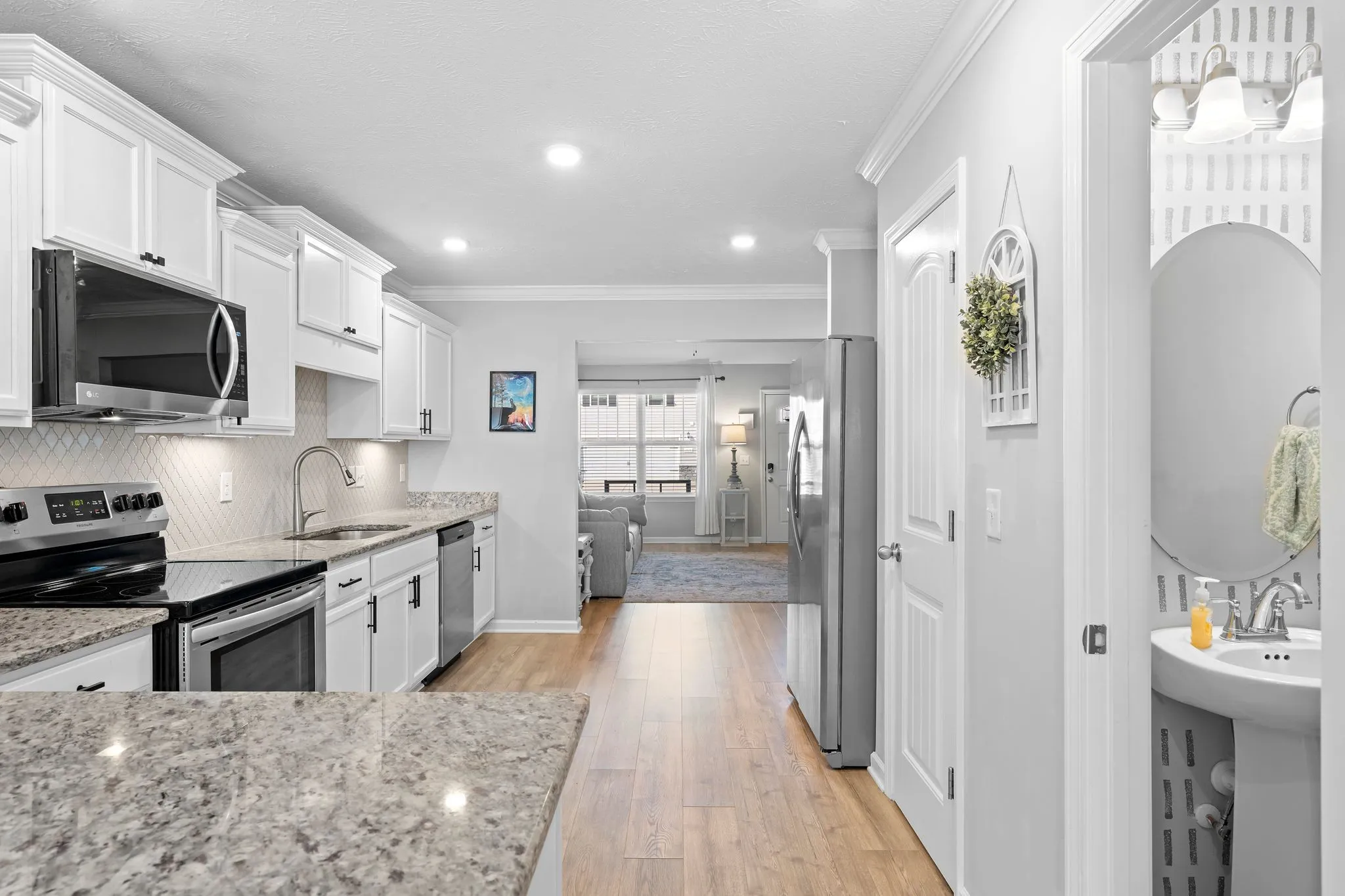Welcome to this beautifully maintained 2-bedroom, 2.5 bath home featuring a welcoming covered front porch. The spacious living room offers a vaulted ceiling and opens to the dining area and kitchen with white cabinetry, granite countertops, tile backsplash, and stainless steel appliances. A granite breakfast bar overlooks the bright dining space with access to the rear patio, perfect for relaxing or entertaining.