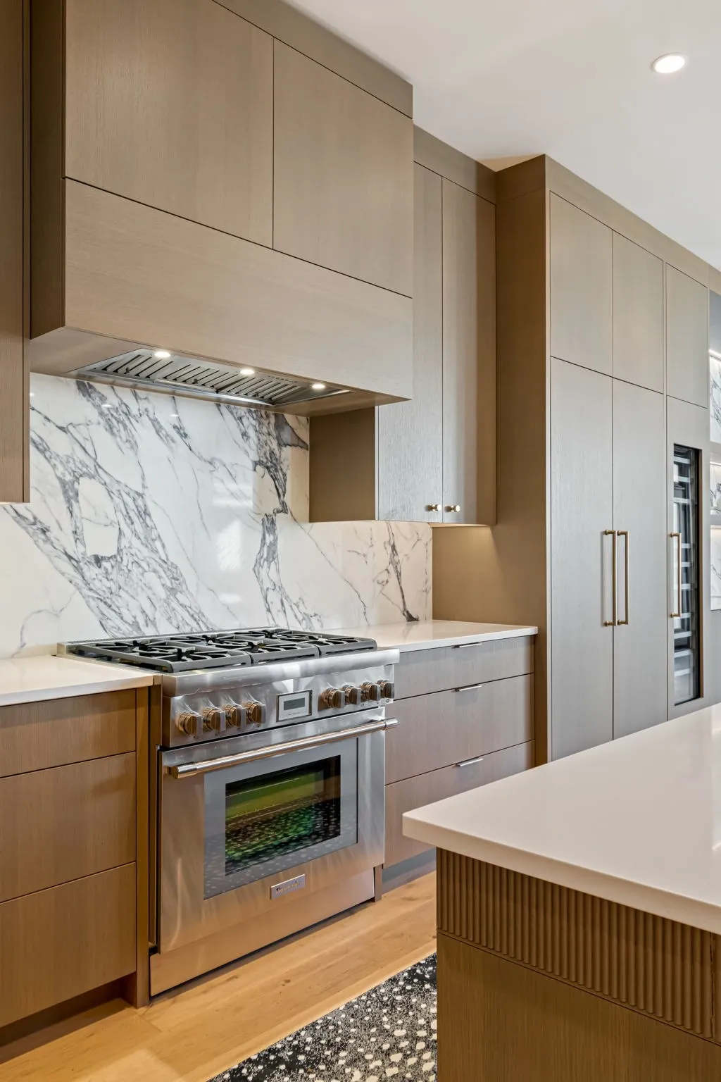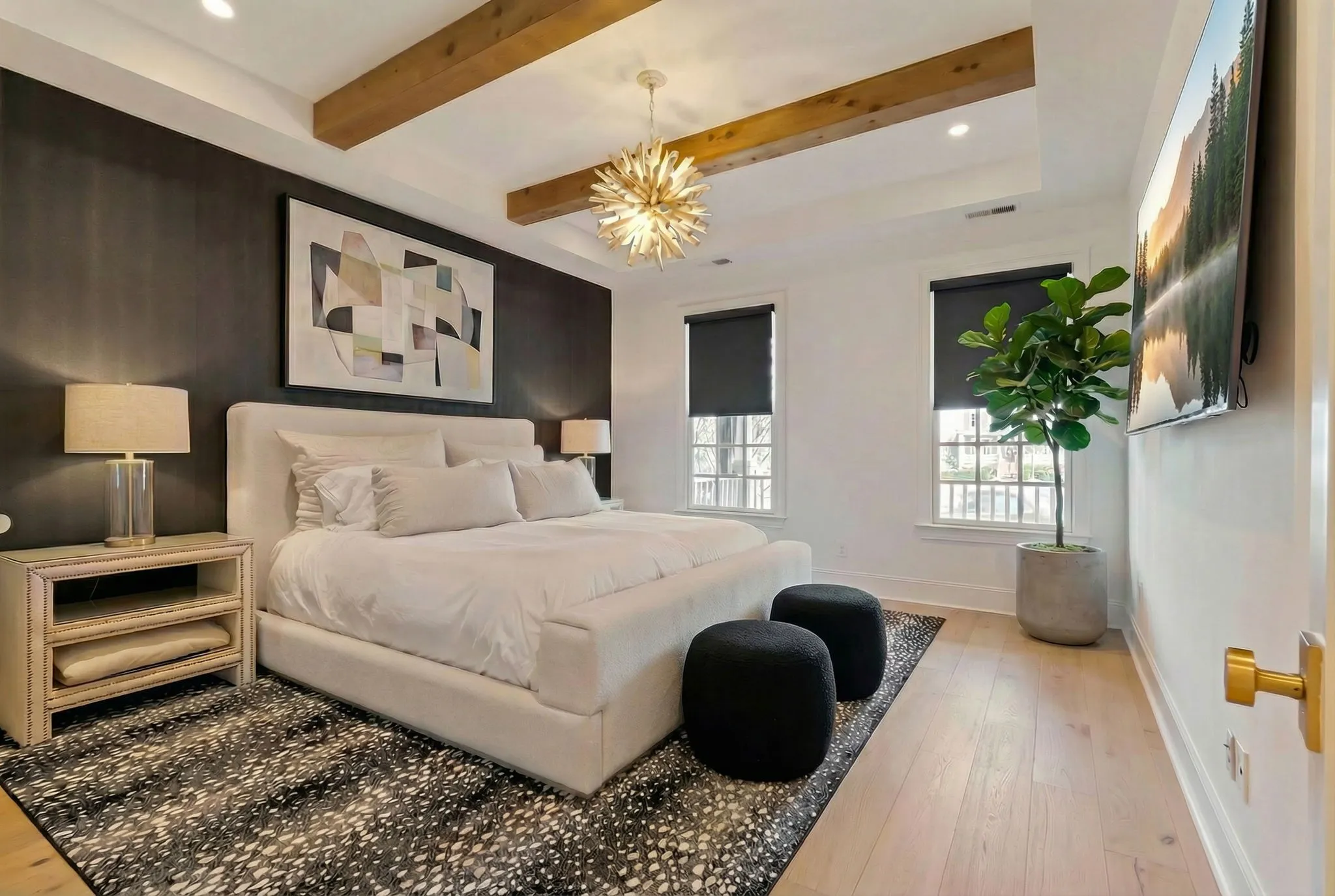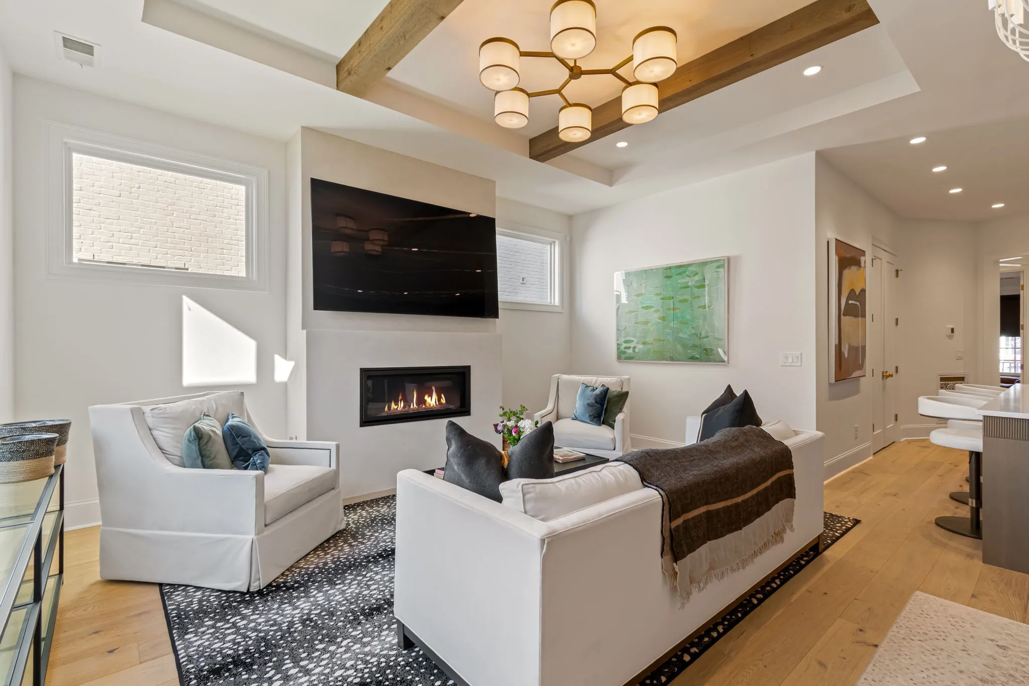 Prime corner Westhaven brownstone—fully rebuilt from the studs with impeccable attention to detail and designer finishes for the most discerning buyer. Flooded with natural light and facing protected green space with tranquil wildlife views, this home is a calm, elegant retreat just walkable to town, the clubhouse and school. A chef’s dream: custom 10′ floor-to-ceiling rift-sawn oak kitchen and bar cabinetry by Nashville’s top luxury cabinetmaker, 8″ European oak floors throughout, Thermador built-ins (24″ refrigerator & freezer, 24″ dual-temperature wine fridge, 36″ 6-burner gas range with oven, dishwasher, built-in microwave), and an oversized 10′ island with reeded detailing that seats four. A bespoke dual-door pantry and abundant storage keep entertaining effortless. The home has been fully rewired and upgraded with new outlets, switches and temperature-controlled 4″ recessed LED lighting. Signature fixtures from Visual Comfort, Arteriors and Currey & Company, custom wood beams, and a sleek linear fireplace framed in white plaster set a warm, modern tone. Full window treatments in all rooms with motorized roller shades in main living area and main bedrooms. The primary suite is a spa sanctuary with marble floors and counters, an oversized shower with ROHL fixtures, a linen closet and an expansive 10′ floor-to-ceiling California Closet. Upstairs: three bedrooms and two full baths; one bedroom transformed into a luxe dressing room with custom California Closet, vanity and desk, plus a versatile bonus room. Outdoors: new GOAT turf with a putting green, integrated new outdoor lighting, and full surveillance front and back with alarm system. New roof, new exterior paint, new tankless water heater, finished garage with abundant storage and polyaspartic coated flooring. Meticulous, move-in ready, and thoughtfully appointed—too many luxury details to list. Truly a low maintenance, lock & leave property!
