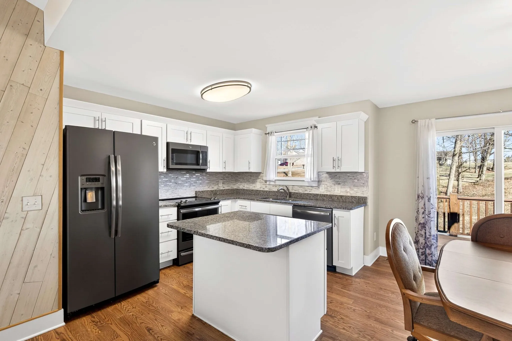 A one-level home offers a functional, easy-to-maintain layout with wood flooring in the main living areas and carpeted bedrooms for added warmth. The kitchen features granite countertops, stainless steel GE appliances, electric range, side-by-side refrigerator, and disposal, designed for practical daily use and entertaining alike. The laundry room includes an LG stainless front-loading washer and dryer, plus built-in shelving.