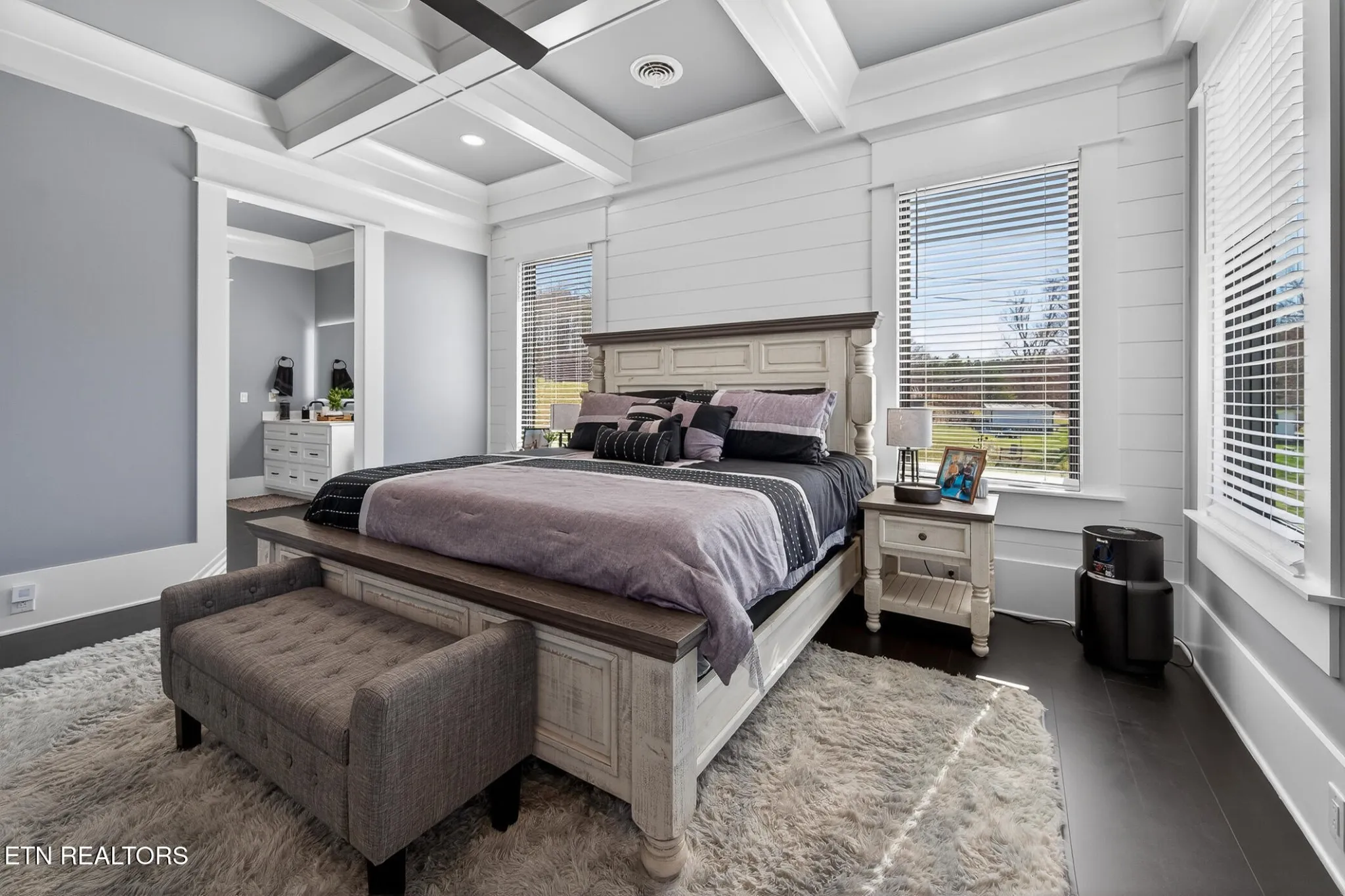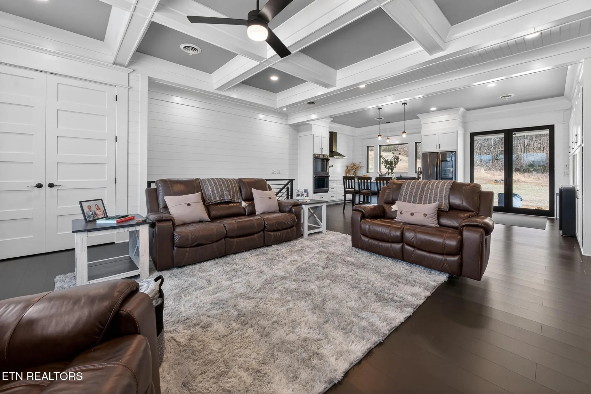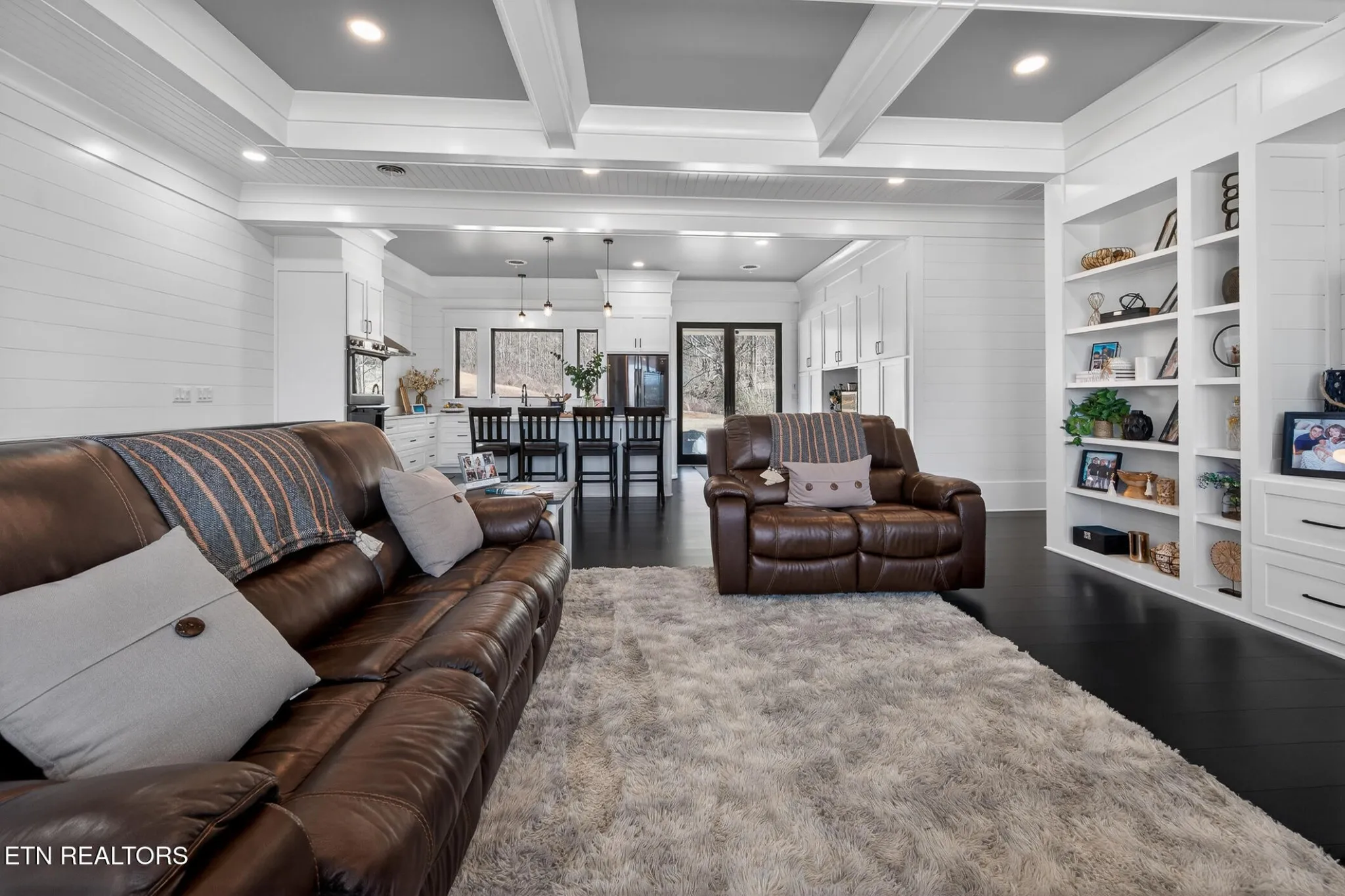 Stunning modern move-in ready home in Morristown — 2 bed, 3 bath on a full acre. Thoughtfully designed and built with durability in mind (5/8” fire-rated Sheetrock), this home blends clean contemporary finishes with practical features for everyday living. The main level showcases dark luxury vinyl plank flooring and dramatic 10-ft coffered ceilings in both the living room and primary suite. The chef-ready kitchen features crisp white cabinetry, white solid surface countertops, dark high-end stainless appliances, double built-in ovens, range hood, and a convenient coffee bar surrounded by cabinets, plus abundant storage throughout.