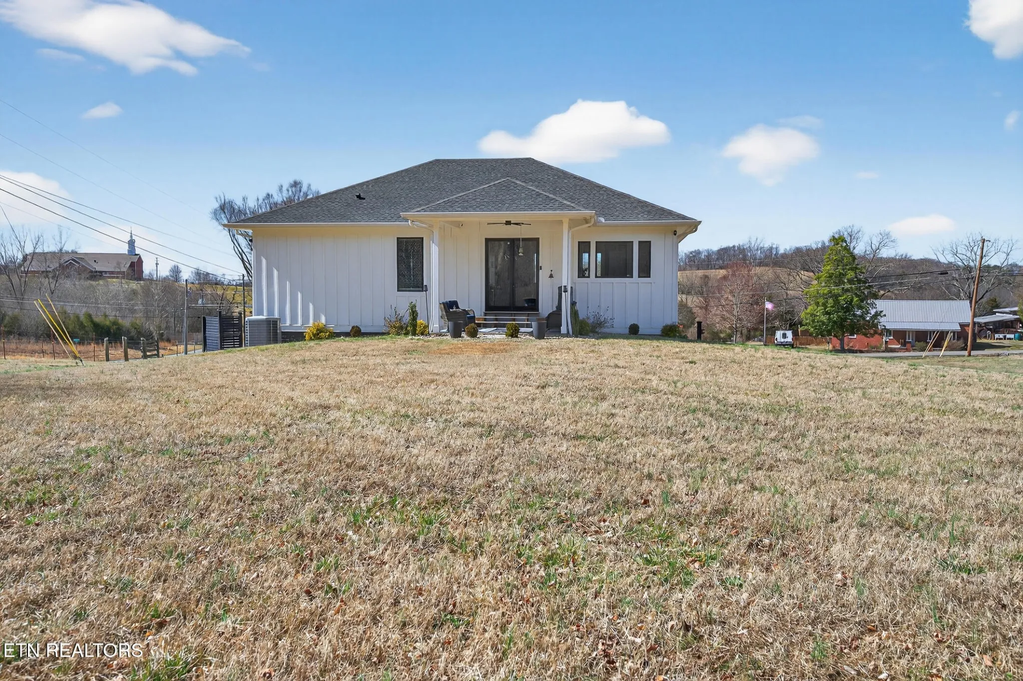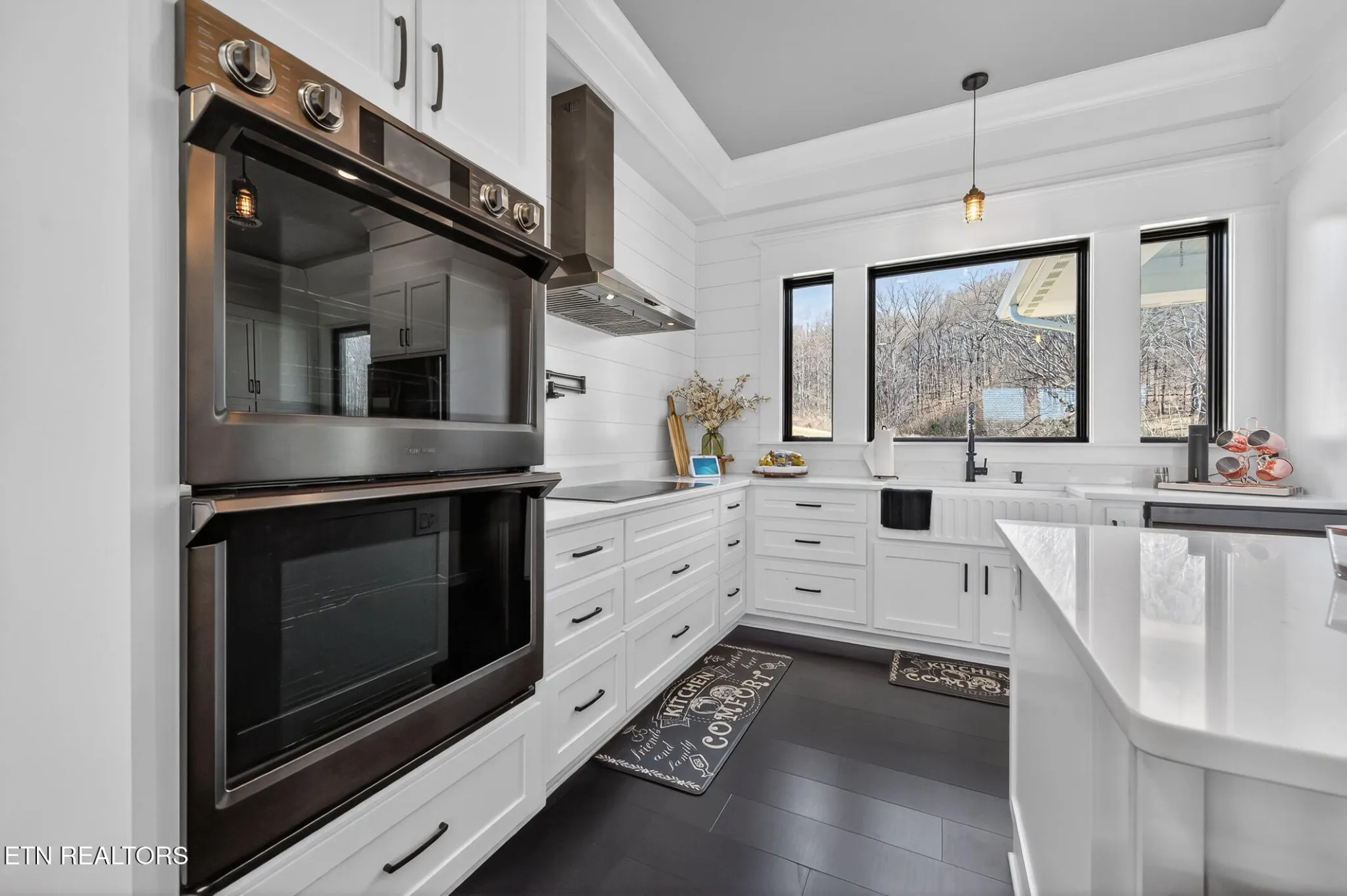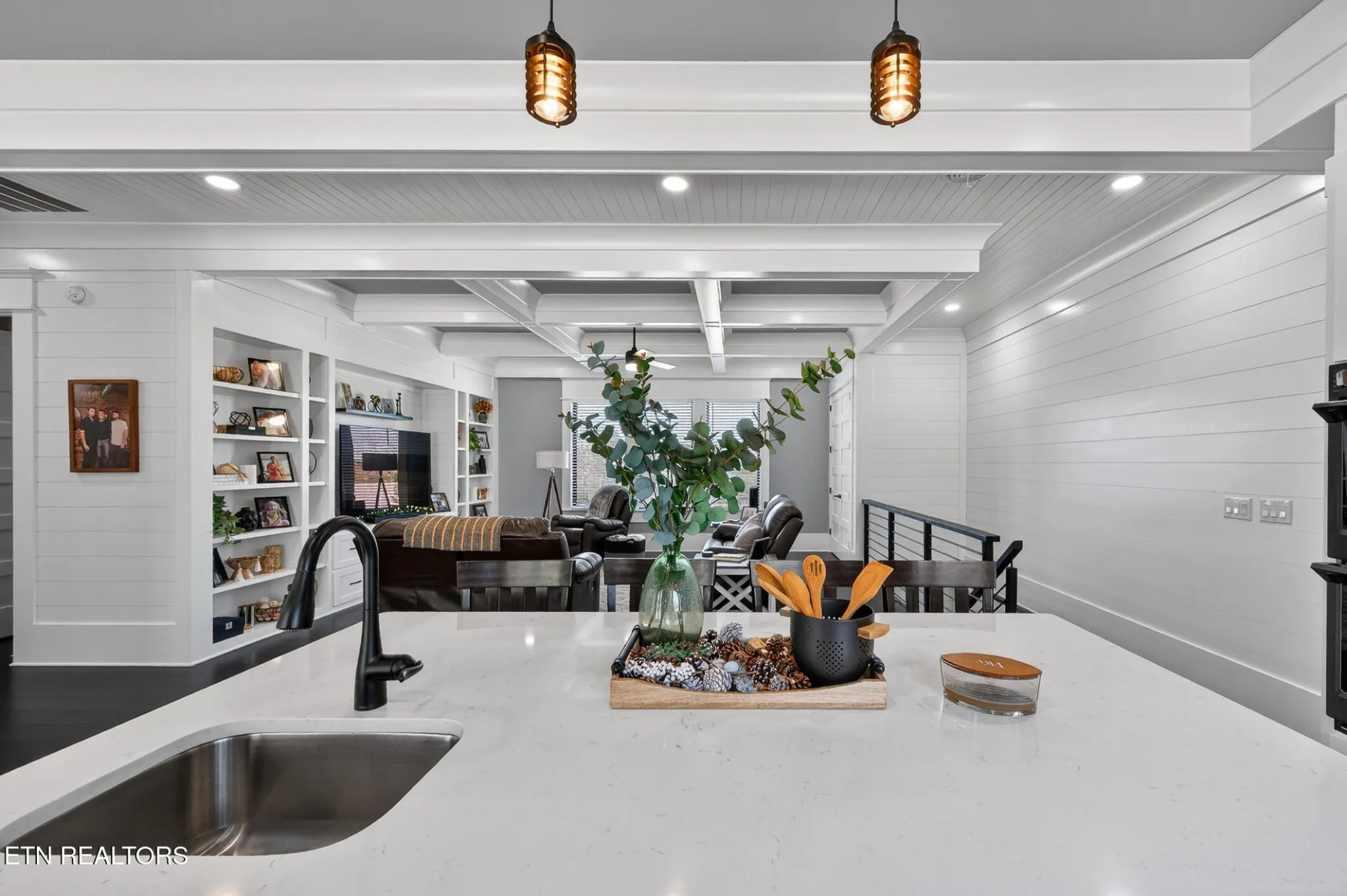 Stunning modern move-in ready home in Morristown — 2 bed, 3 bath on a full acre. Thoughtfully designed and built with durability in mind (5/8” fire-rated Sheetrock), this home blends clean contemporary finishes with practical features for everyday living. The main level showcases dark luxury vinyl plank flooring and dramatic 10-ft coffered ceilings in both the living room and primary suite. The chef-ready kitchen features crisp white cabinetry, white solid surface countertops, dark high-end stainless appliances, double built-in ovens, range hood, and a convenient coffee bar surrounded by cabinets, plus abundant storage throughout.