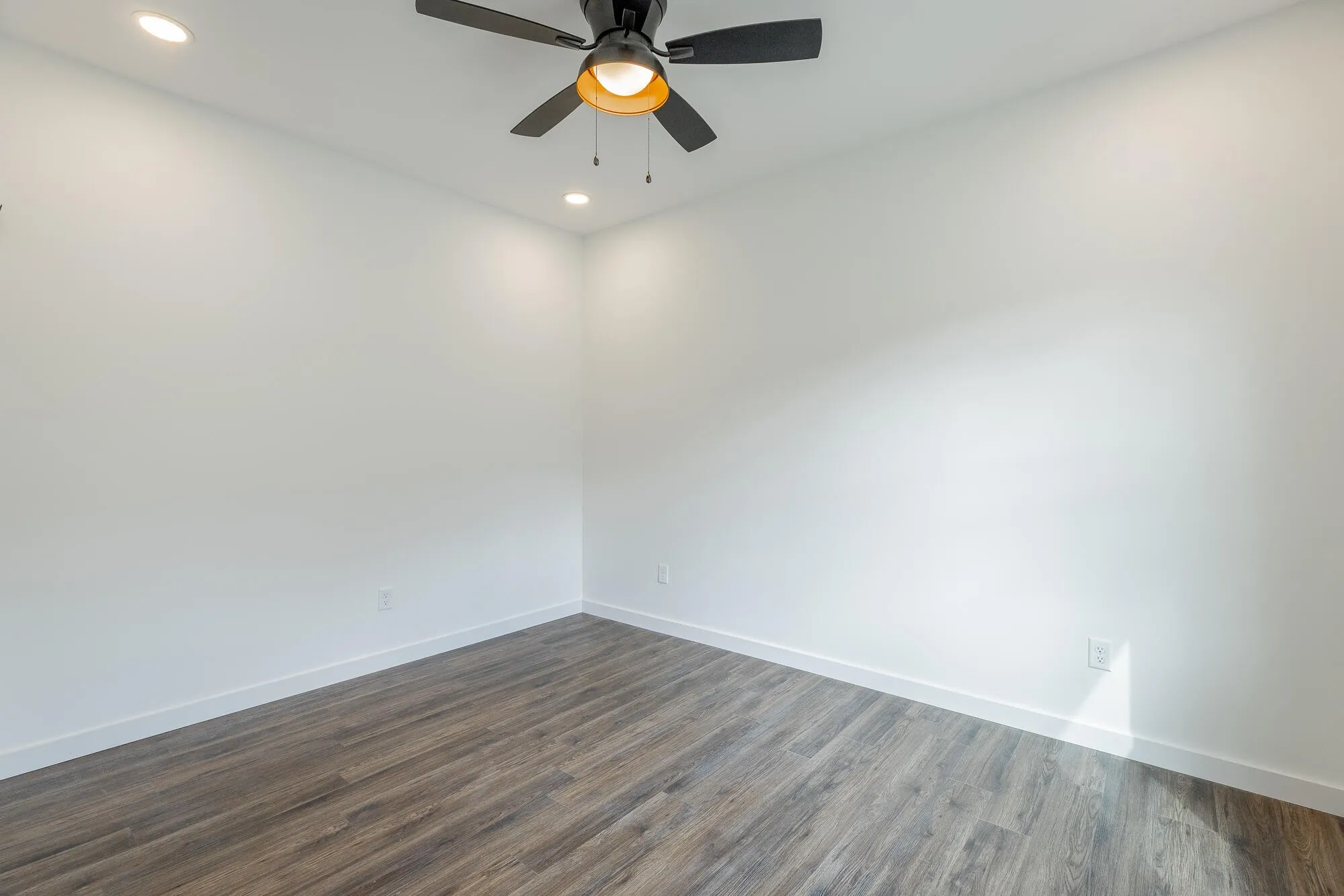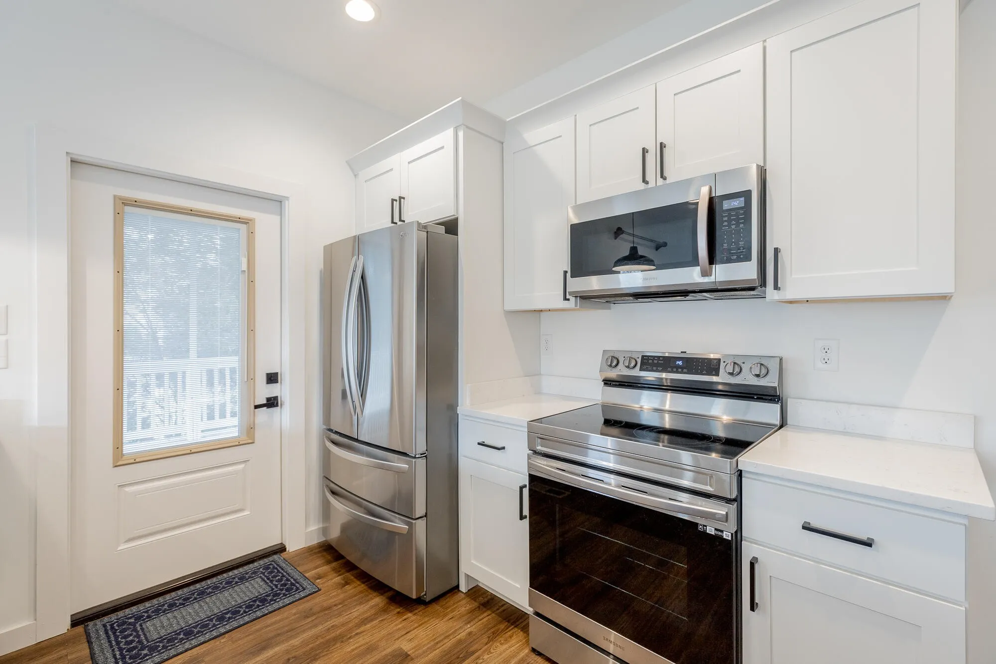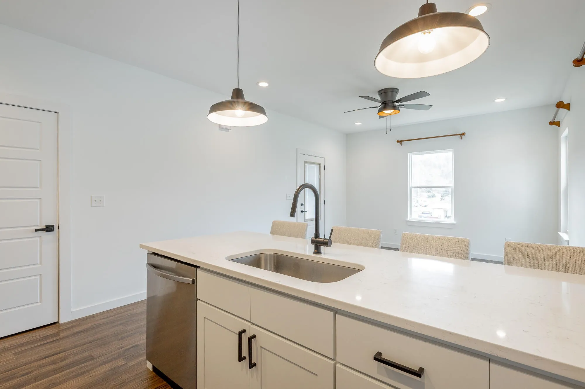 The kitchen overlooks the main living space and features quartz countertops and custom cabinetry, creating a functional and stylish heart of the home. Each bedroom is equipped with ceiling fans and additional recessed (canned) lighting, adding comfort and a thoughtful touch throughout.